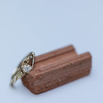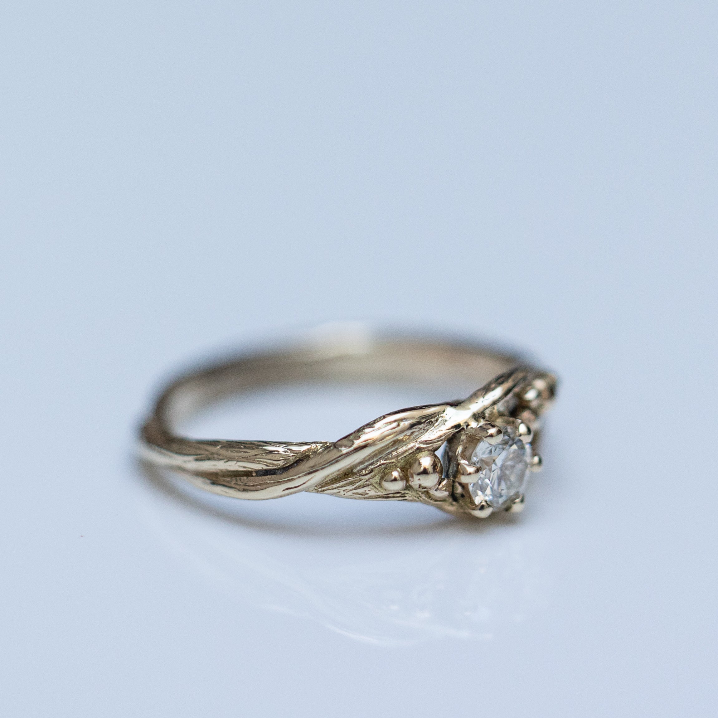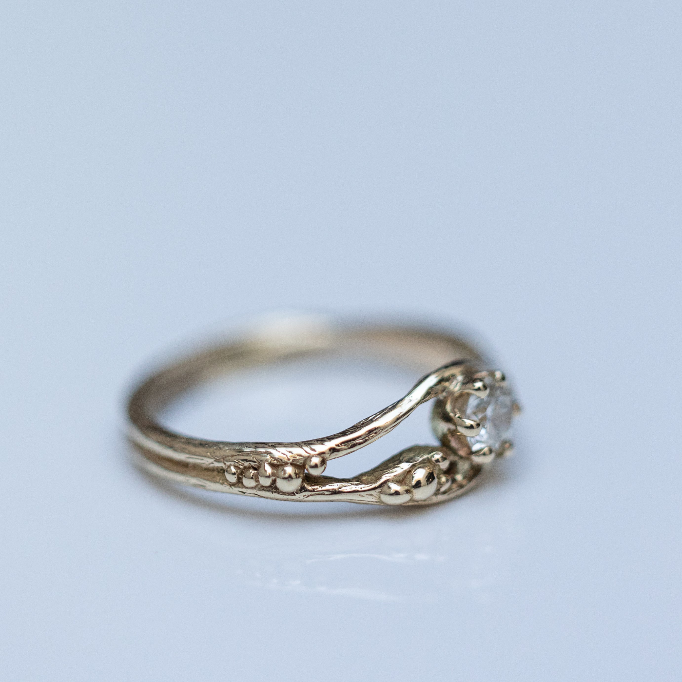 This unique 14K gold solitaire ring features two gently entwined branches adorned with tiny gold dots, resembling the beginnings of blooming fruits. It is set with a 0.20ct champagne diamond, making it a gentle and unconventional option for an engagement ring, characterized by its delicate details.