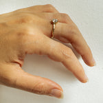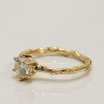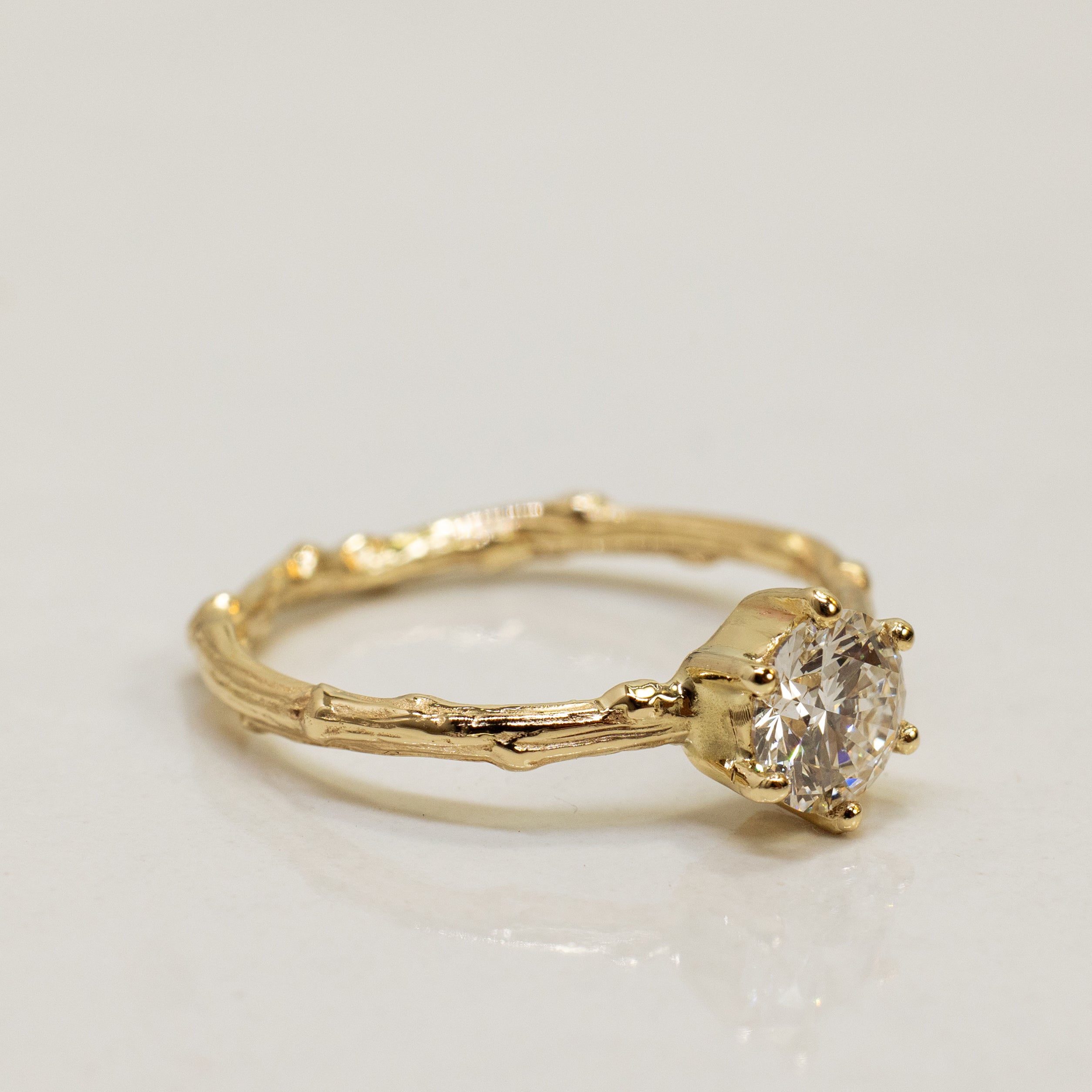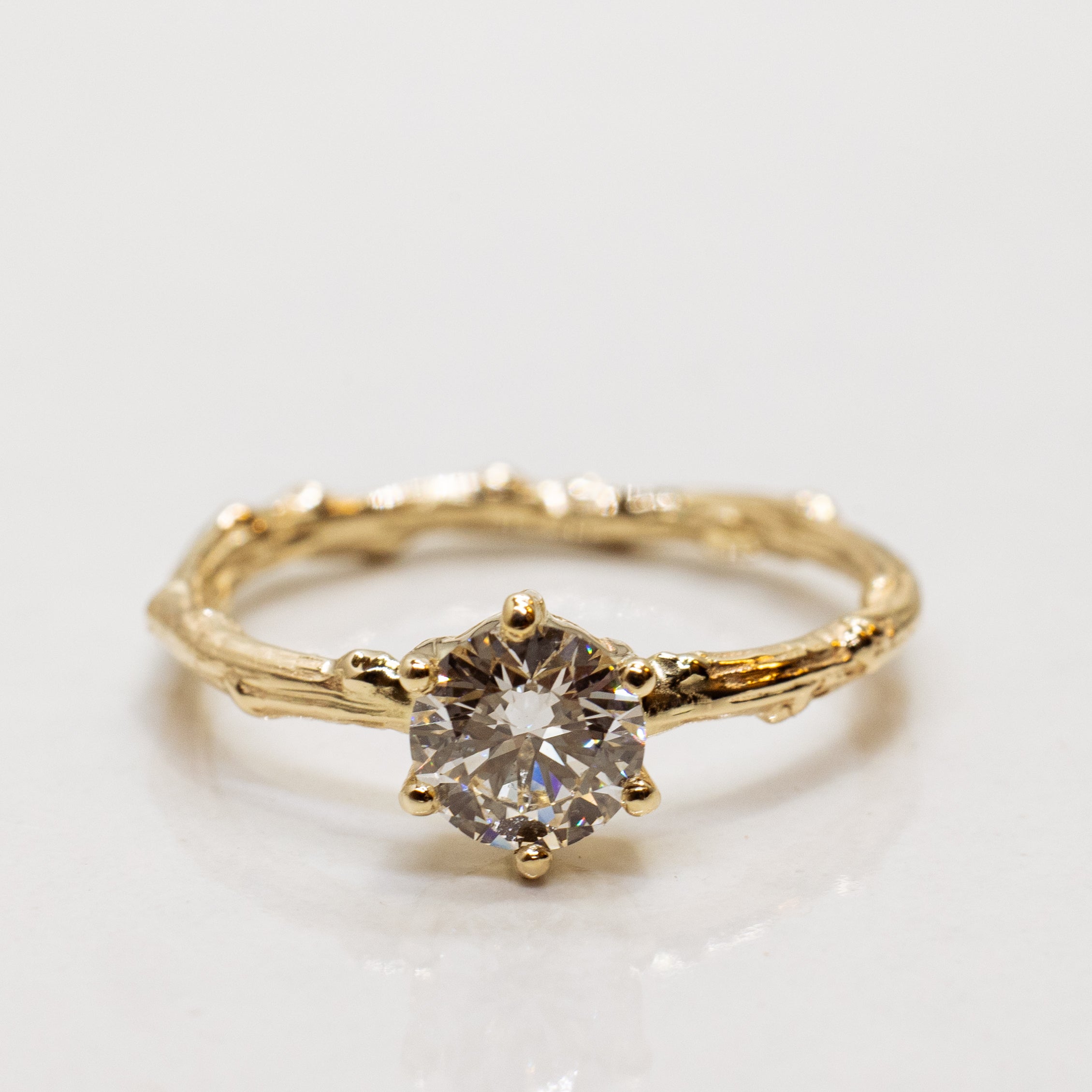 This is an impressive 14k yellow gold solitaire branch ring with a single light champagne 0.75ct diamond, set with six prongs. This is a classy, elegant engagement ring with a unique organic touch.