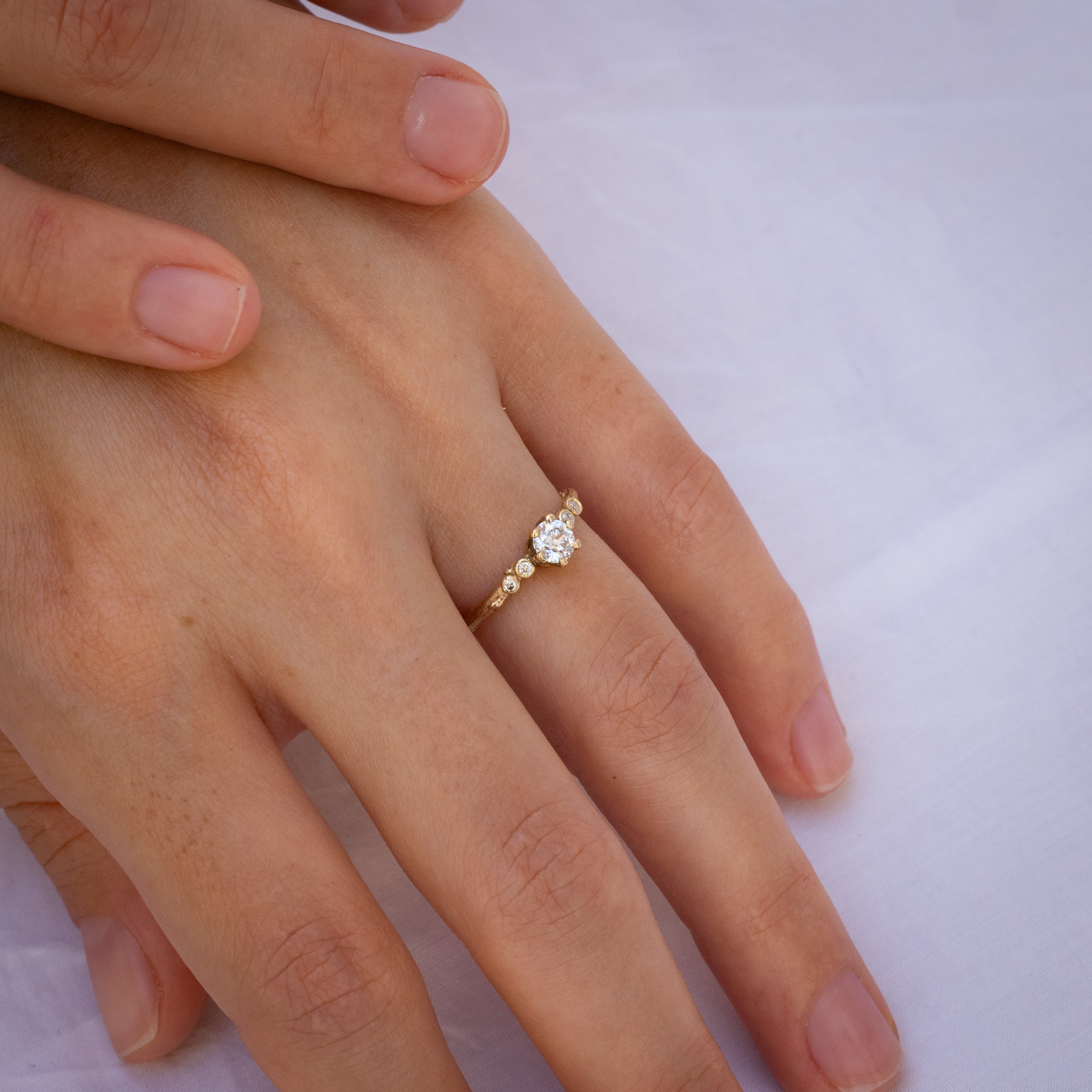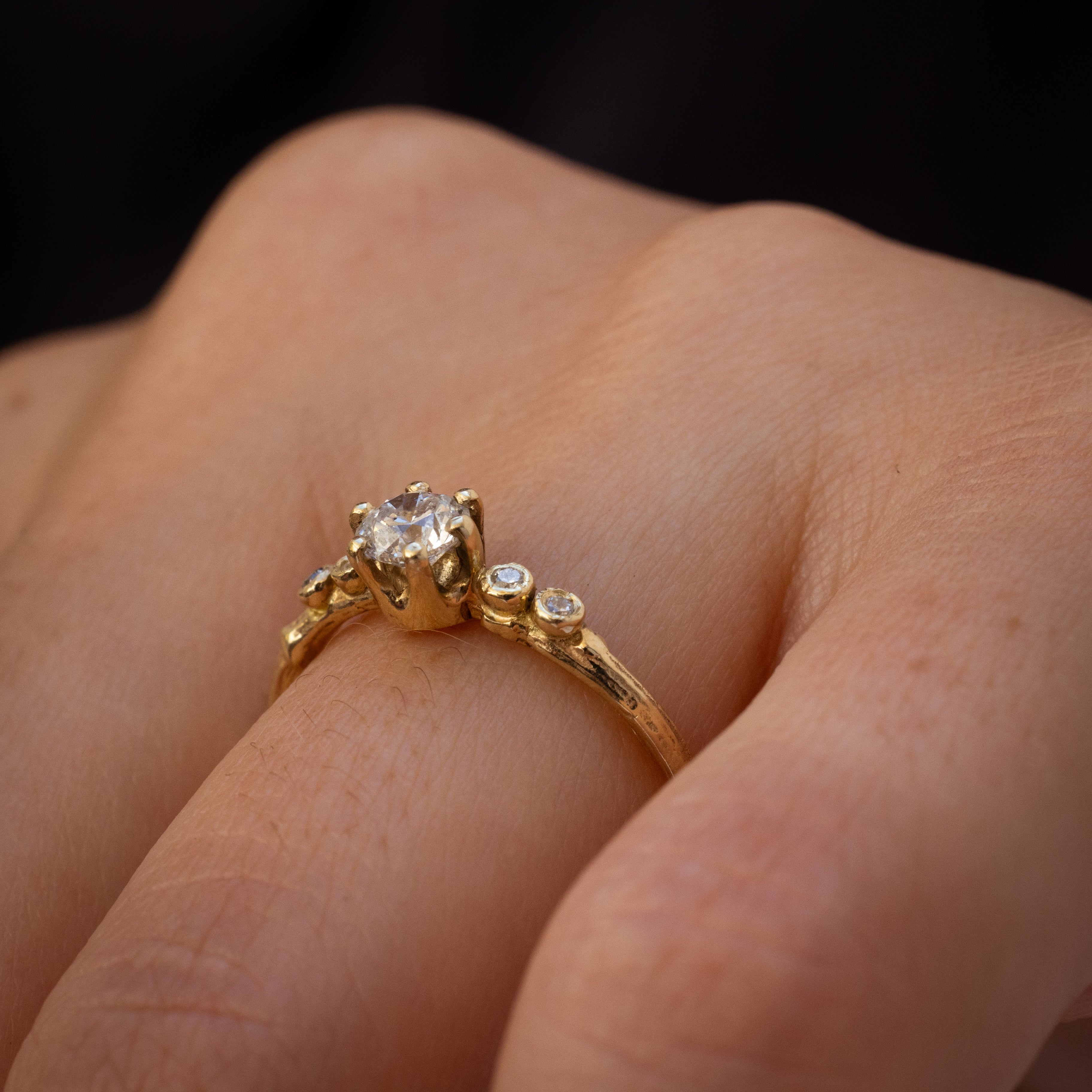 This is a five-stone branch ring, set with a 0.25 white diamond in the center and two diamonds on both sides 1.4 mm each . Beautiful and unconventional engagement ring with symmetric proportions - an overall classic wear look, but not a typical engagement ring.