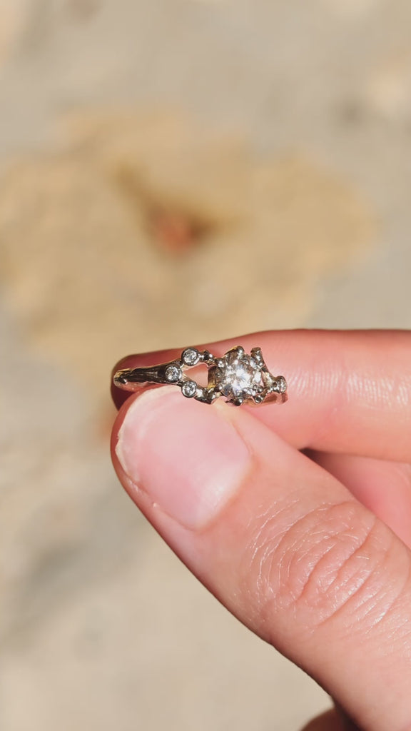 This asymmetrical branch ring is adorned with champagne diamonds. It features a central 0.40ct champagne diamond, accompanied by four smaller diamonds measuring 1.4mm each, which are artfully scattered along the branch in asymmetric composition. Enhancing the organic look of this design and making it an unconventional choice.
