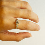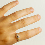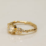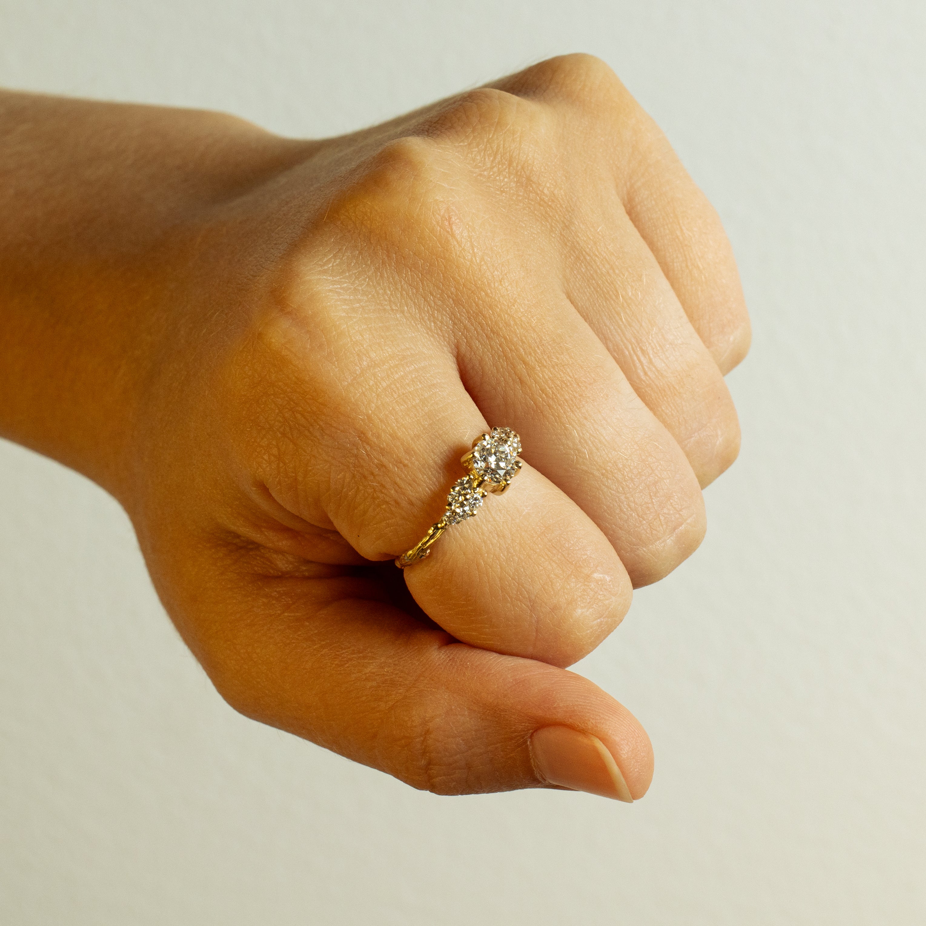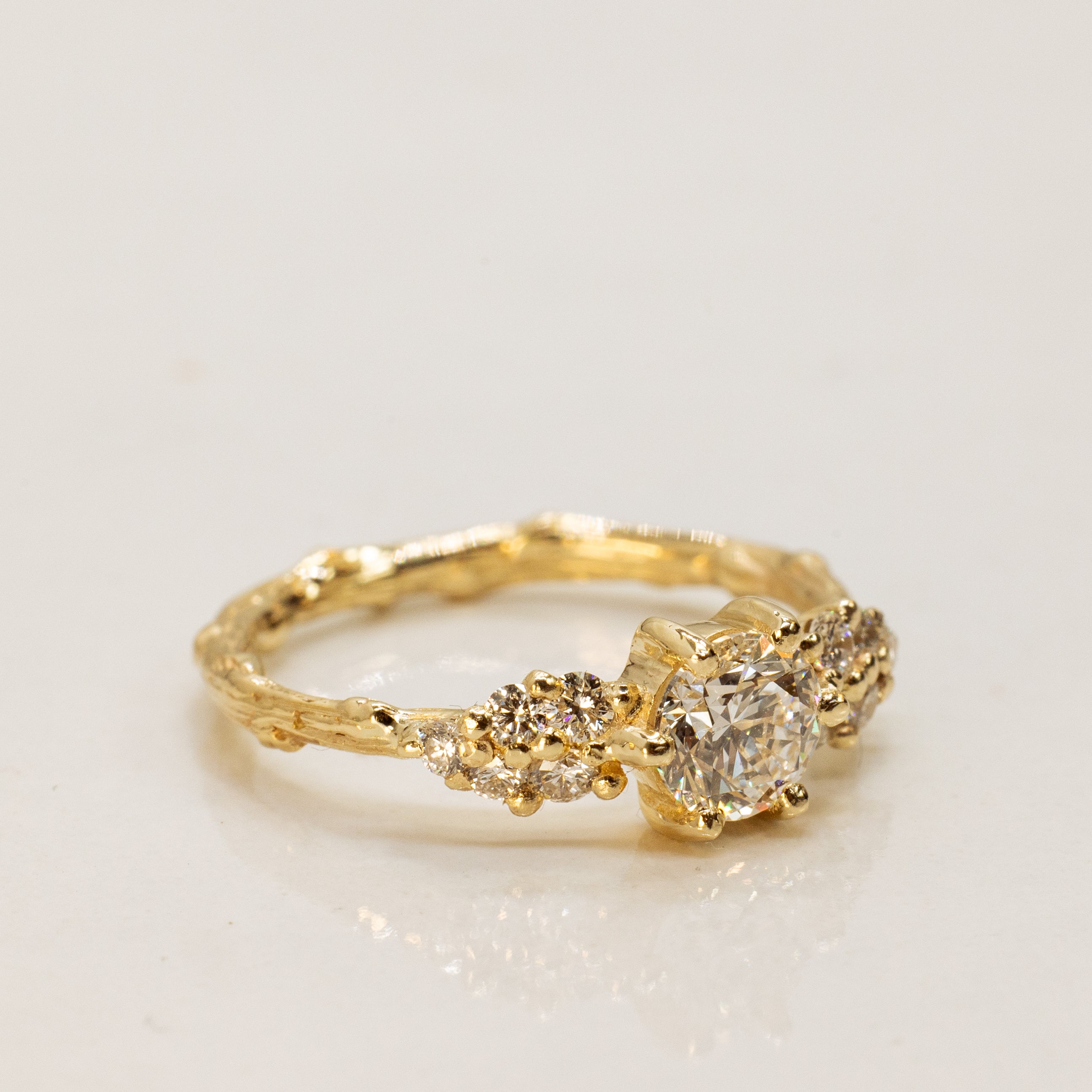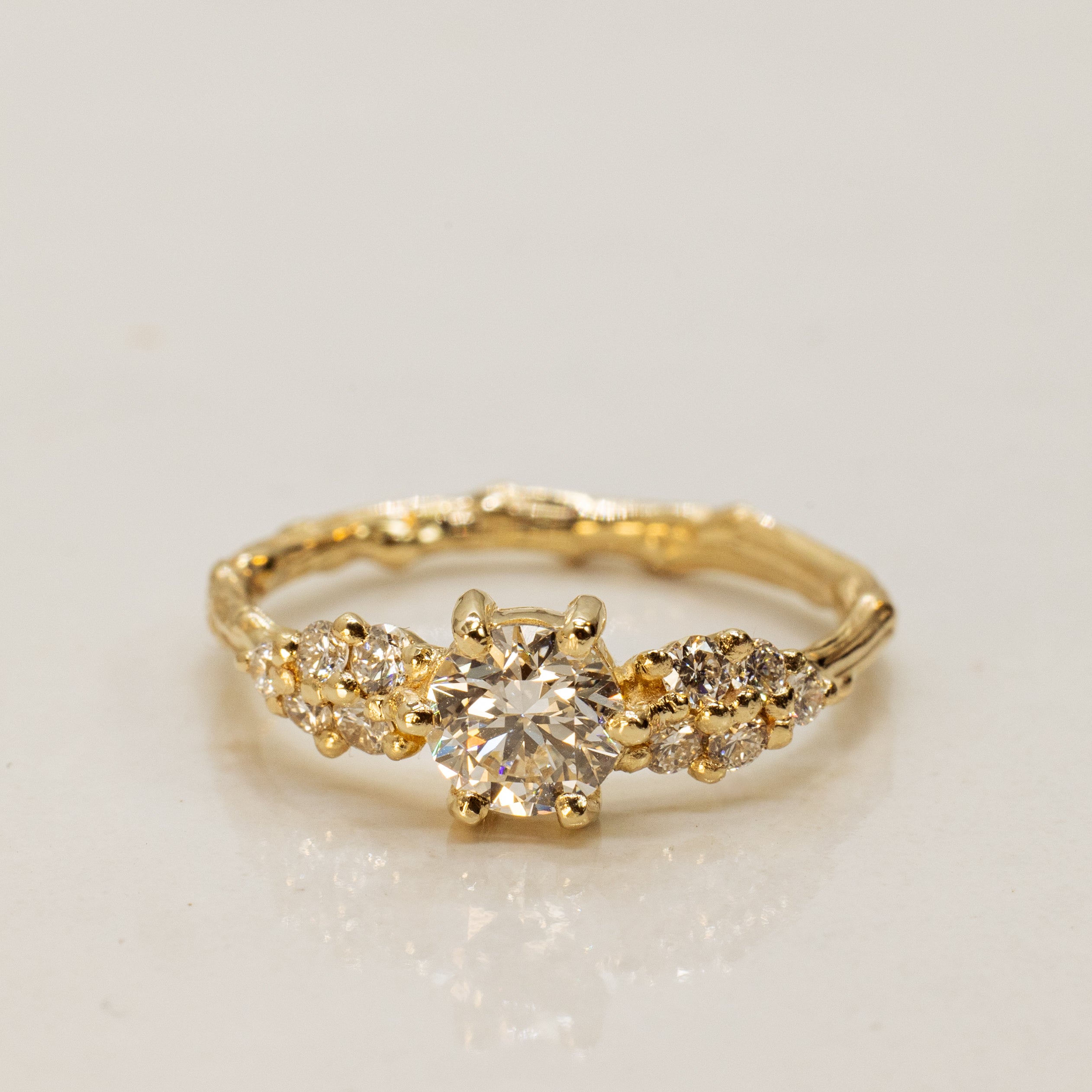 This stunning 14K gold engagement ring features a textured branch profile, highlighted by a central 0.70 ct lab-grown diamond. Flanking the centerpiece, there are five smaller diamonds on each side, measuring between 1.8 mm and 1.3 mm. These smaller diamonds are arranged in a zigzag pattern, creating a cluster that resembles a bouquet.