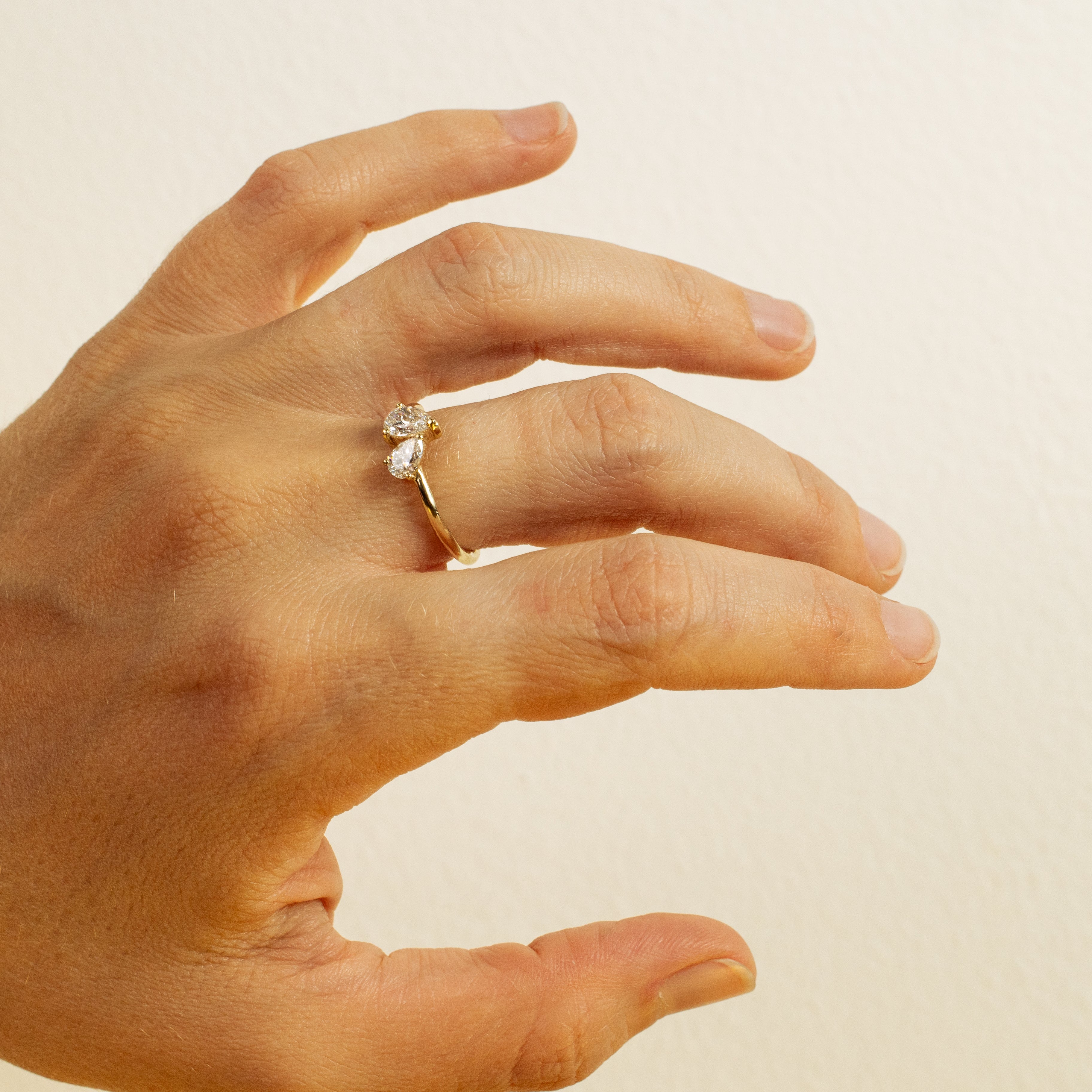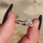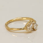 The drop-cut diamonds are oriented toward each other like a couple, adding a symbolic and poetic touch to the design. As a one-of-a-kind piece, this ring showcases specific characteristics that make it truly unique. It can also be customized to fit your budget and style preferences. For any specifications or inquiries, please contact us.
