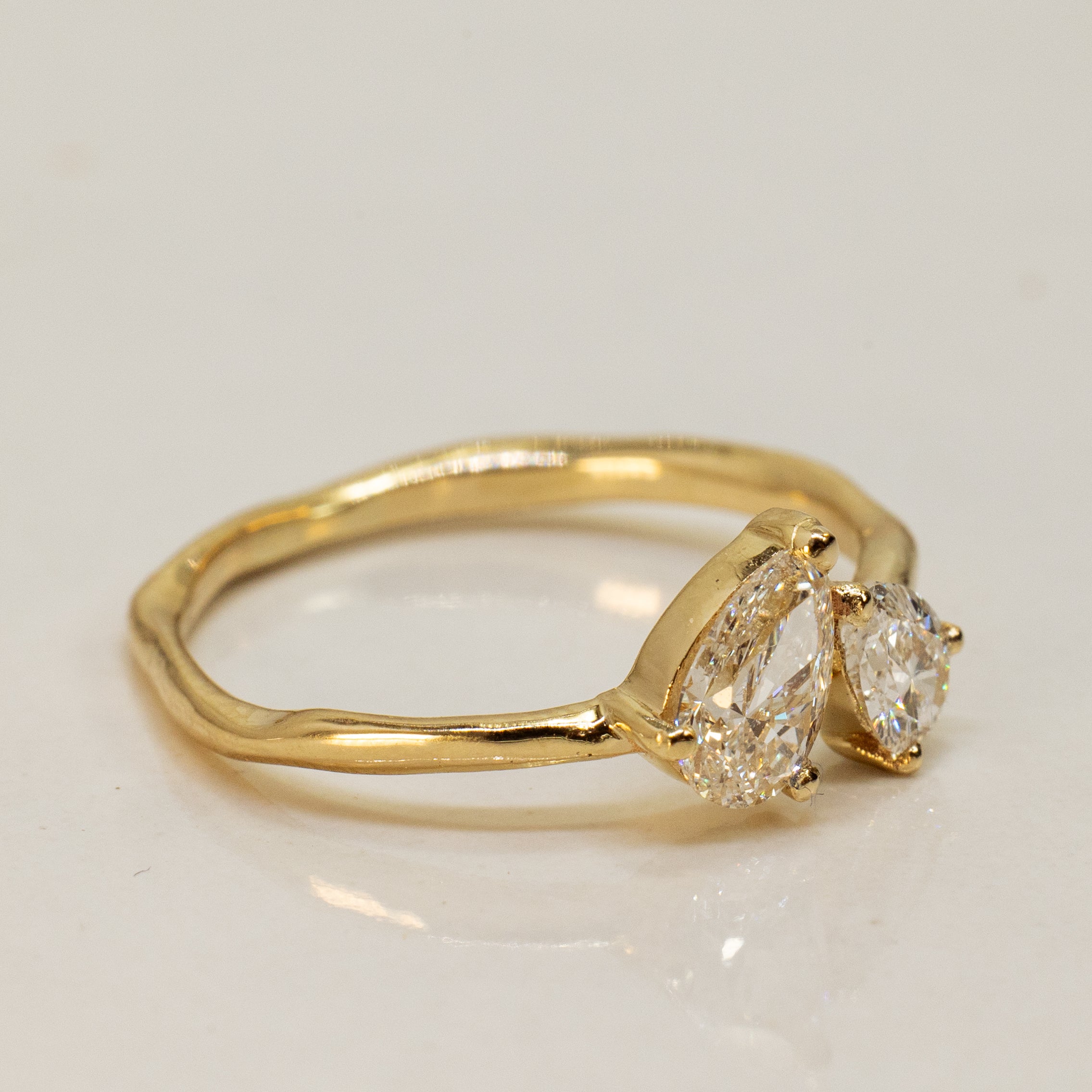 This unique 14K yellow gold ring features two pear-cut white diamonds: a smaller one weighing 0.25 ct and a larger one weighing 0.50 ct, all set on a classic raw band.