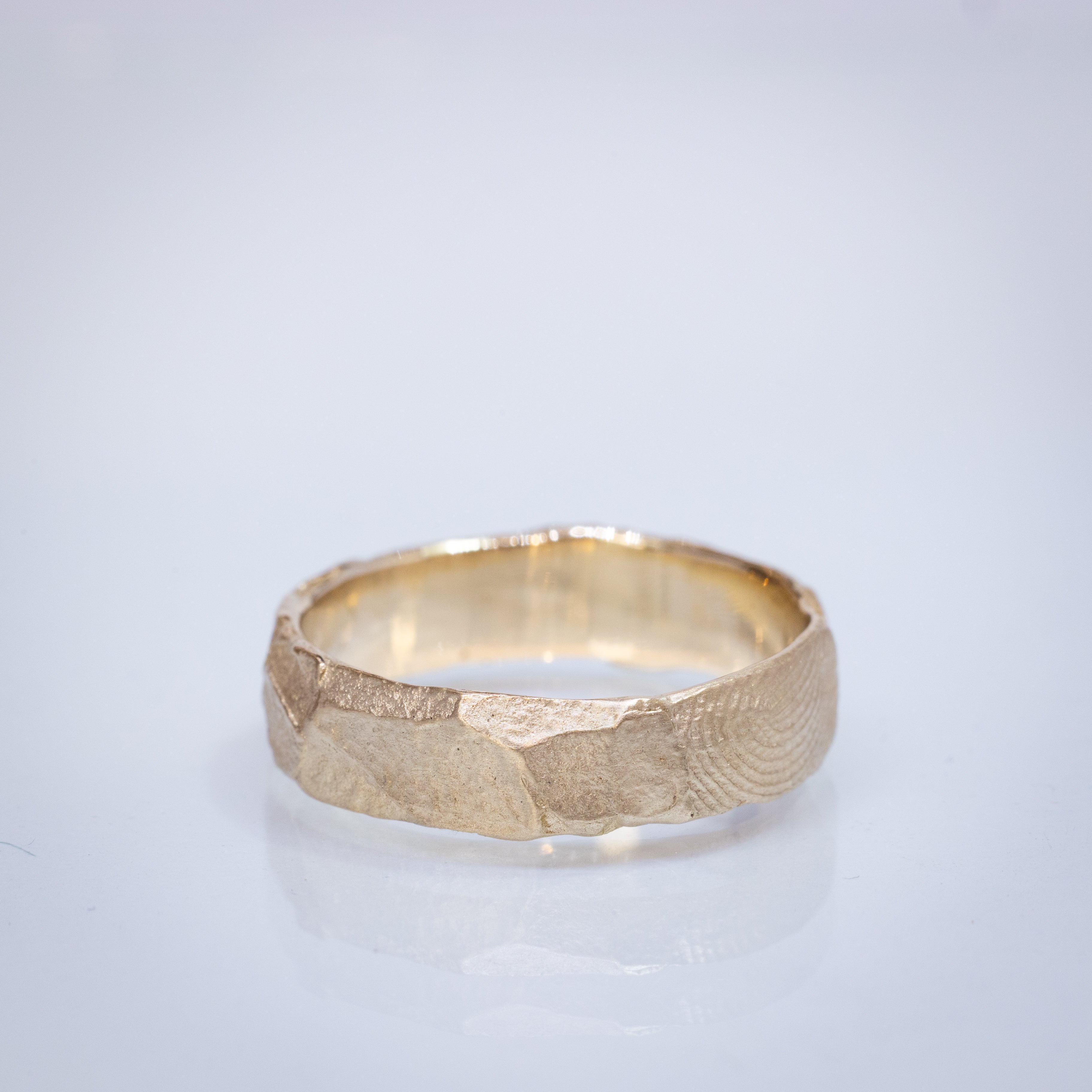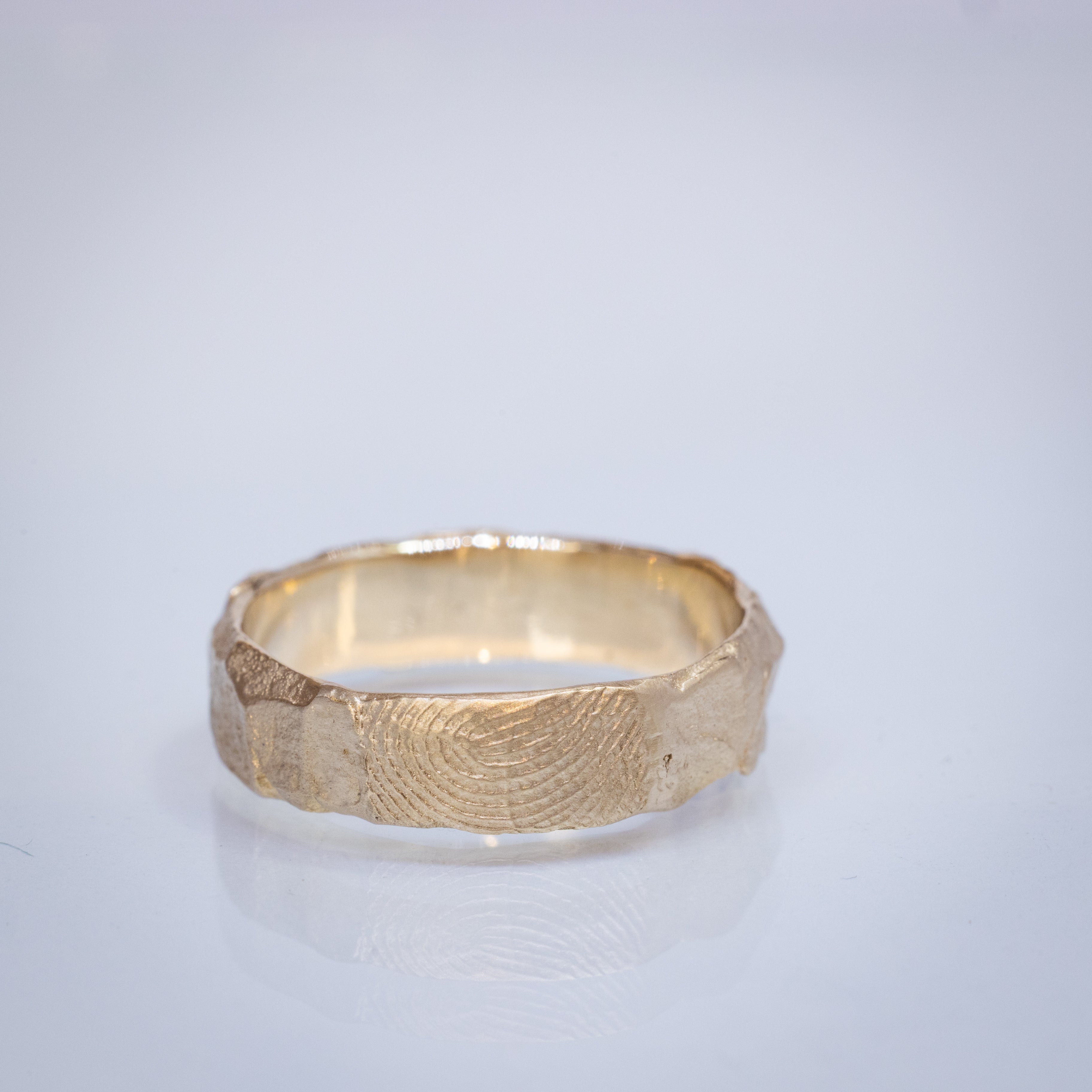 This 14K raw gold band features an organic, rough texture inspired by the intricate patterns of cracked earth. The width of the band is 5.5mm.  This Ring has a personal addition of your loved one's fingerprint on it.