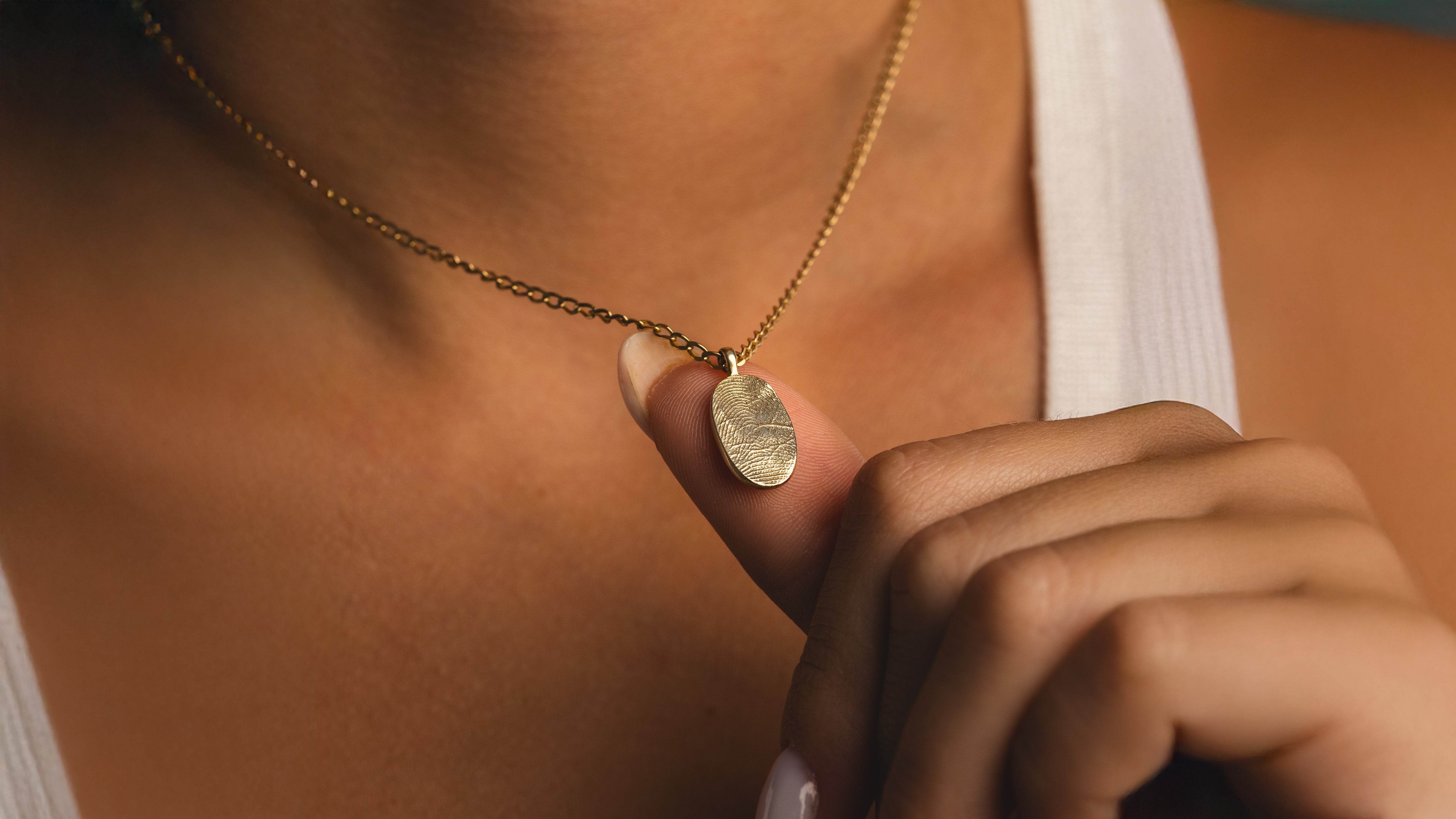 A gold pendant with your loved ones' fingerprints on it. It is a touching and moving piece of jewelry that cherishes the one you adore close to your heart.