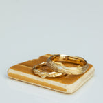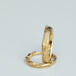 One is a tree trunk ring, whichis made of 14k yellow gold and has a wide thickness. The other is a version of our eternity ring with a trunk-tree textured finish, which looks like twisted branches. It is an unconventional yet elegant wedding ring.