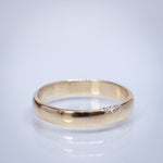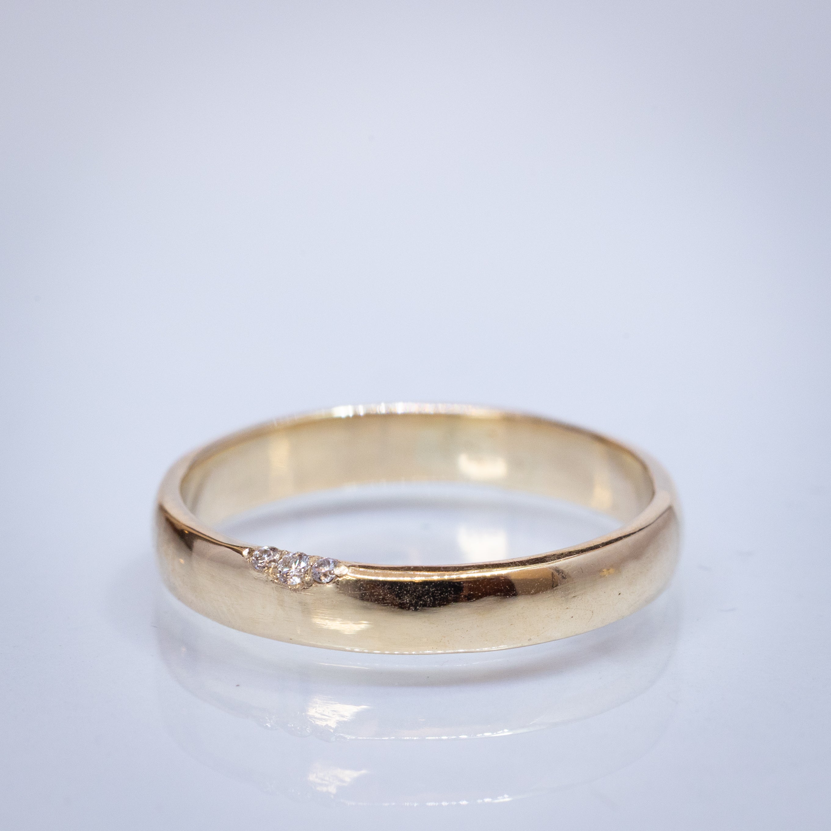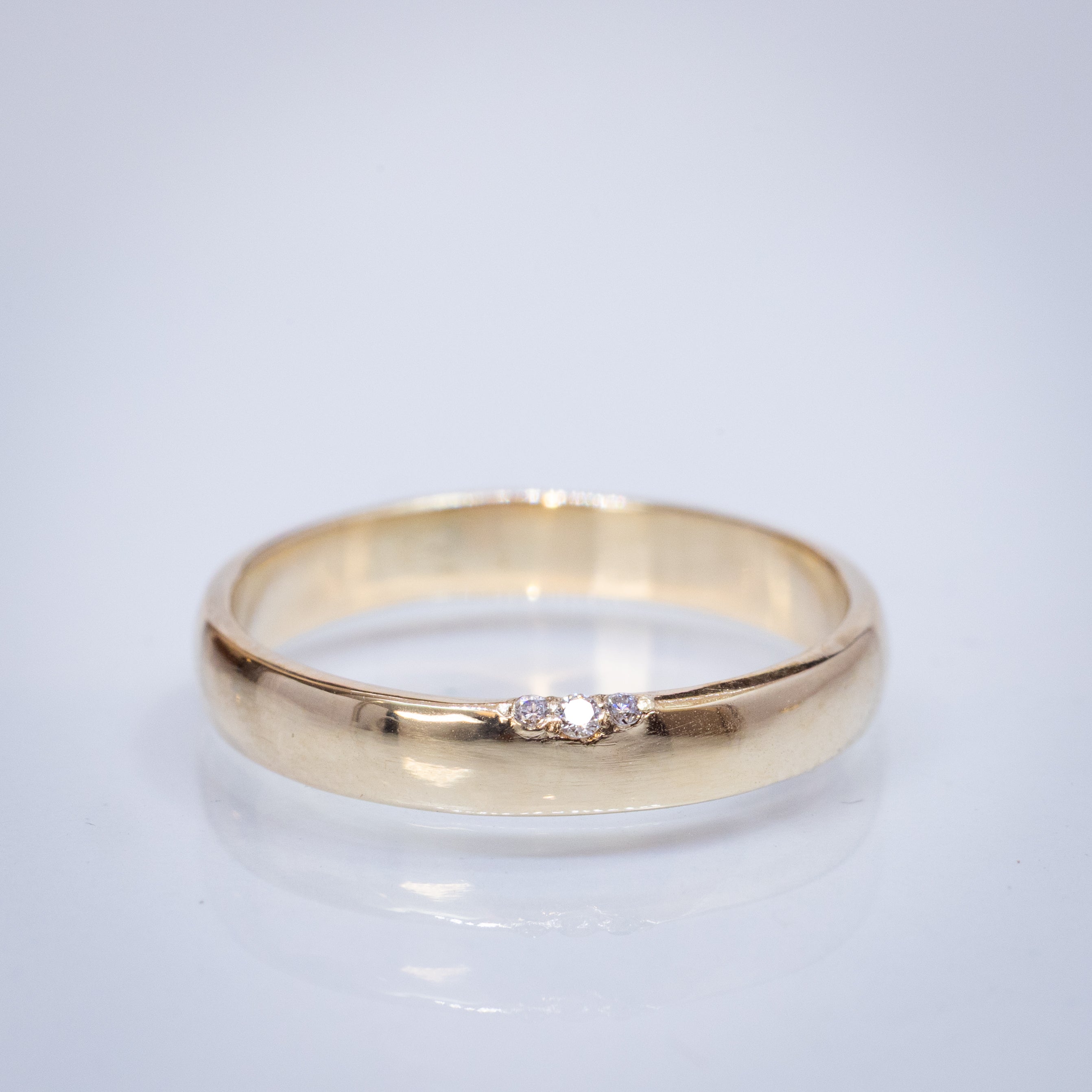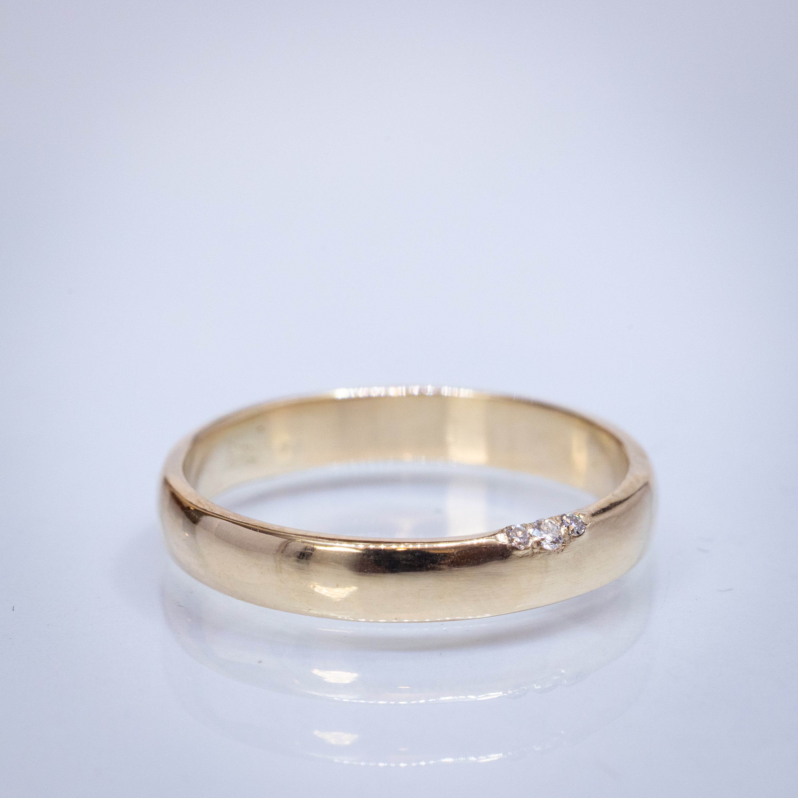 This is an unusual wedding ring with a hidden diamond setting—three tiny white diamonds on the edge—like a little symbolic secret that makes this ring unique with a gentle spark.