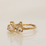This gentle branch tri-stone ring is crafted in 14K yellow gold and features two pear-cut Lab-grown diamonds ( 0.50 ct, 0.75 ct) alongside a smaller round diamond ( 0.20 ct). Its gentle and delicate design showcases the pear-cut stones pointing in different directions, creating a truly regal, crown-like appearance.