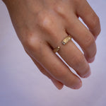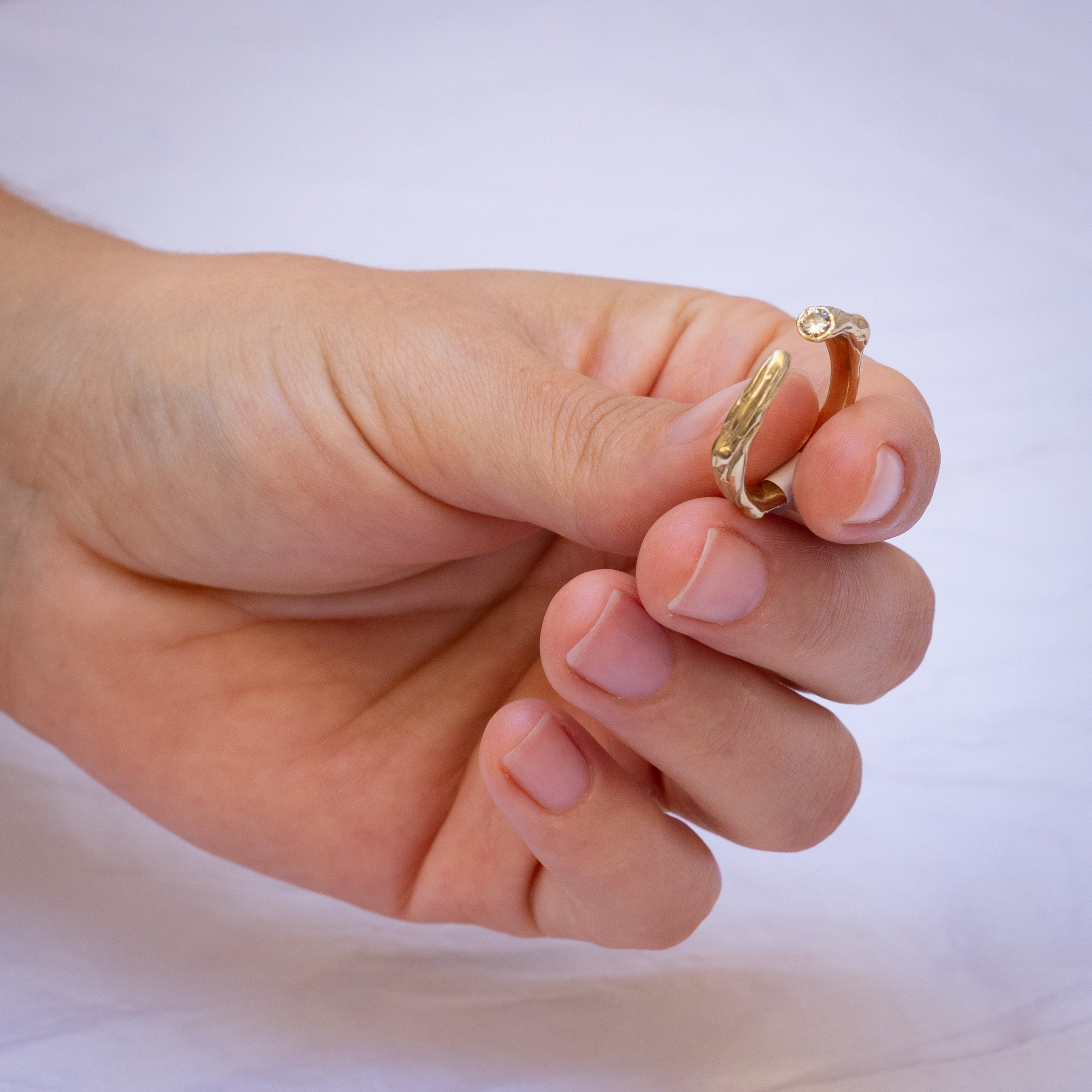 A slightly open thick branch ring with a 0.15ct champagne diamond is set on one side.