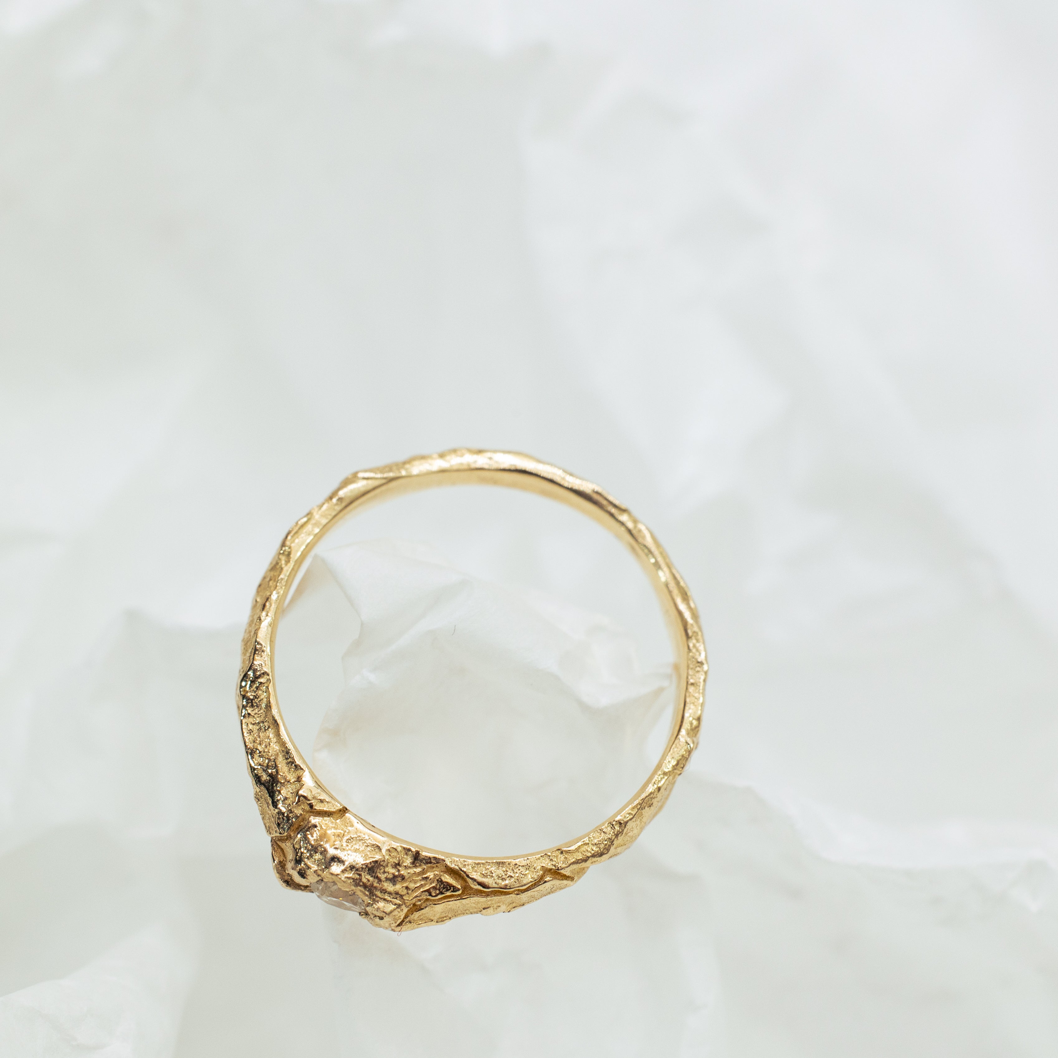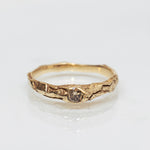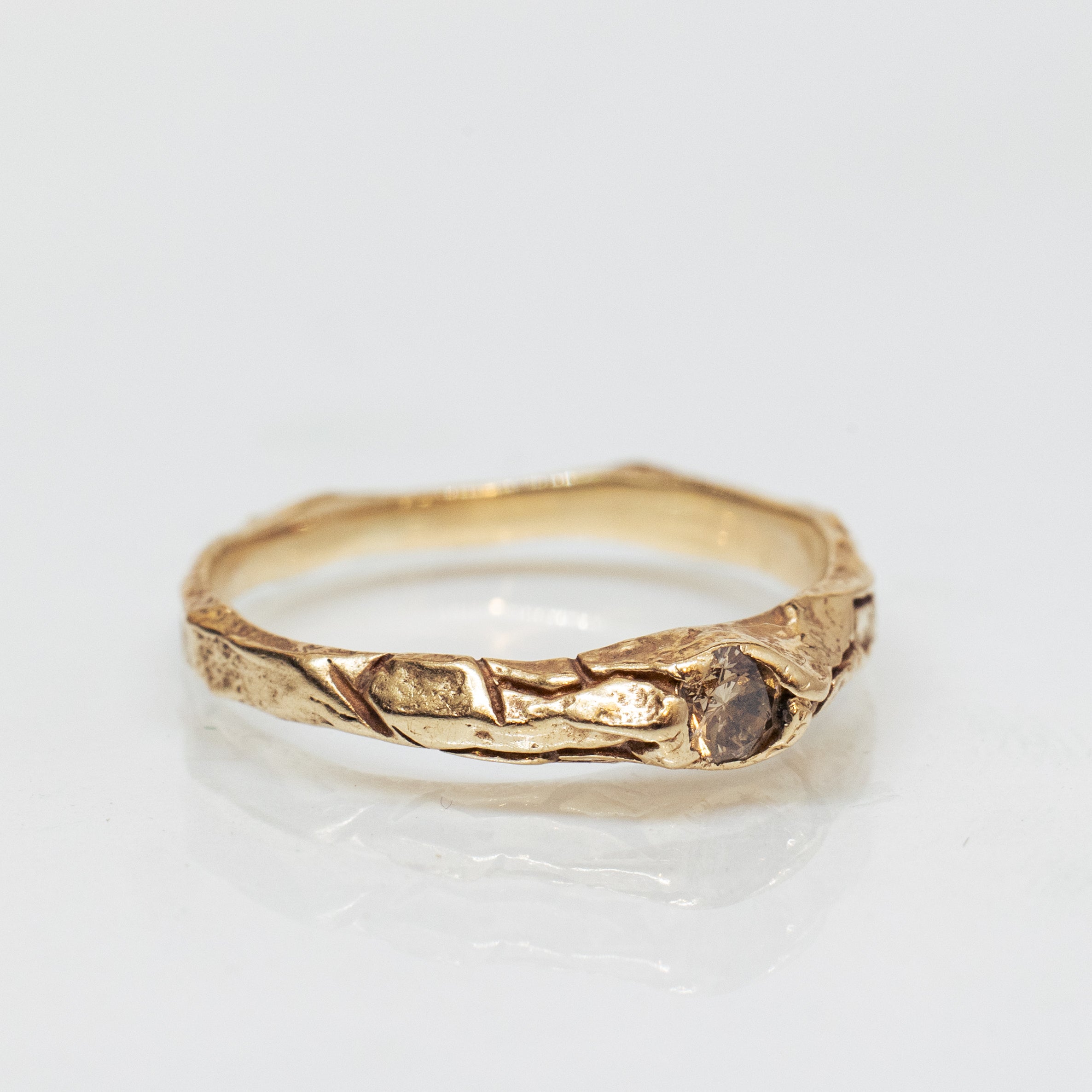 Handcrafted in 14K gold, the band features an organic, rugged texture inspired by the intricate patterns of cracked earth. At the center, a 0.10ct champagne diamond adds a refined sparkle that contrasts beautifully with the raw surface of the gold.