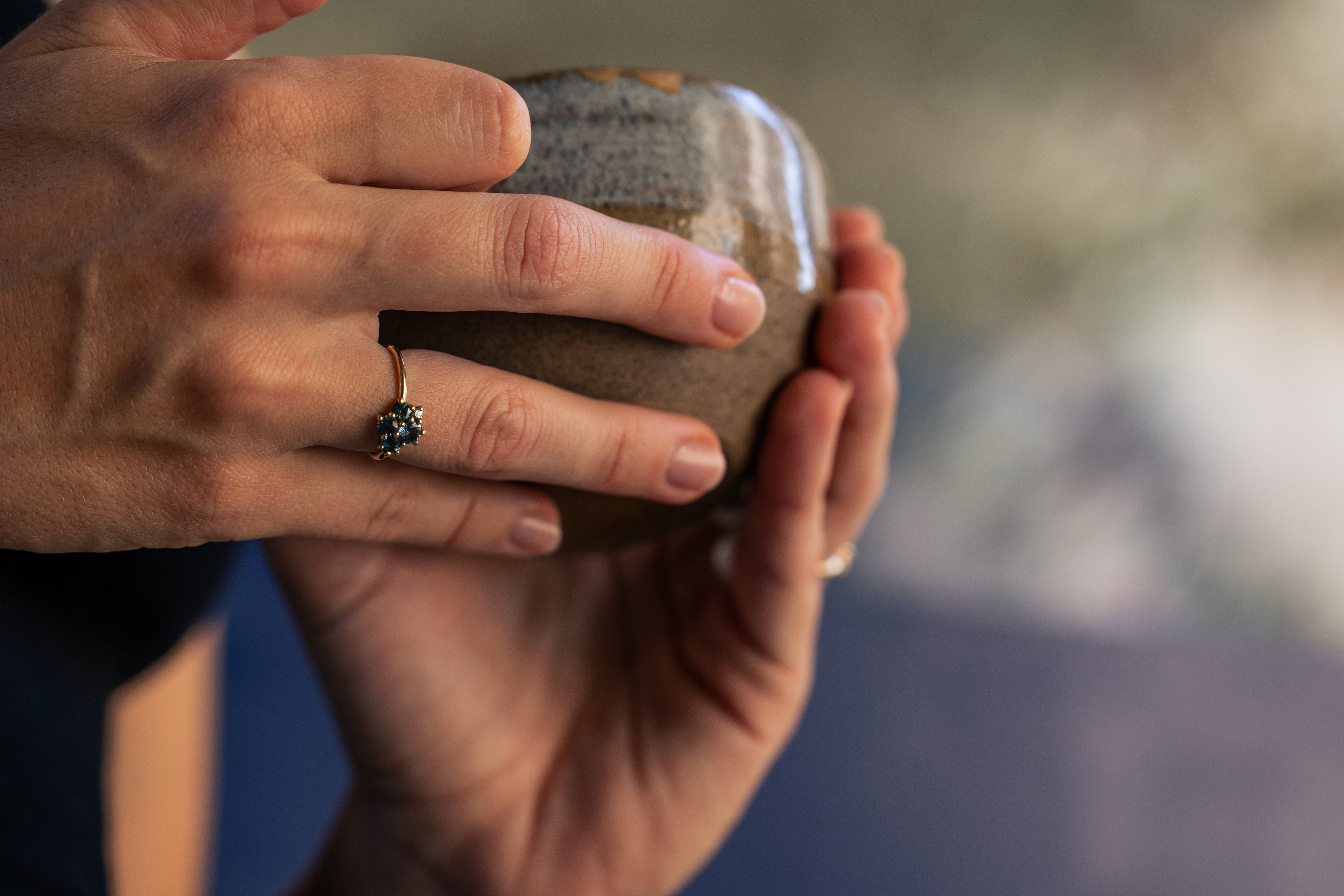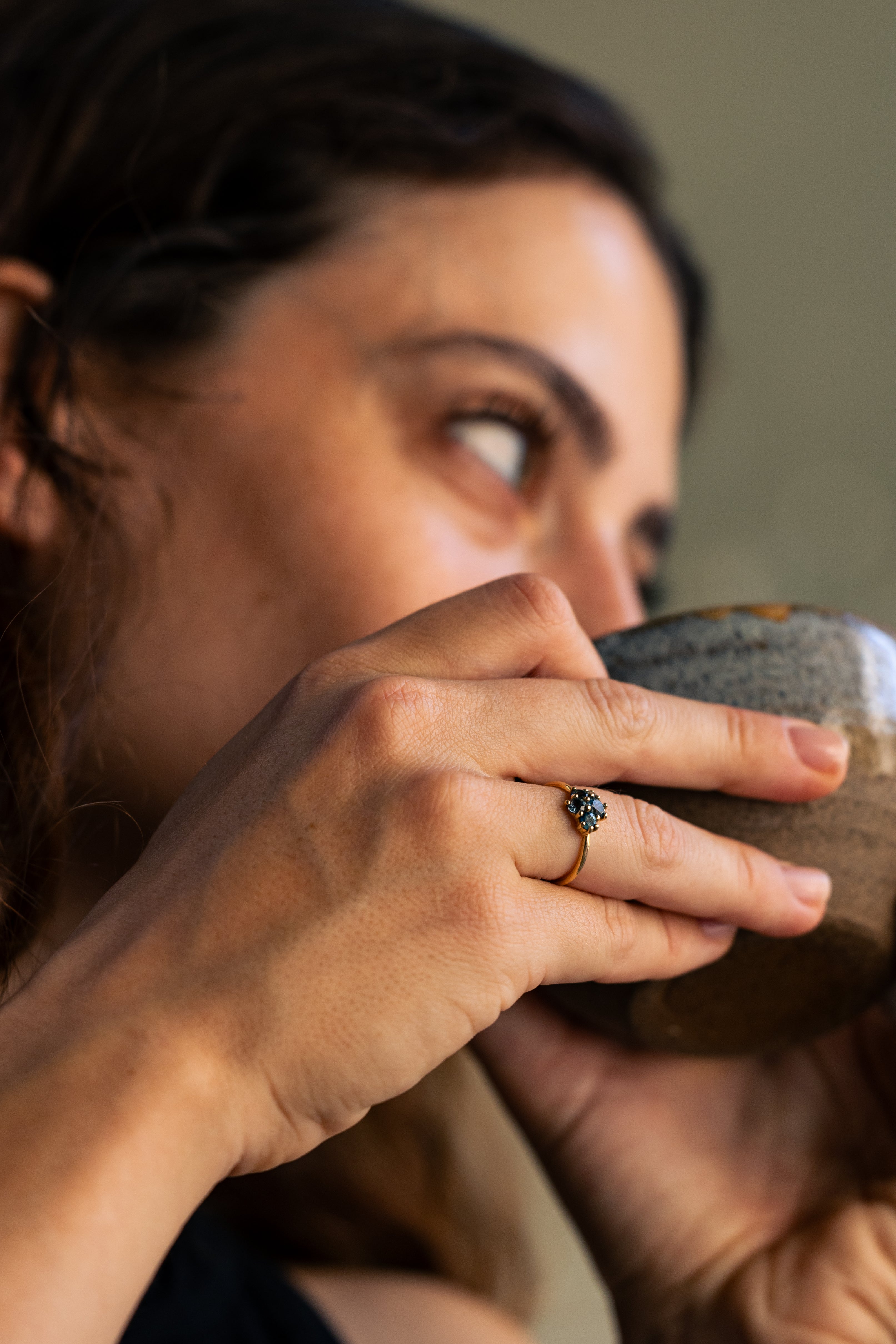 A genuinely mesmerizing parti sapphire cluster ring, reminding the sun. It is made of 14K yellow gold. Thisbeautiful and unconventional engagement ring is set with approx 0.65ct mixture of sizes of sapphires, giving it an overall look of classic wear in a unique engagement ring.