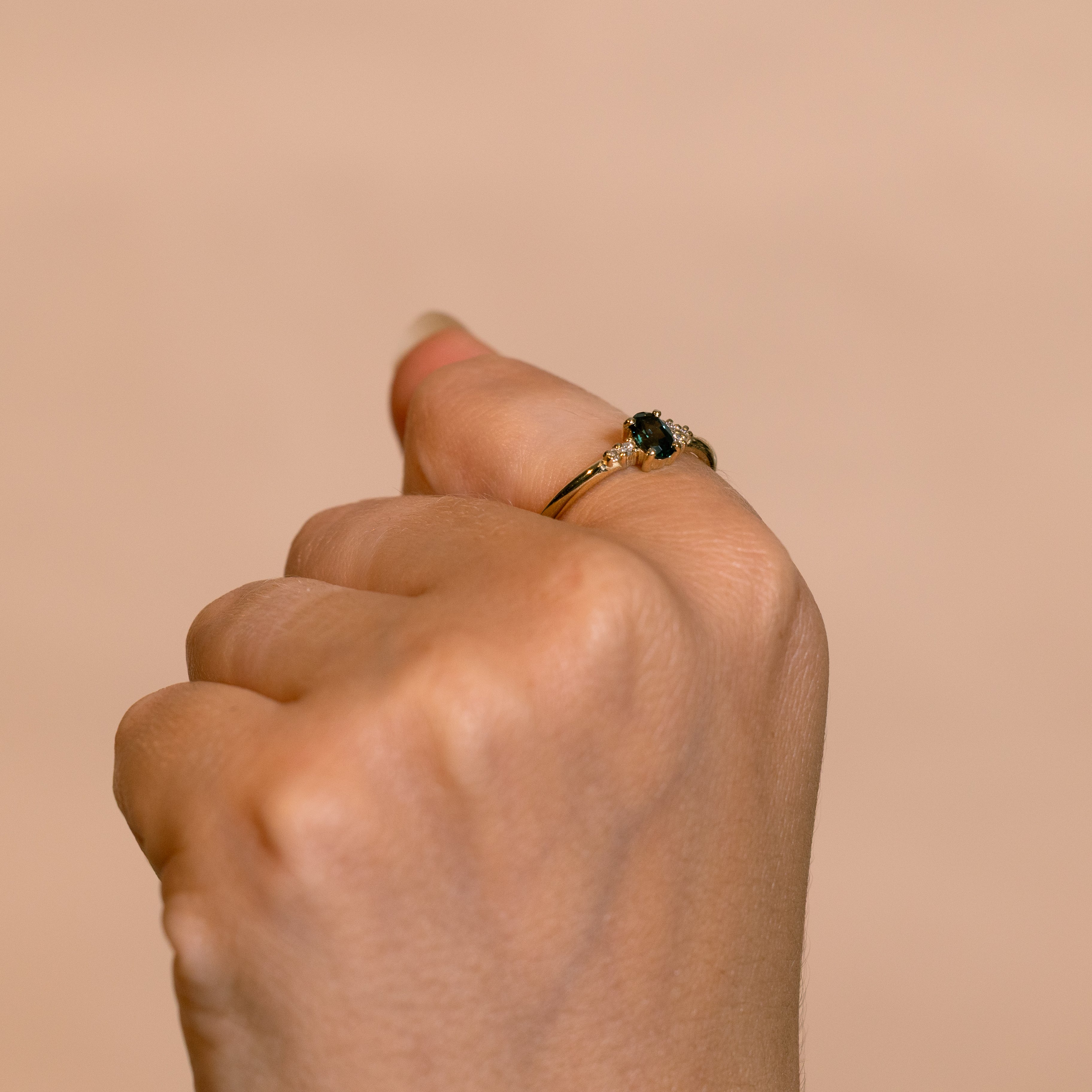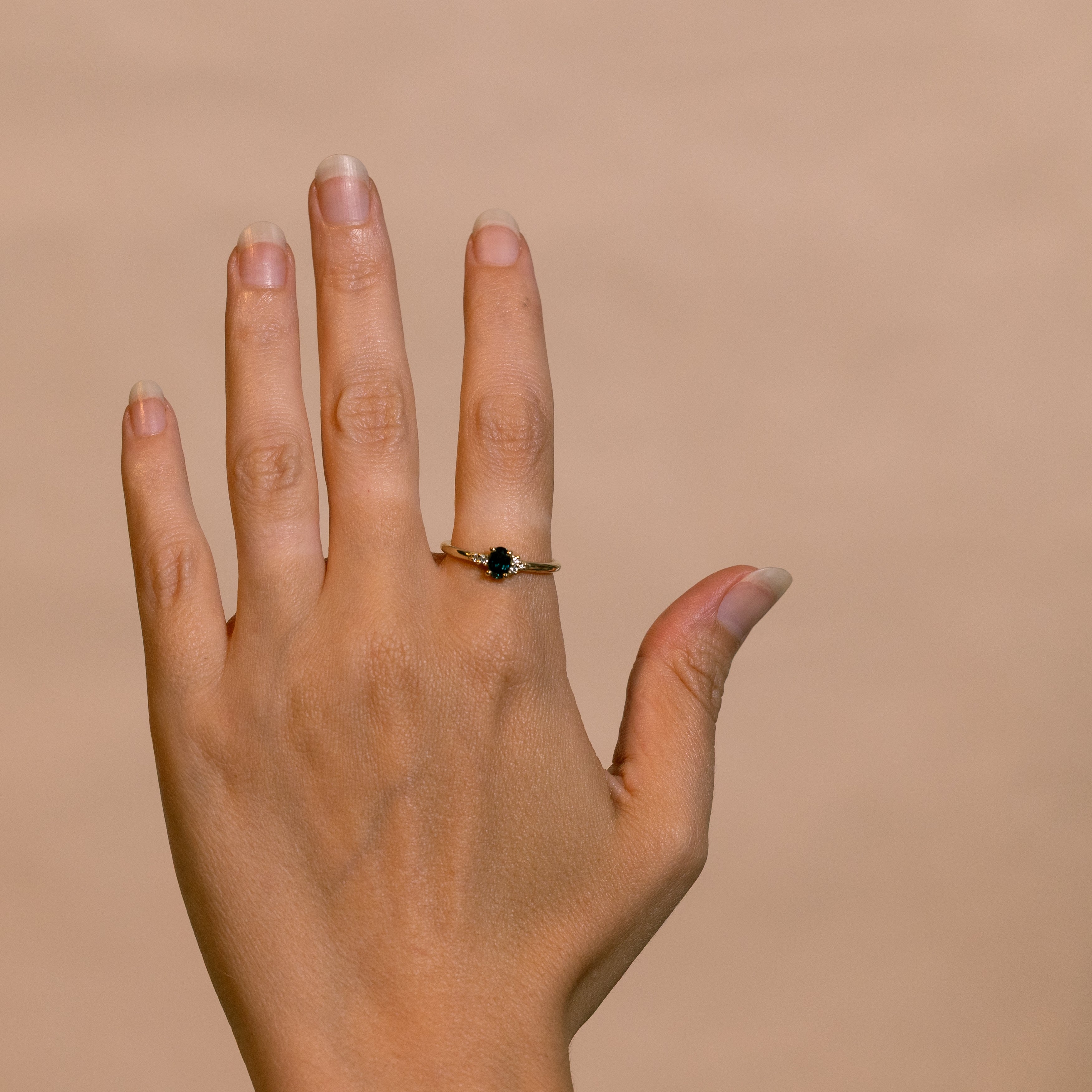 This 14K yellow gold half-round profile ring features a unique 0.40ct high-quality oval parti sapphire in the center, accompanied by 4 smaller brilliant-cut diamonds.