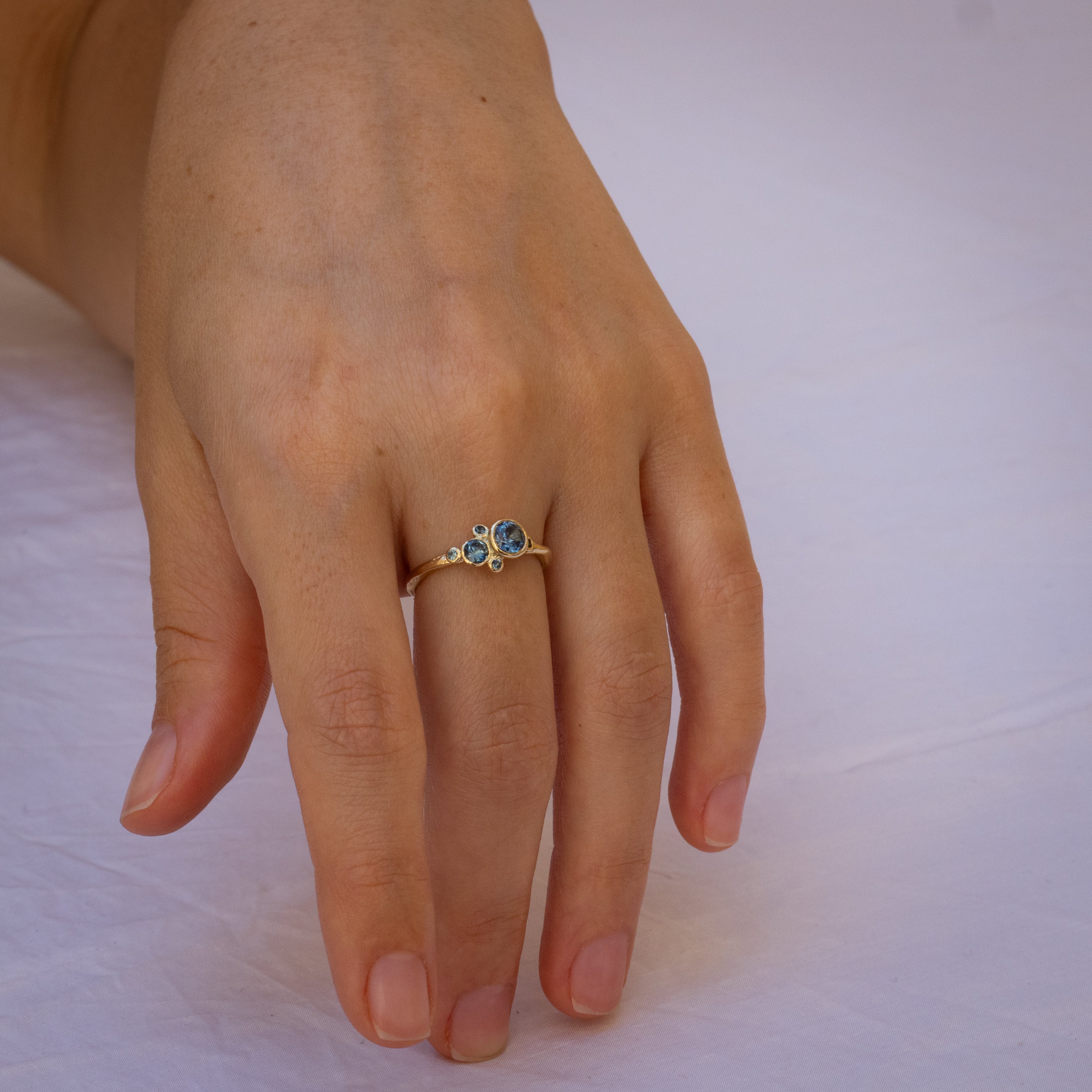 This is a classic, thin (1.5mm) 14k gold ring featuring an asymmetric cluster of gold bubbles. The bubbles are adorned with beautiful Parti sapphires in various sizes. The largest sapphire is 0.30ct, followed by a 0.20ct sapphire, and there are four smaller sapphires, each measuring 0.03ct, scattered throughout the design.
