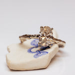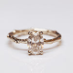 A branch solitaire ring crafted from 14k gold, featuring a 0.70ct oval cut white diamond, set with four prongs.