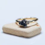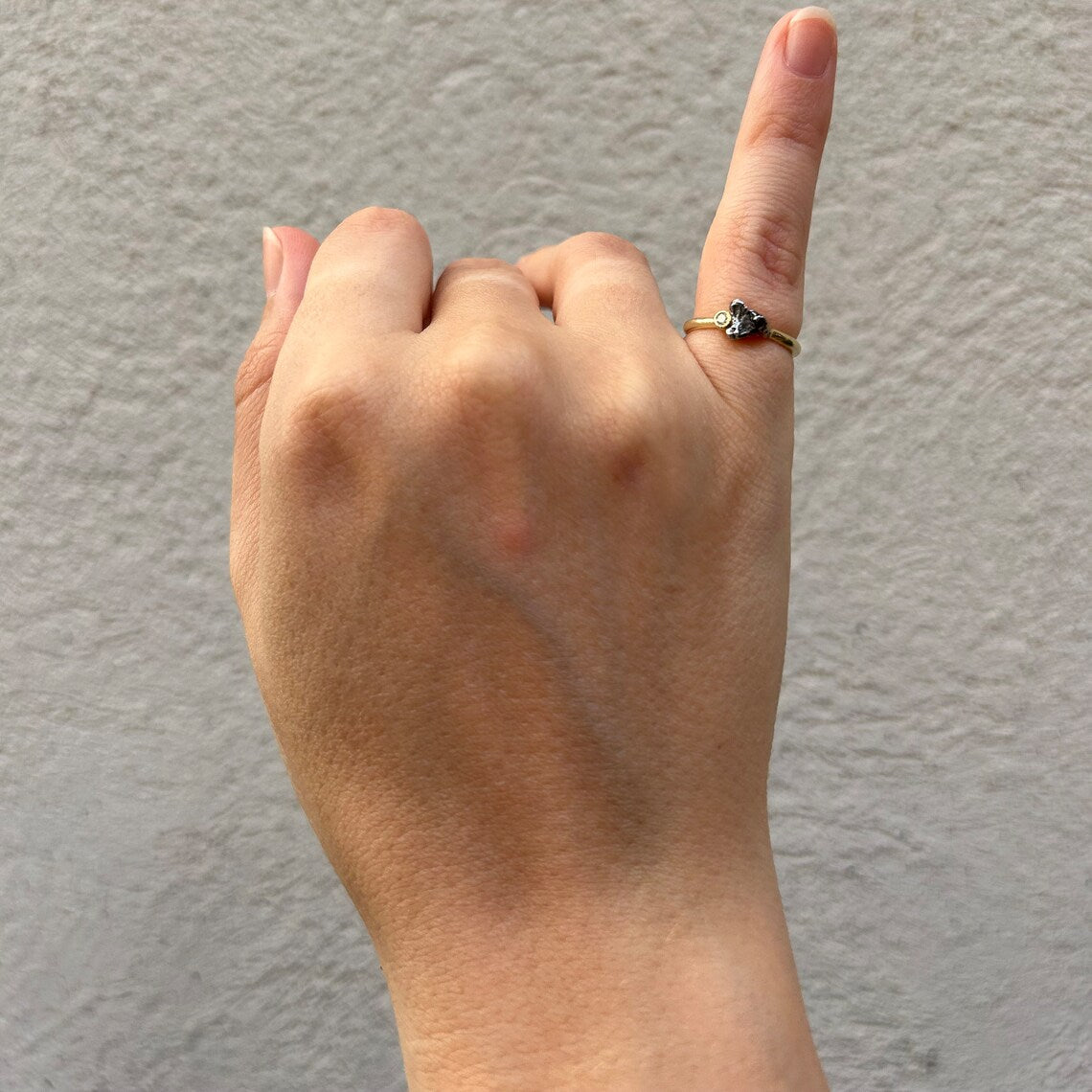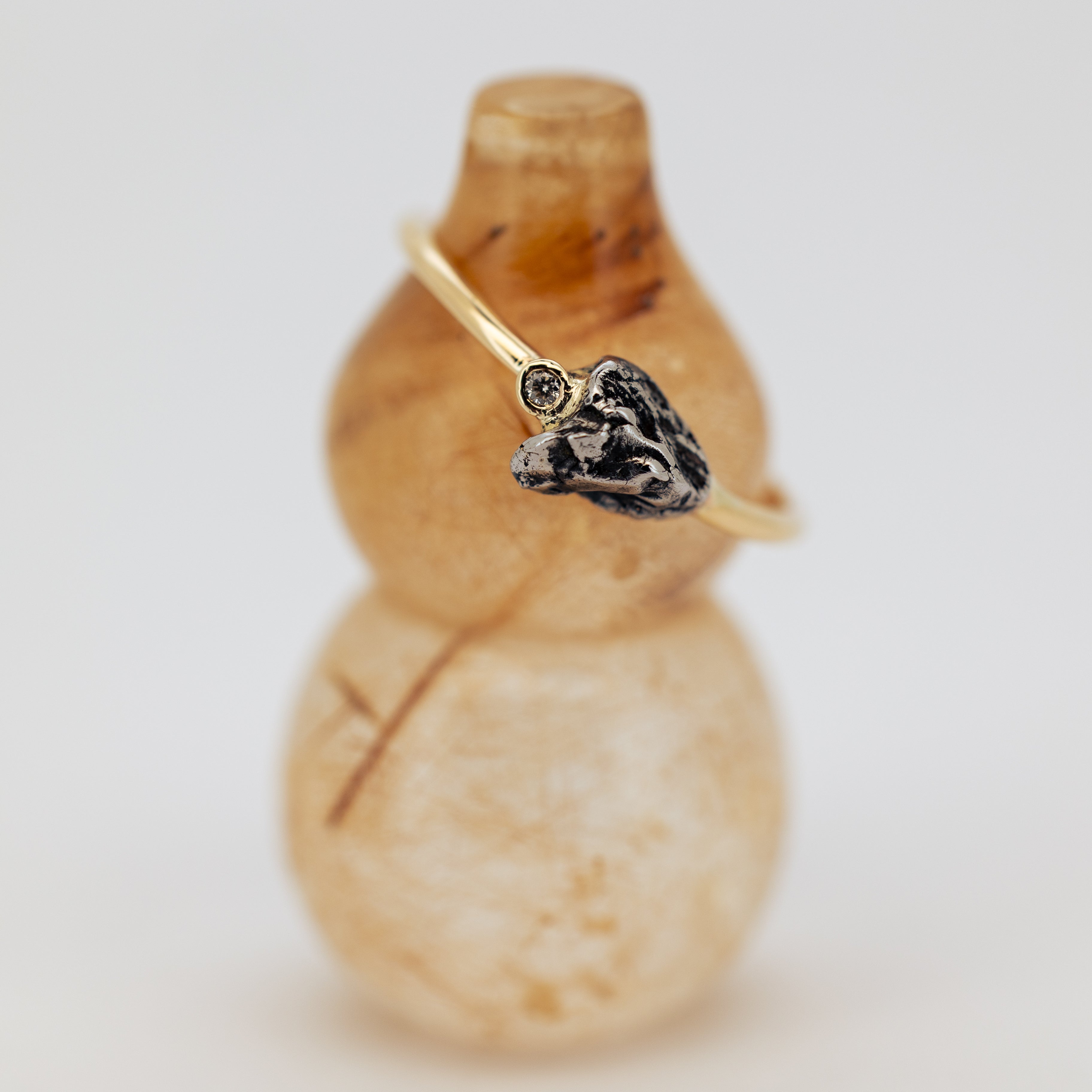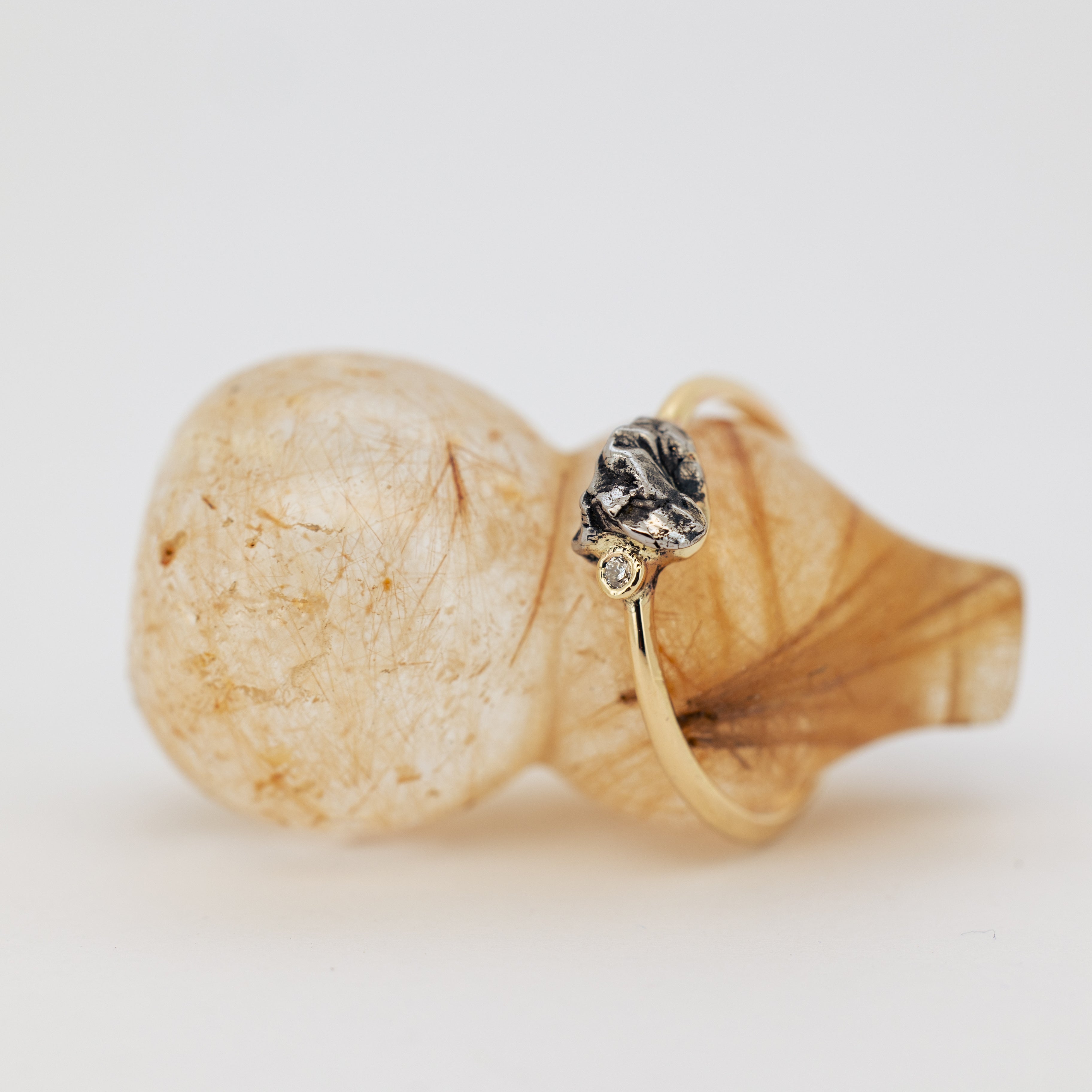 This 2 mm half-round profile band is made of 14K gold and features a uniquely shaped piece of Campo del Cielo meteorite. It is beautifully accented with a 1.8 mm white diamond, which adds a brilliant sparkle contrasting with the dark meteorite.
