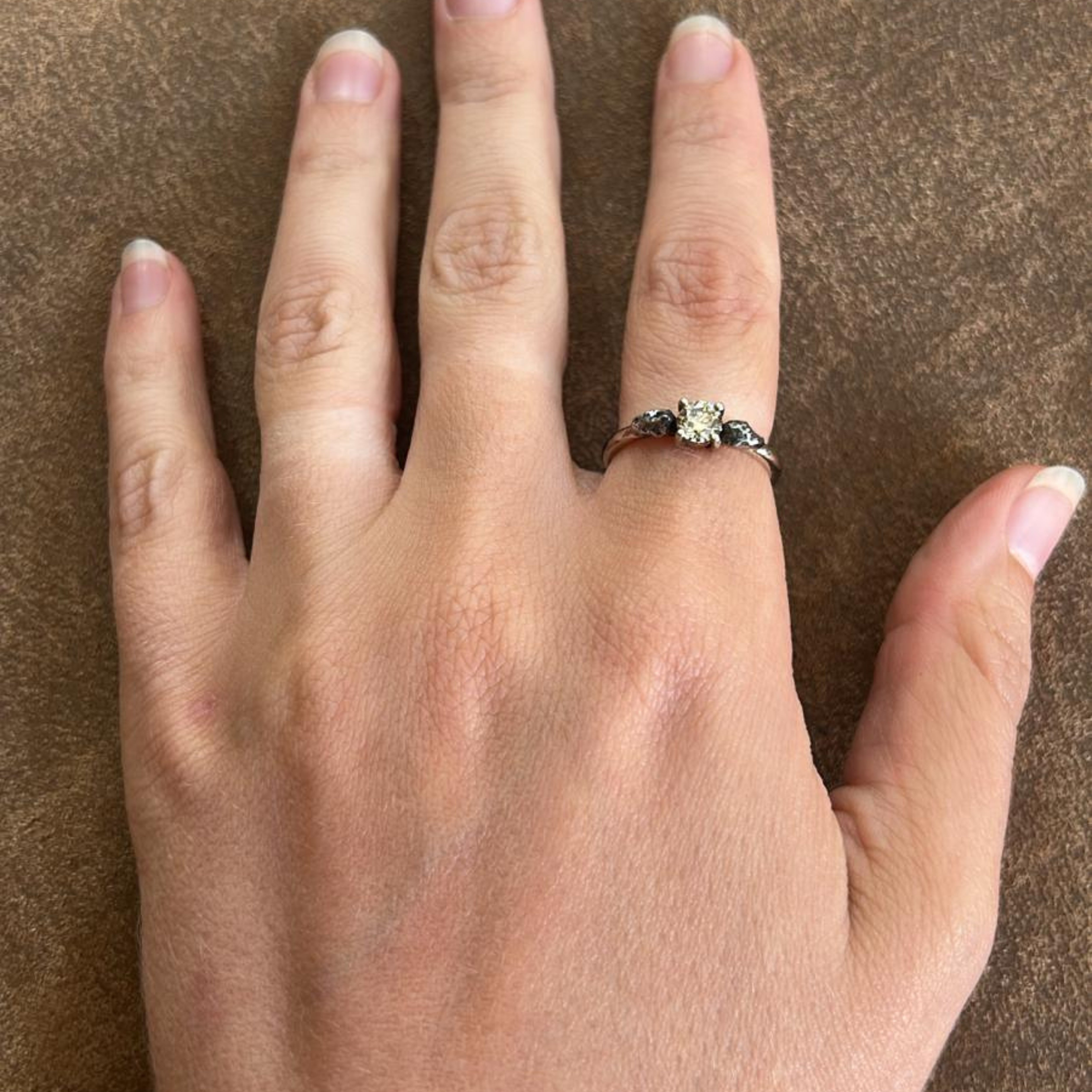 טבעת טריסטון קלאסית מזהב צהוב 14 קראט משובצת ביהלום שמפניה ושני מטאוריטים קטנים המעניקים לה תחושה גולמית יותר בניגוד לעיצוב הנקי והקלאסי שלה, לטבעת זו יש פרופורציות נהדרות - עבה ונוכחת, אך עם זאת, מרגישה בדיוק נכונה על היד.