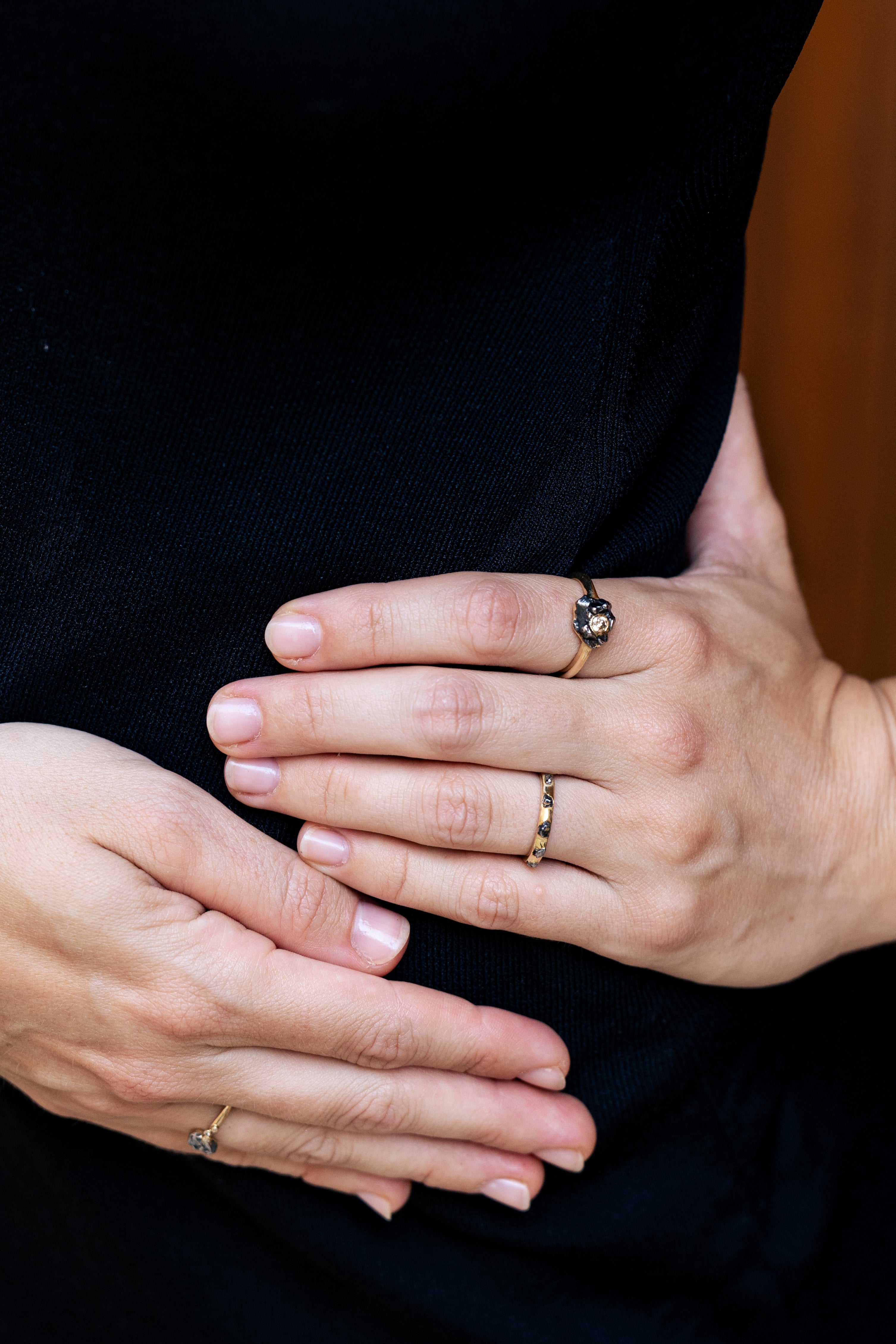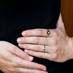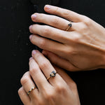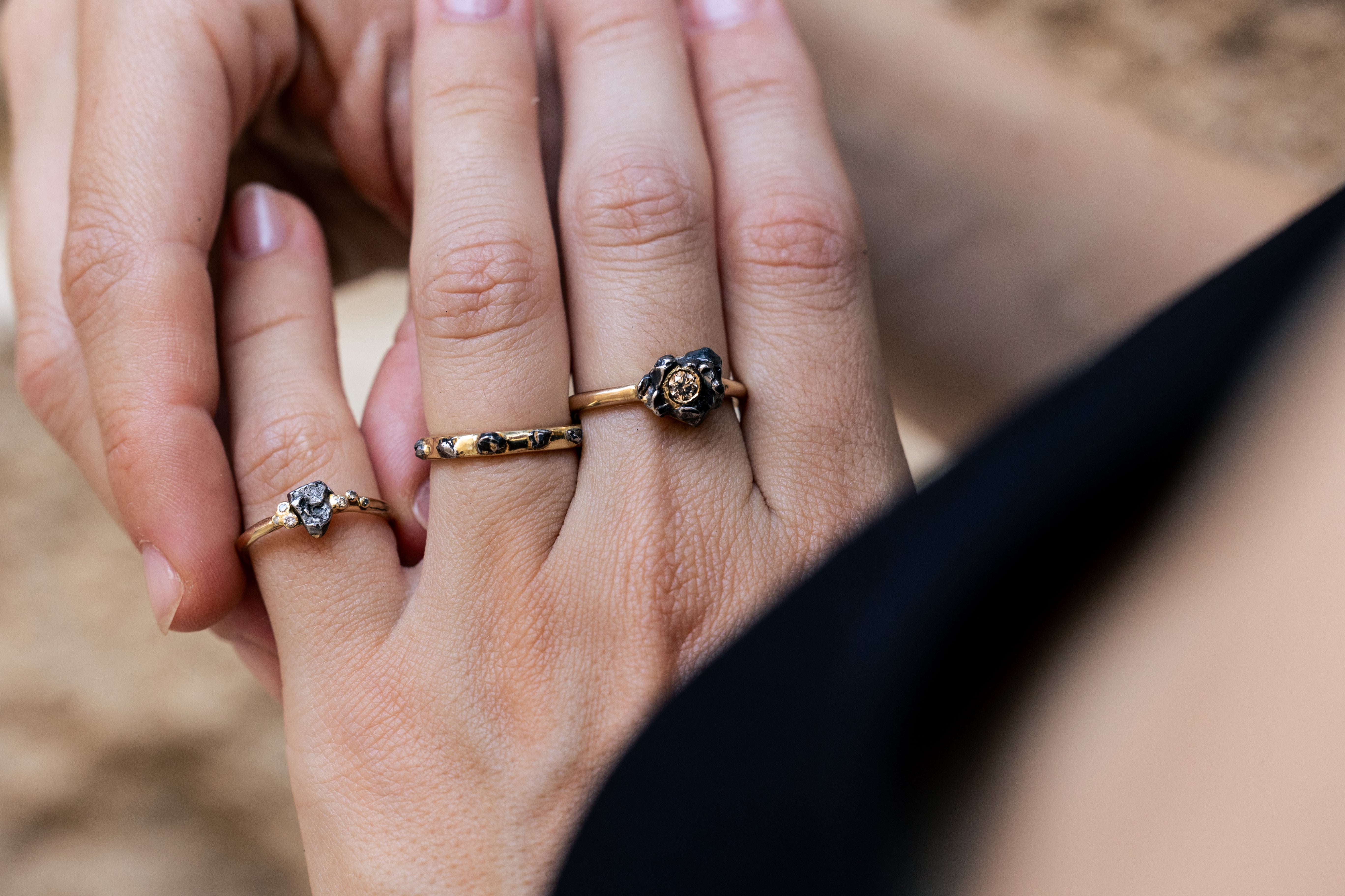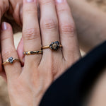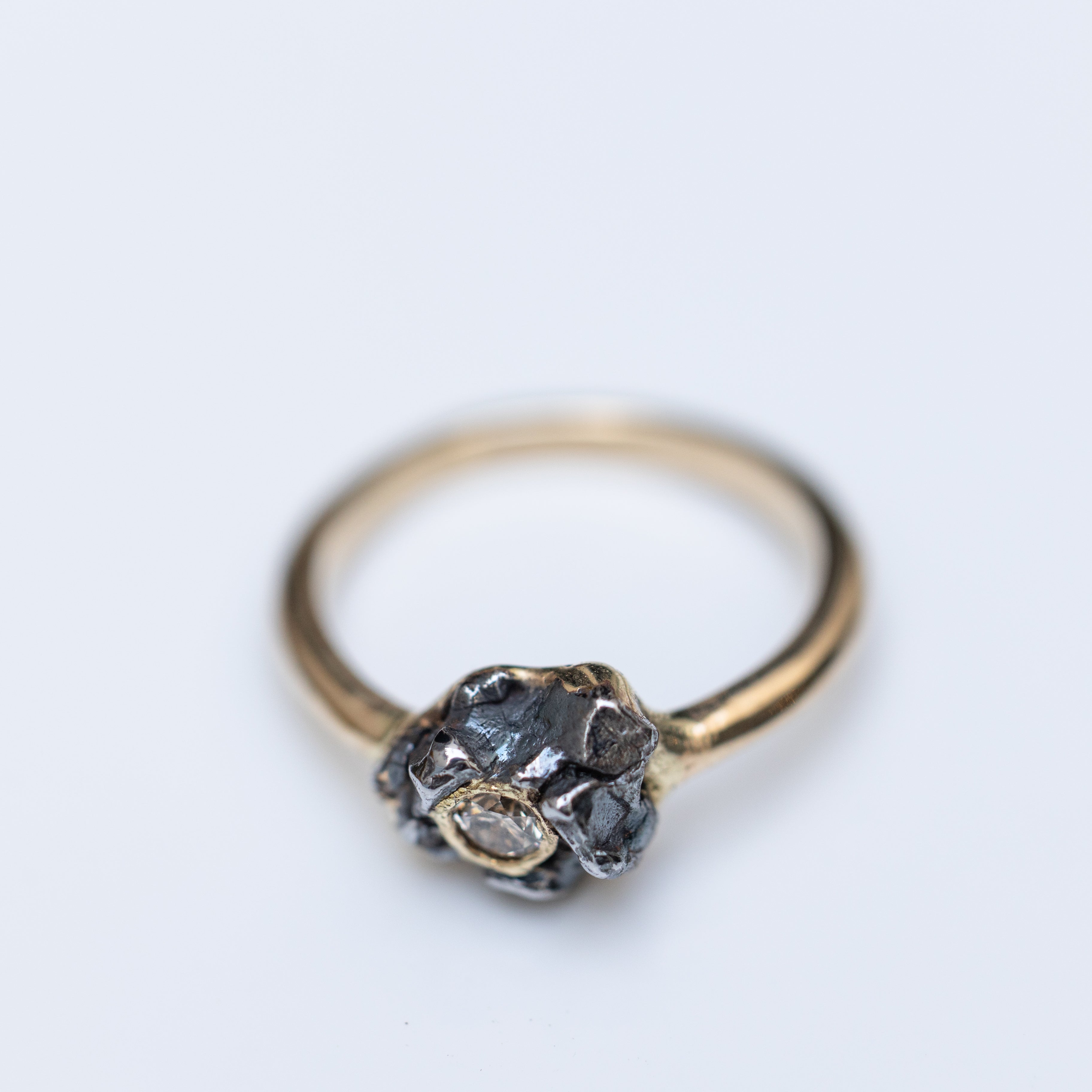 This ring features a duet of a 0.20ct champagne diamond and a "Campo del Cielo" meteorite set on a delicate 14k gold band. It beautifully combines two elements from our beloved collections into a unique design that highlights the contrast between the sparkling diamond and the dark meteorite. The diamond shines like a star against the backdrop of the meteorite.
