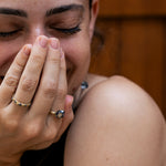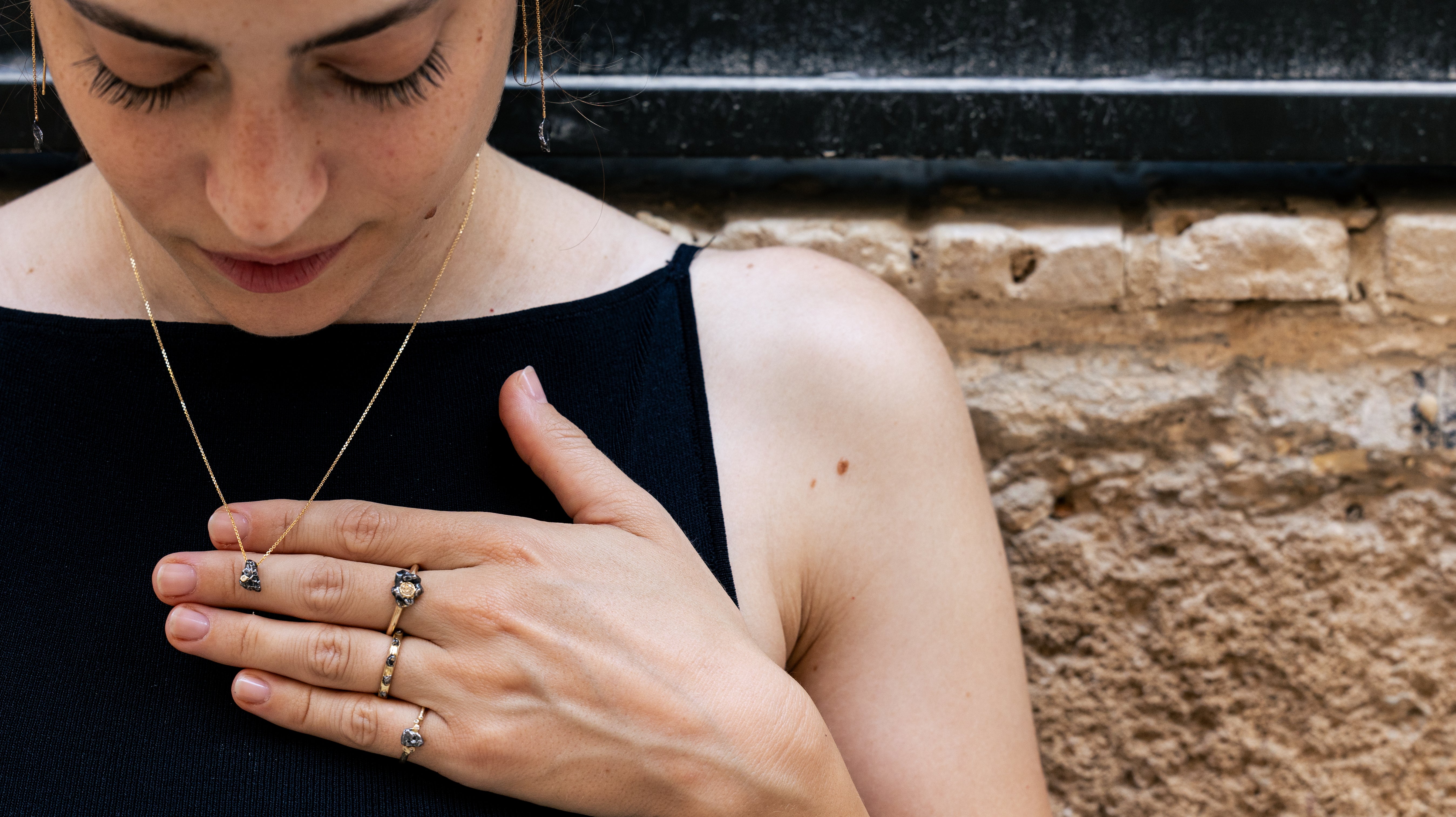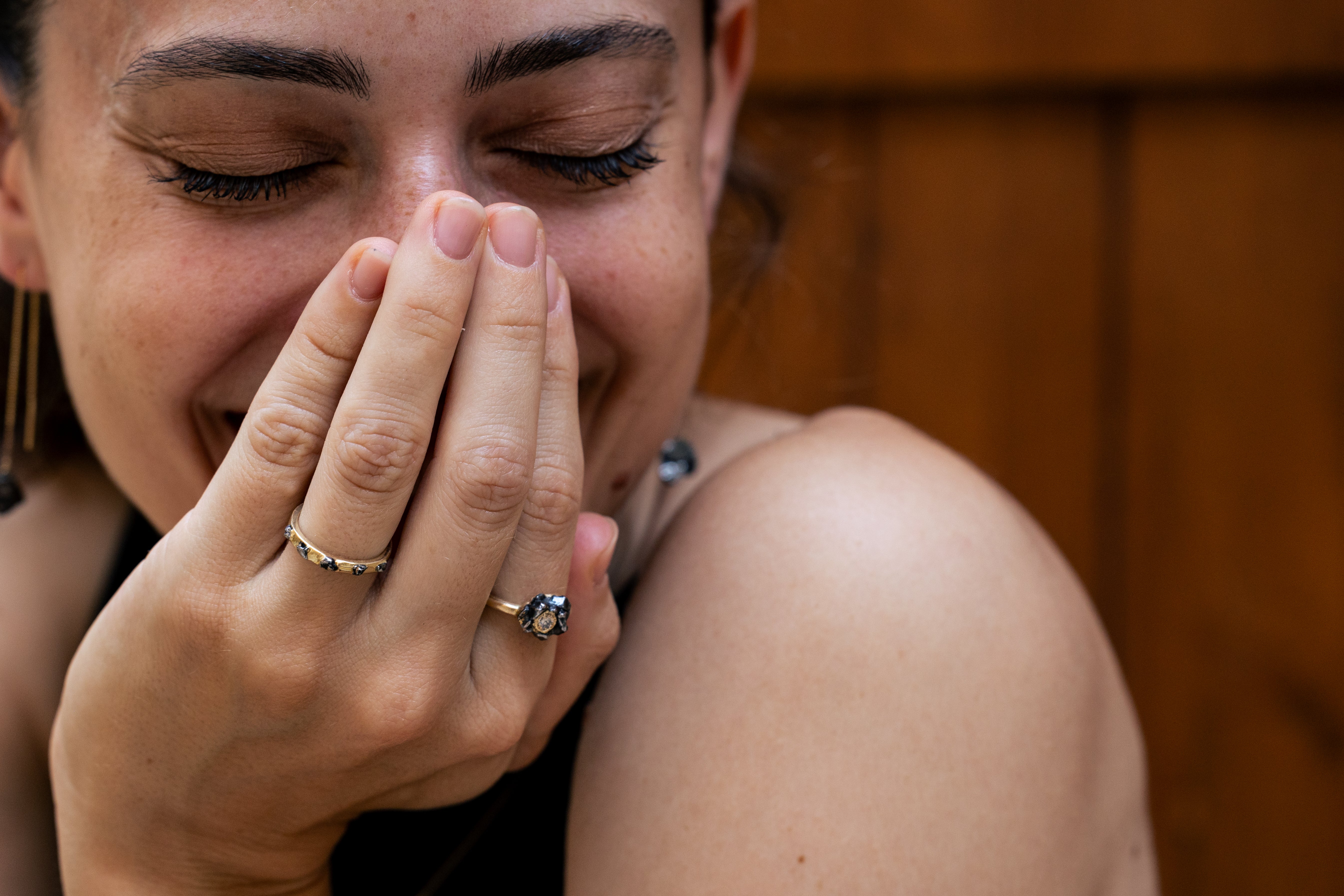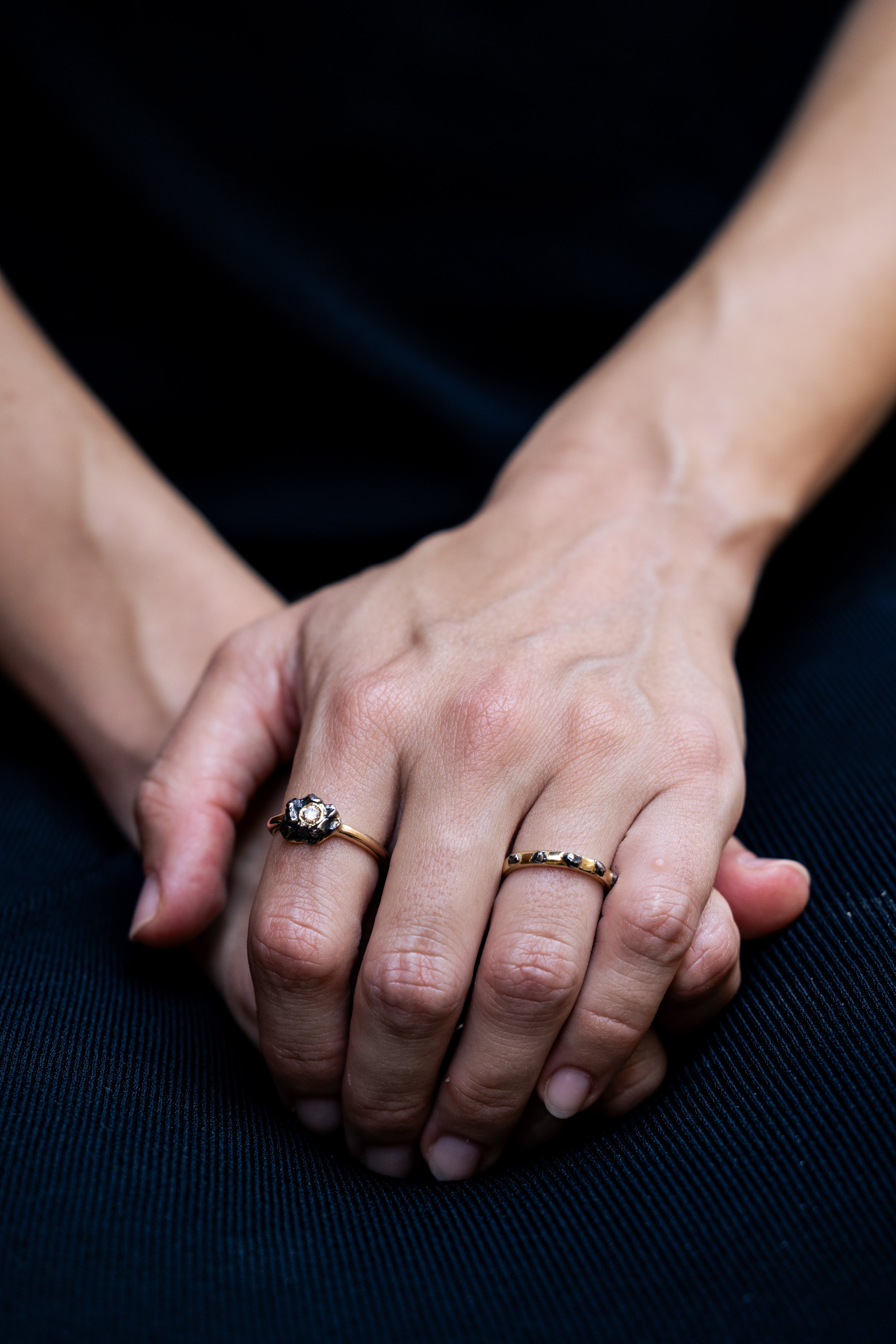 This ring features a duet of a 0.20ct champagne diamond and a "Campo del Cielo" meteorite set on a delicate 14k gold band. It beautifully combines two elements from our beloved collections into a unique design that highlights the contrast between the sparkling diamond and the dark meteorite. The diamond shines like a star against the backdrop of the meteorite.