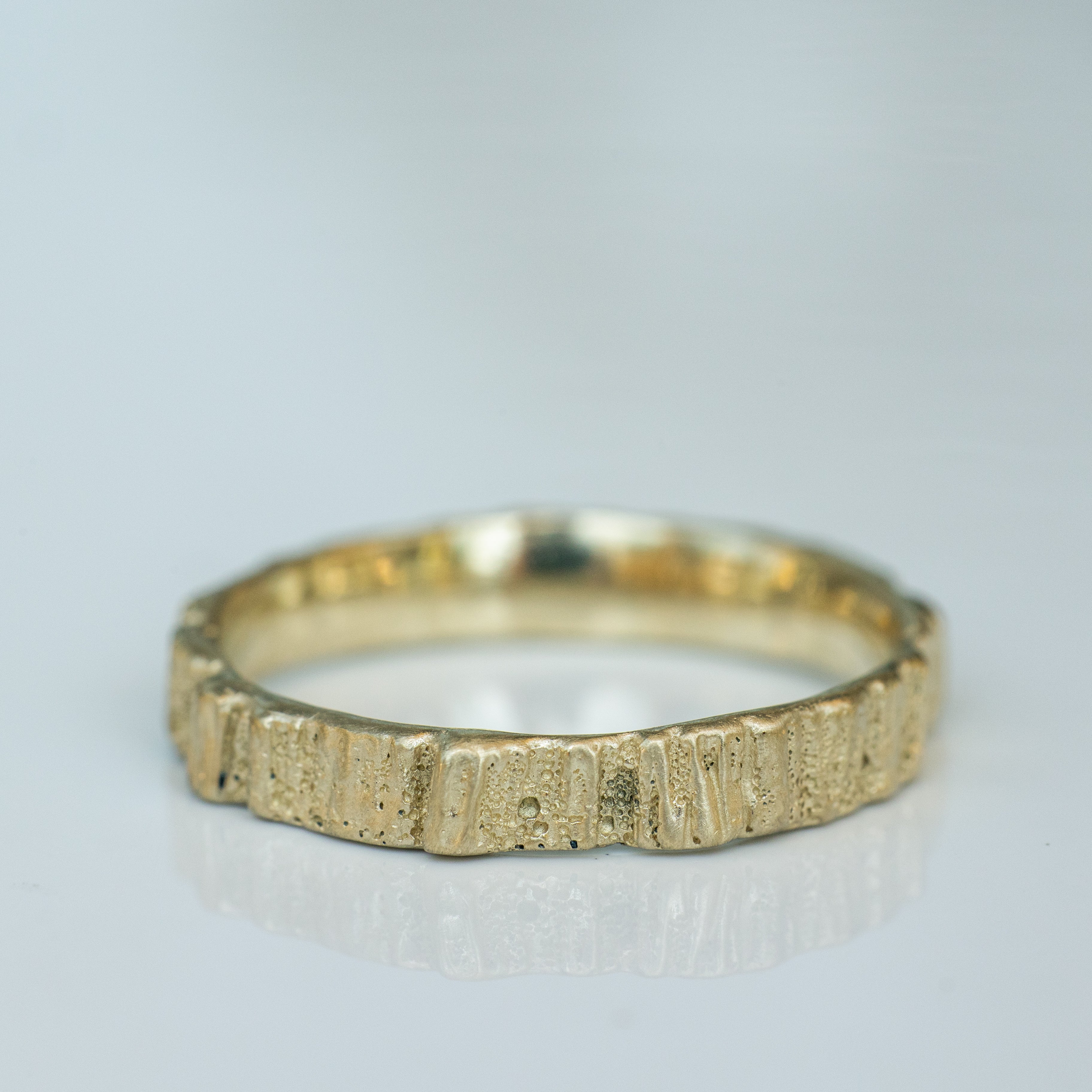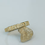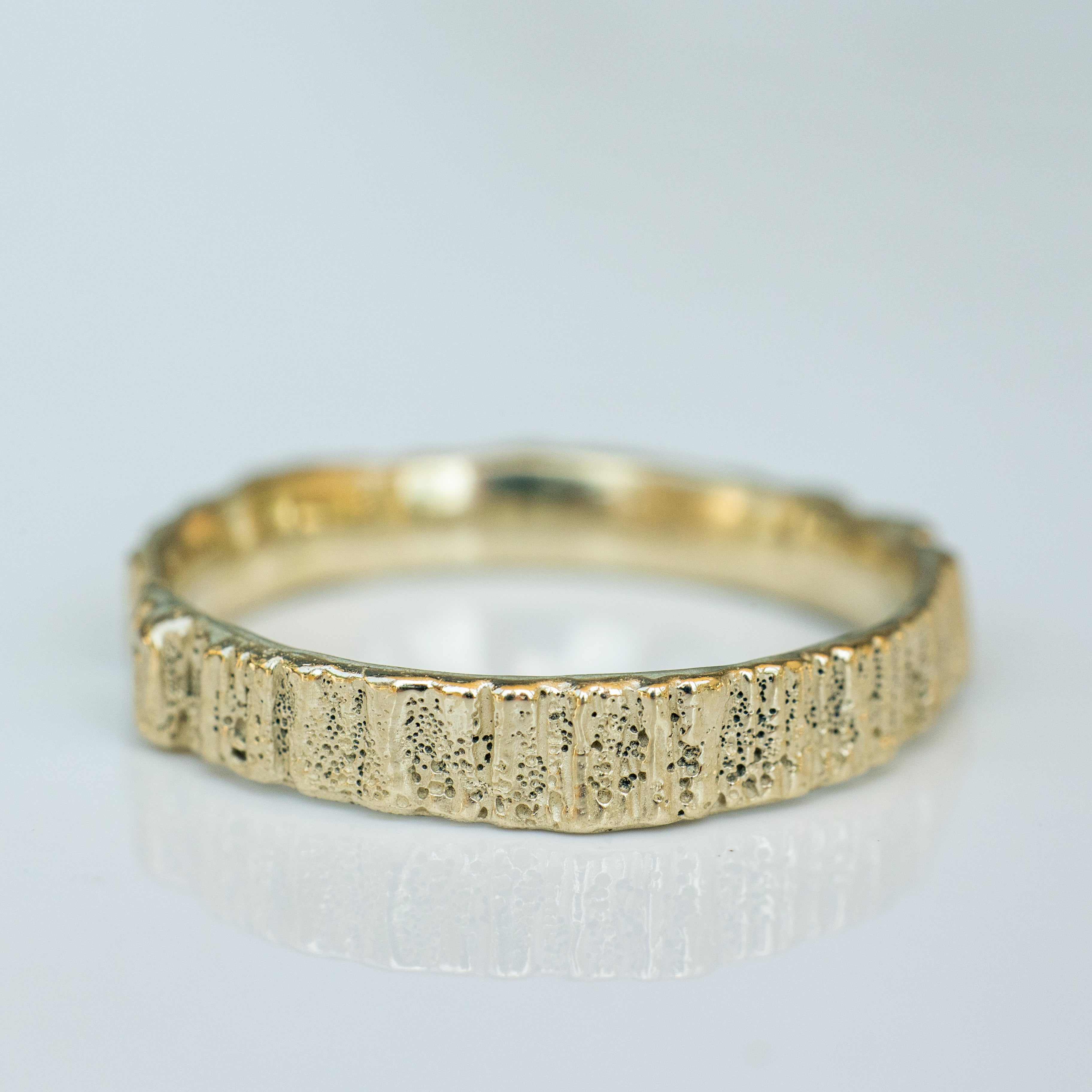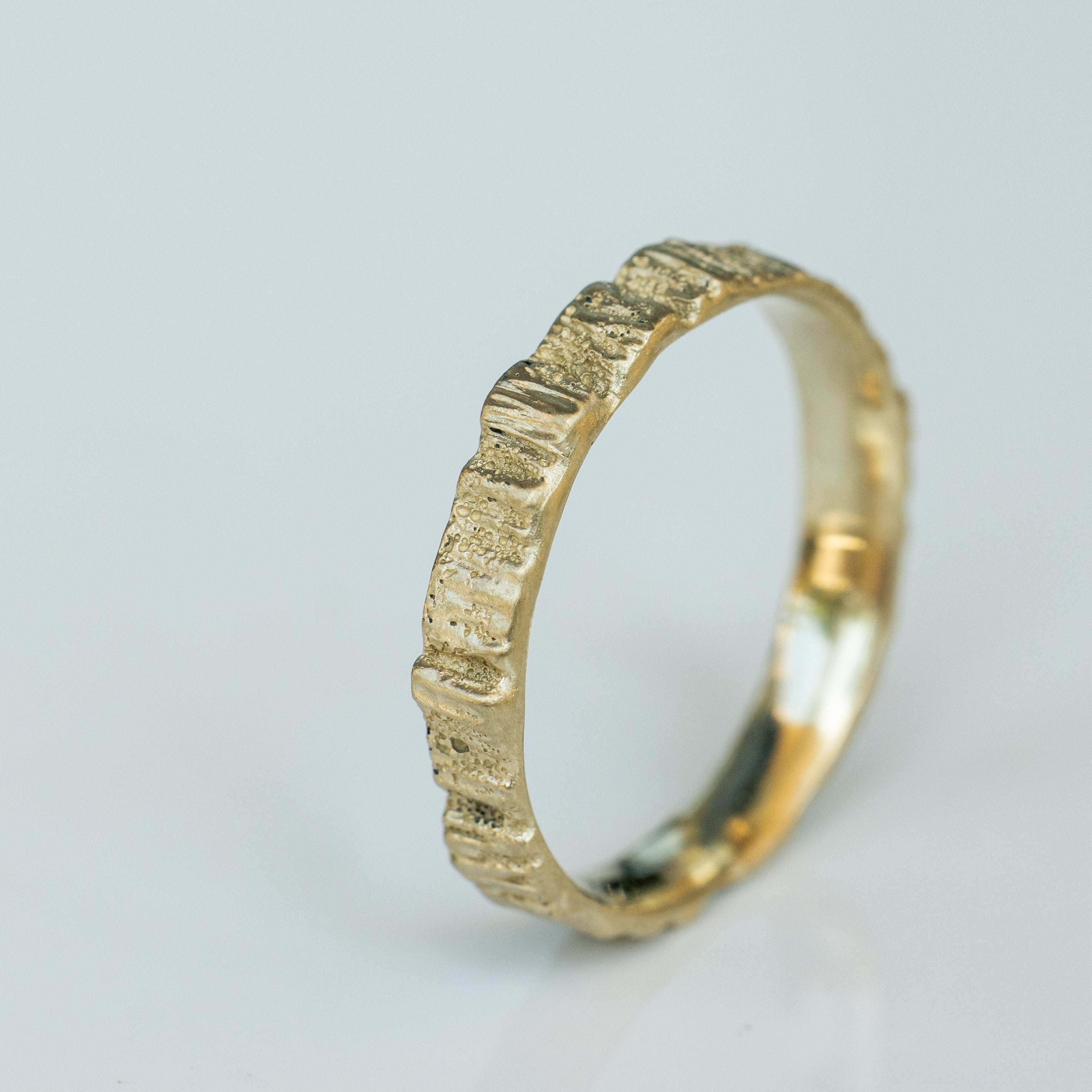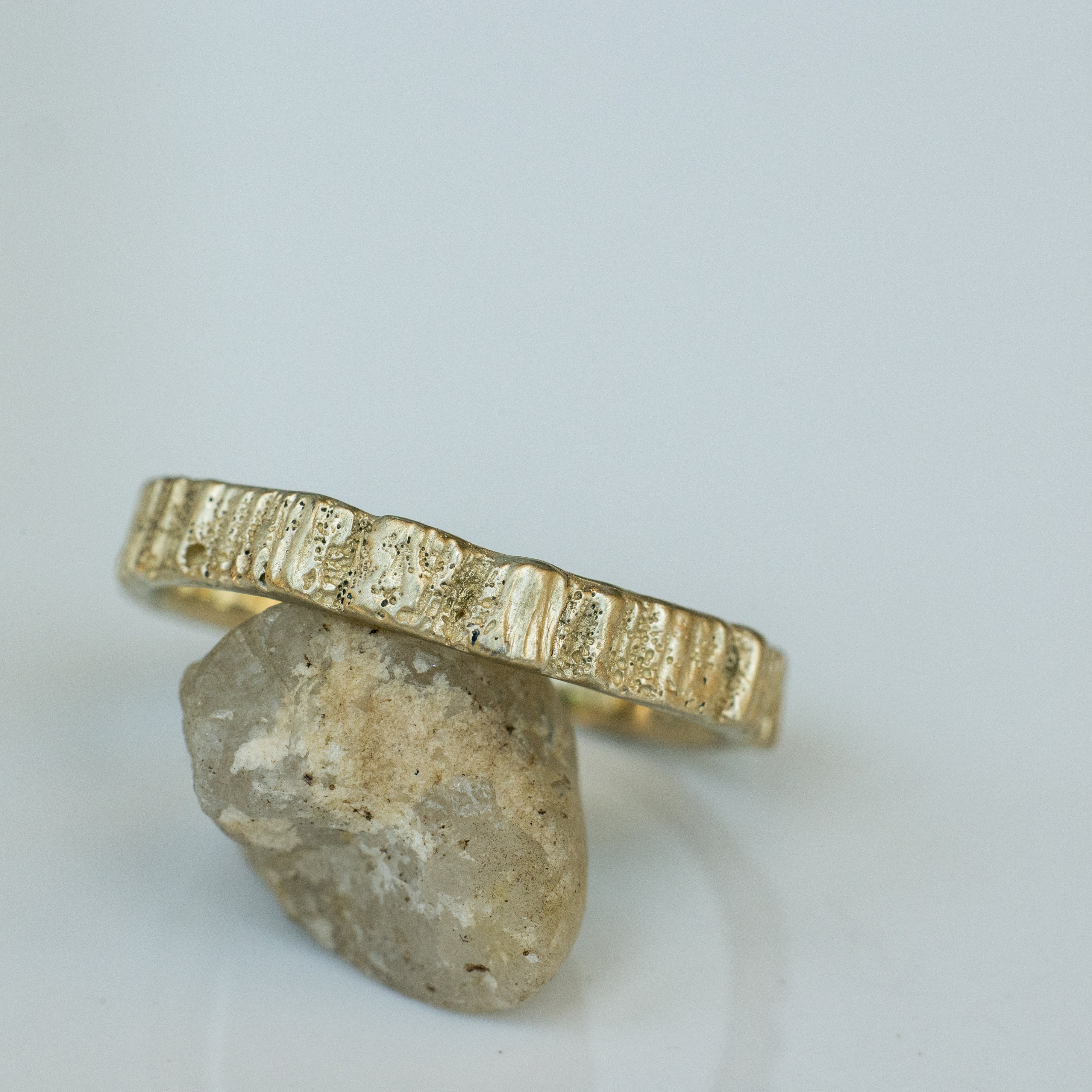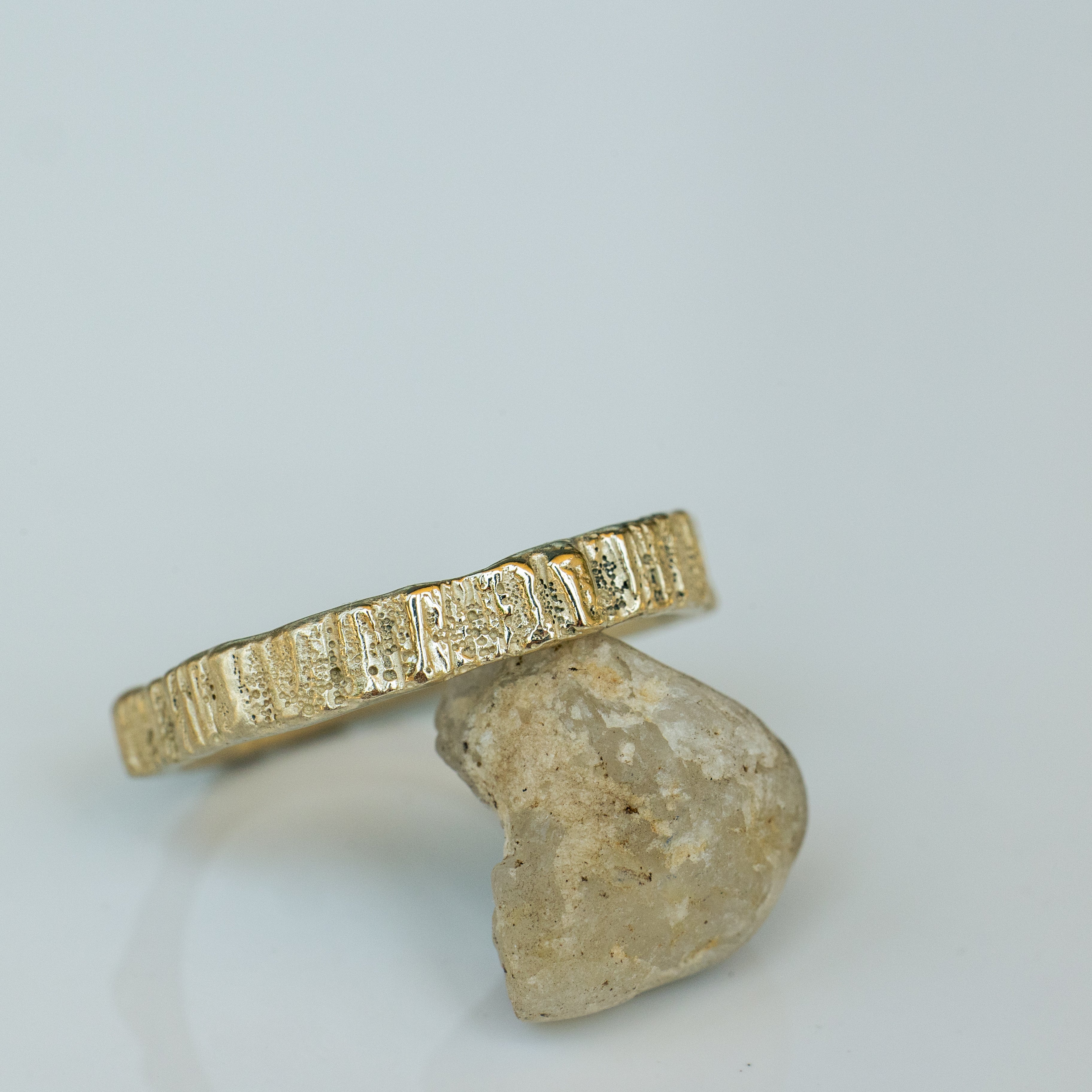 A 14k gold ring that has an organic, rough texture, natural in its look, with a grooved pattern. The ring is thin (3.5 mm width) and gentle in its presence and can fit as wedding band for all genders.