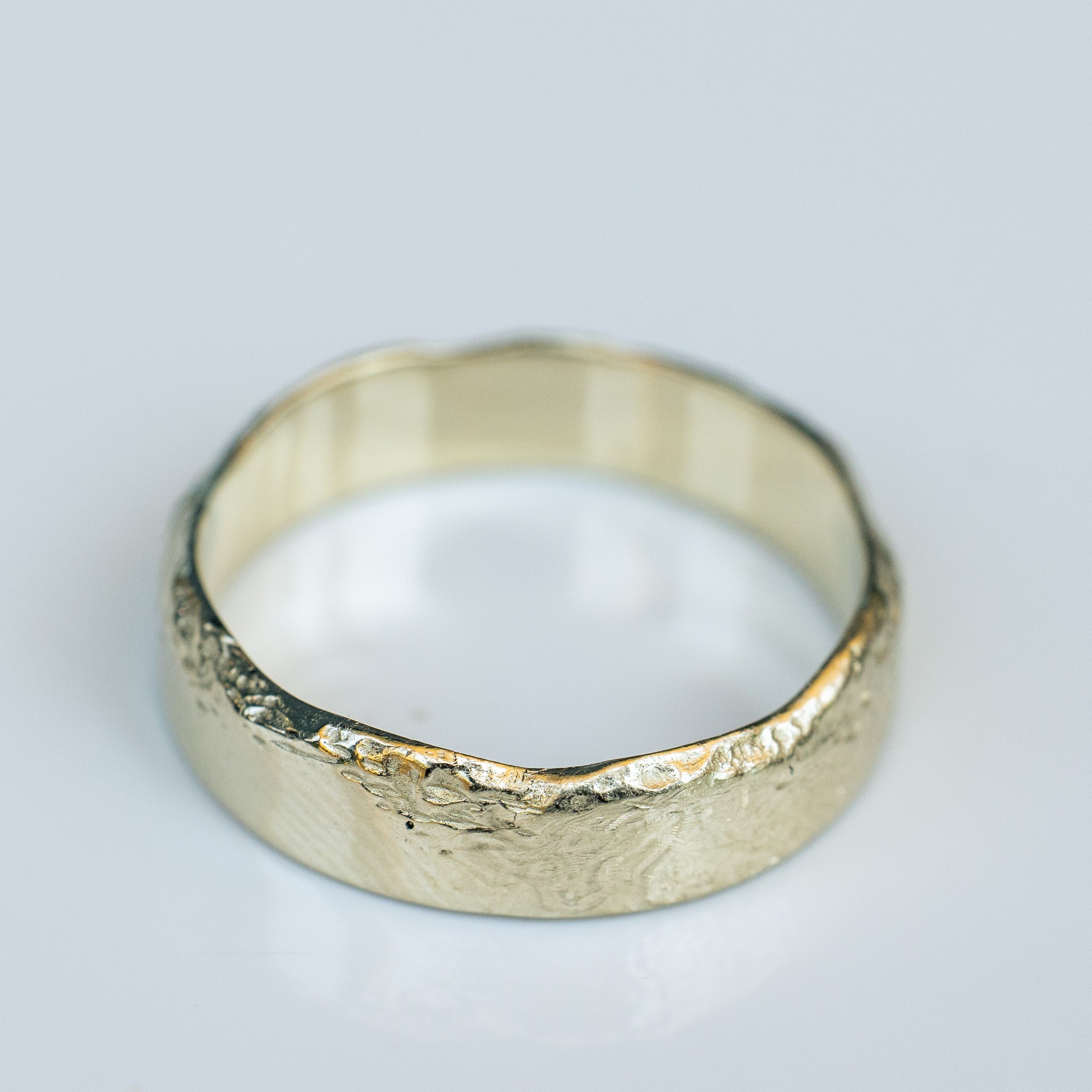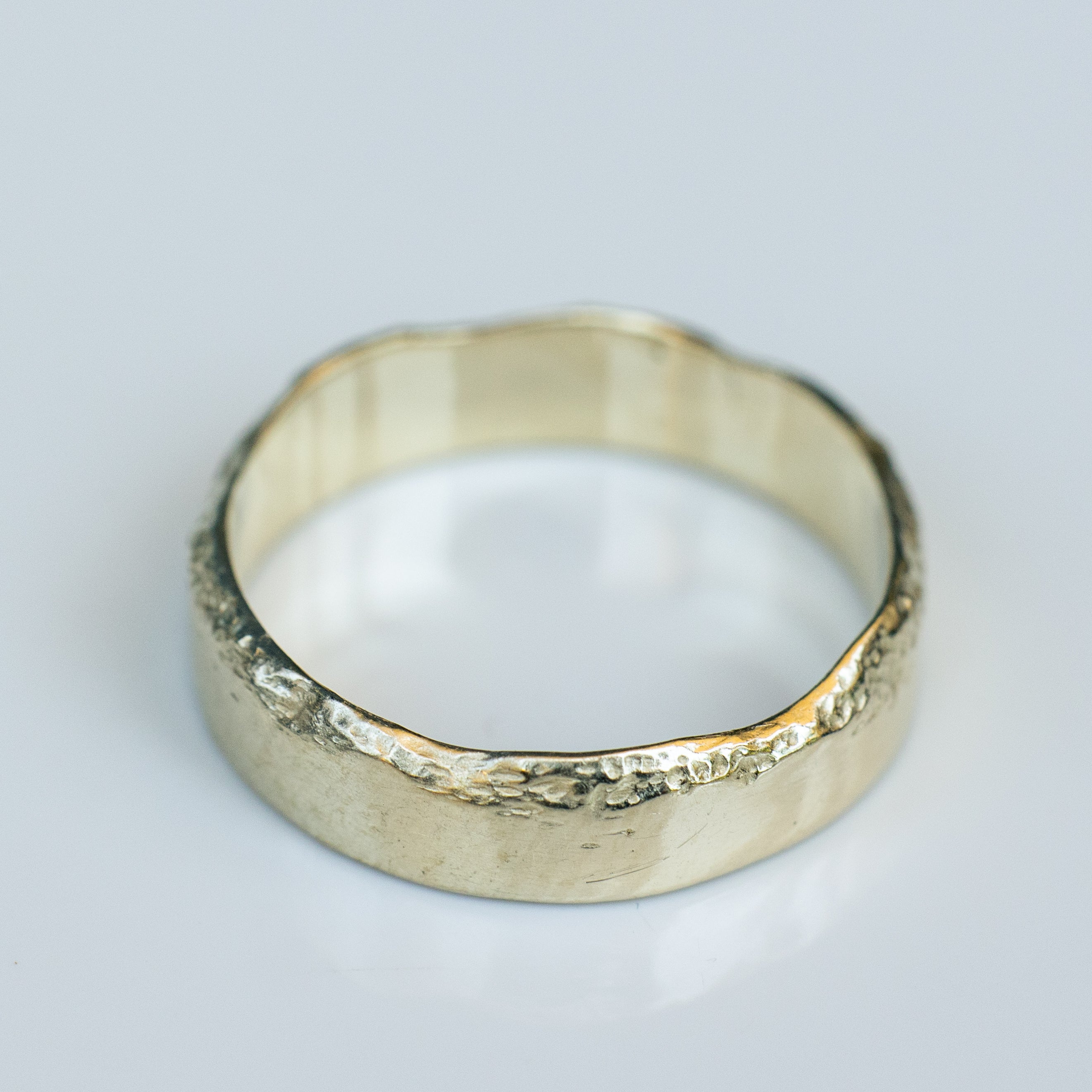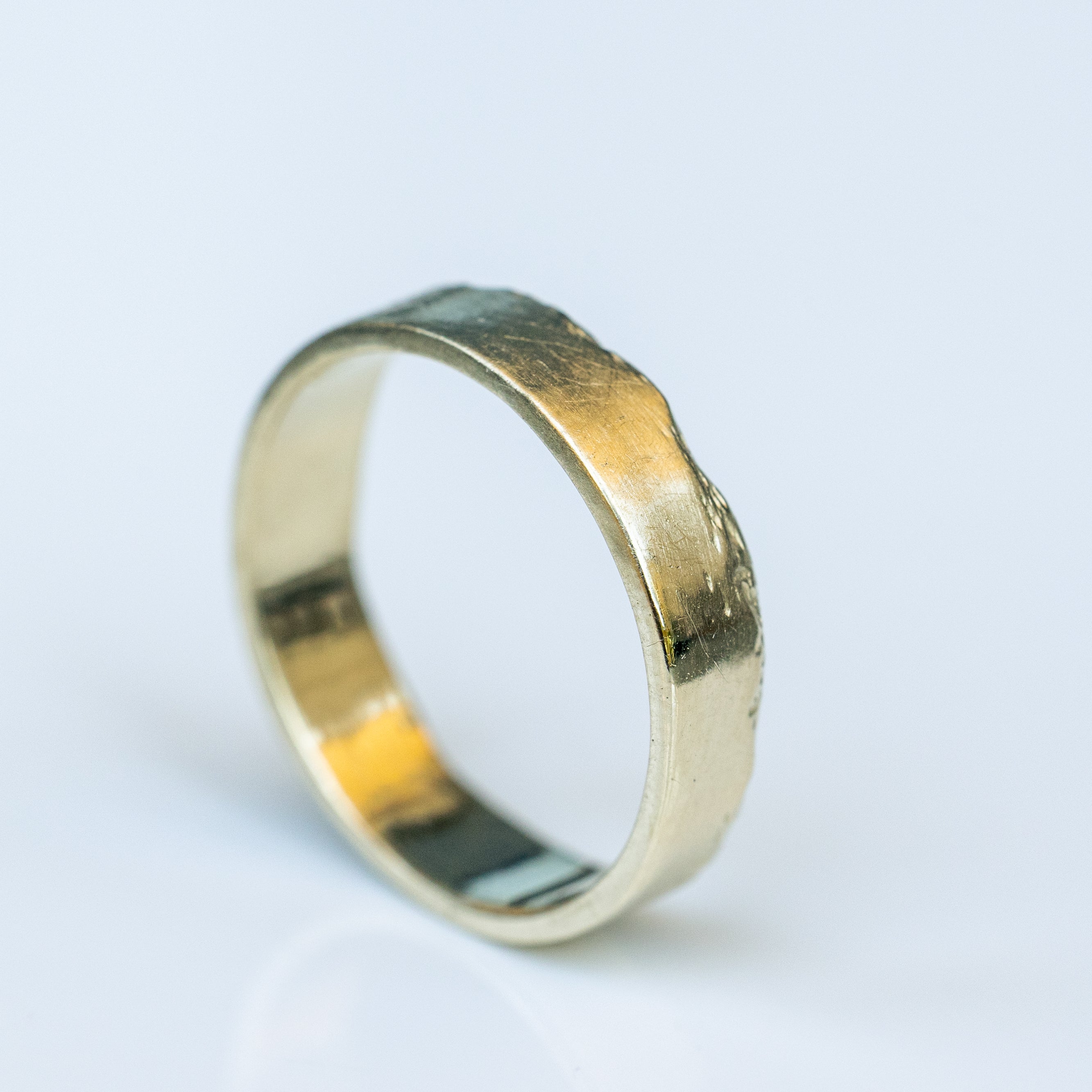 This 14K gold ring has a 4.5mm width and features a chiseled texture on one edge. The design highlights a beautiful contrast between the classic, smooth surface of the gold band and the imperfect, rough texture along the edge.