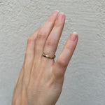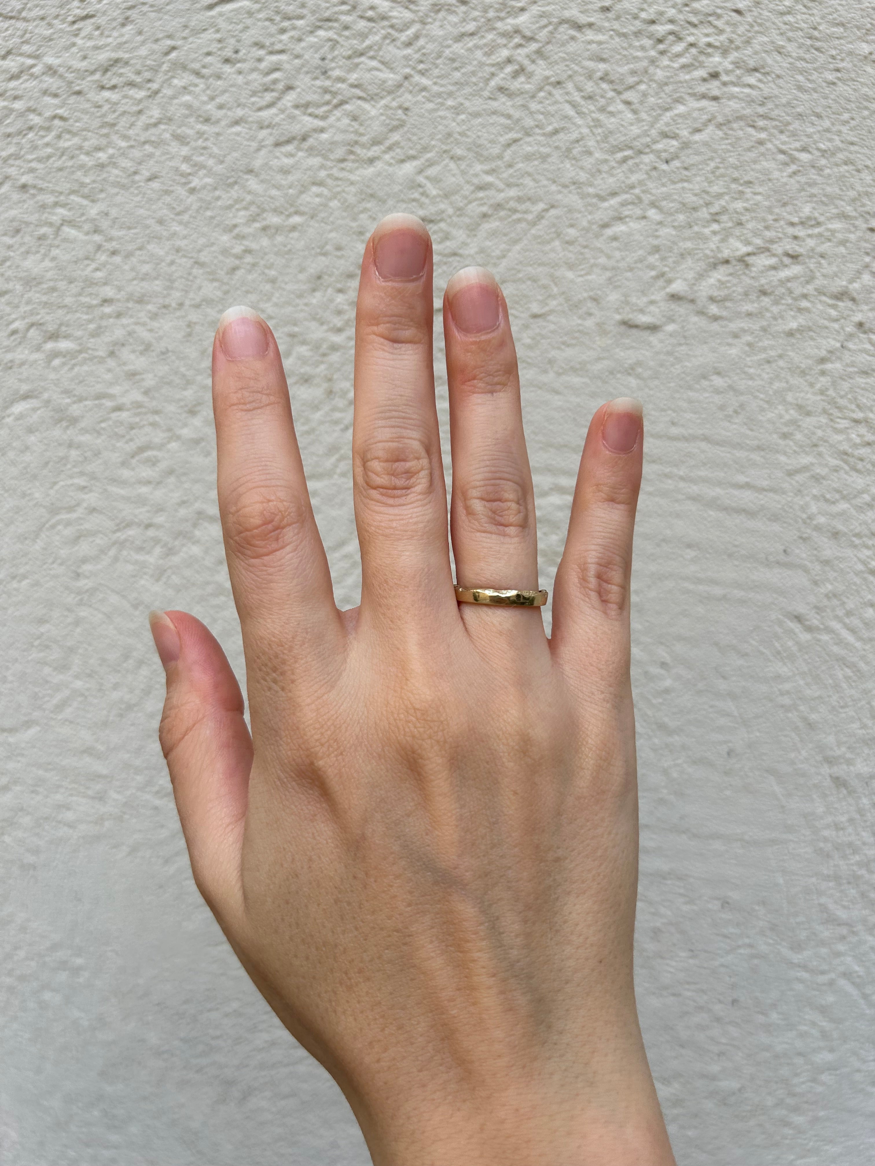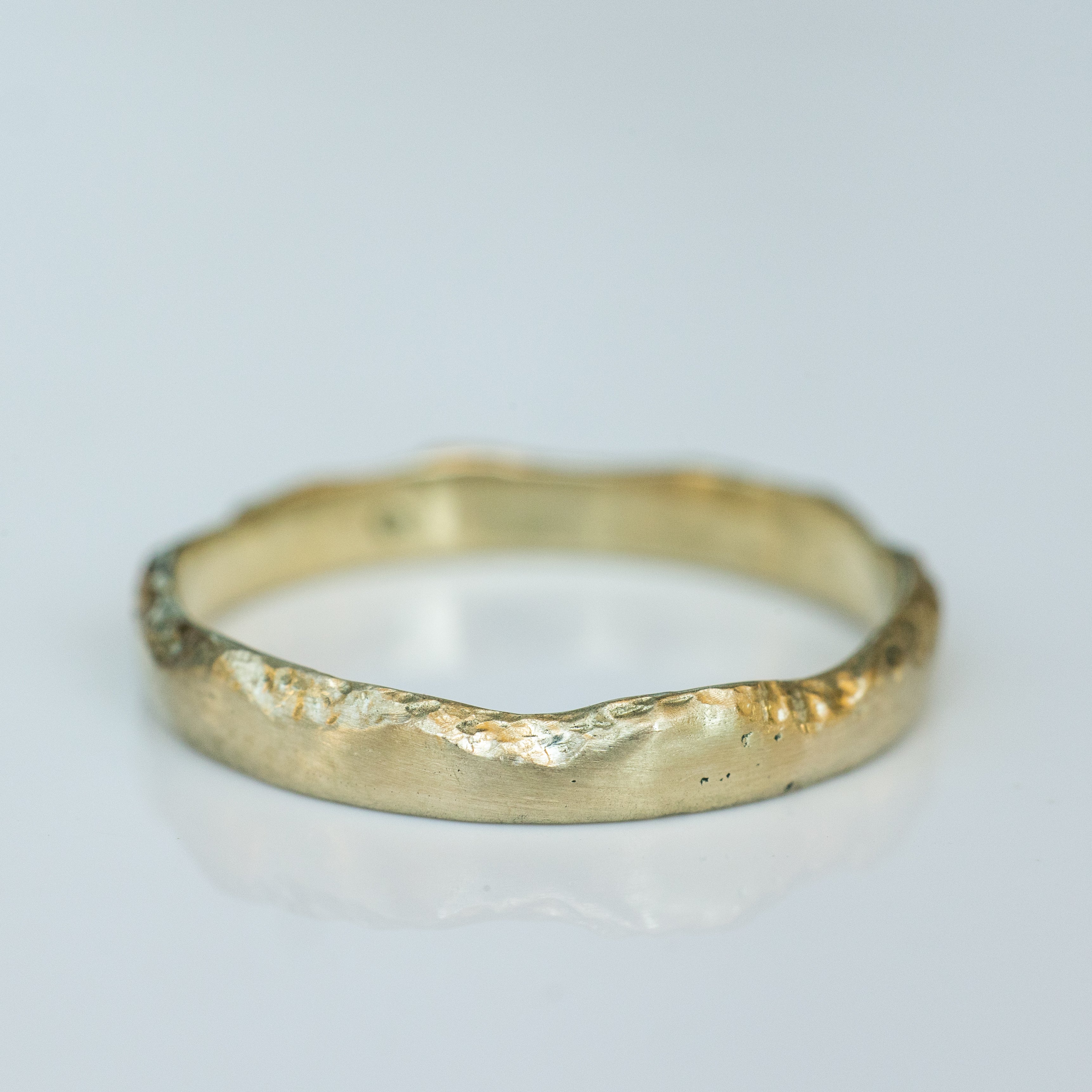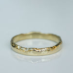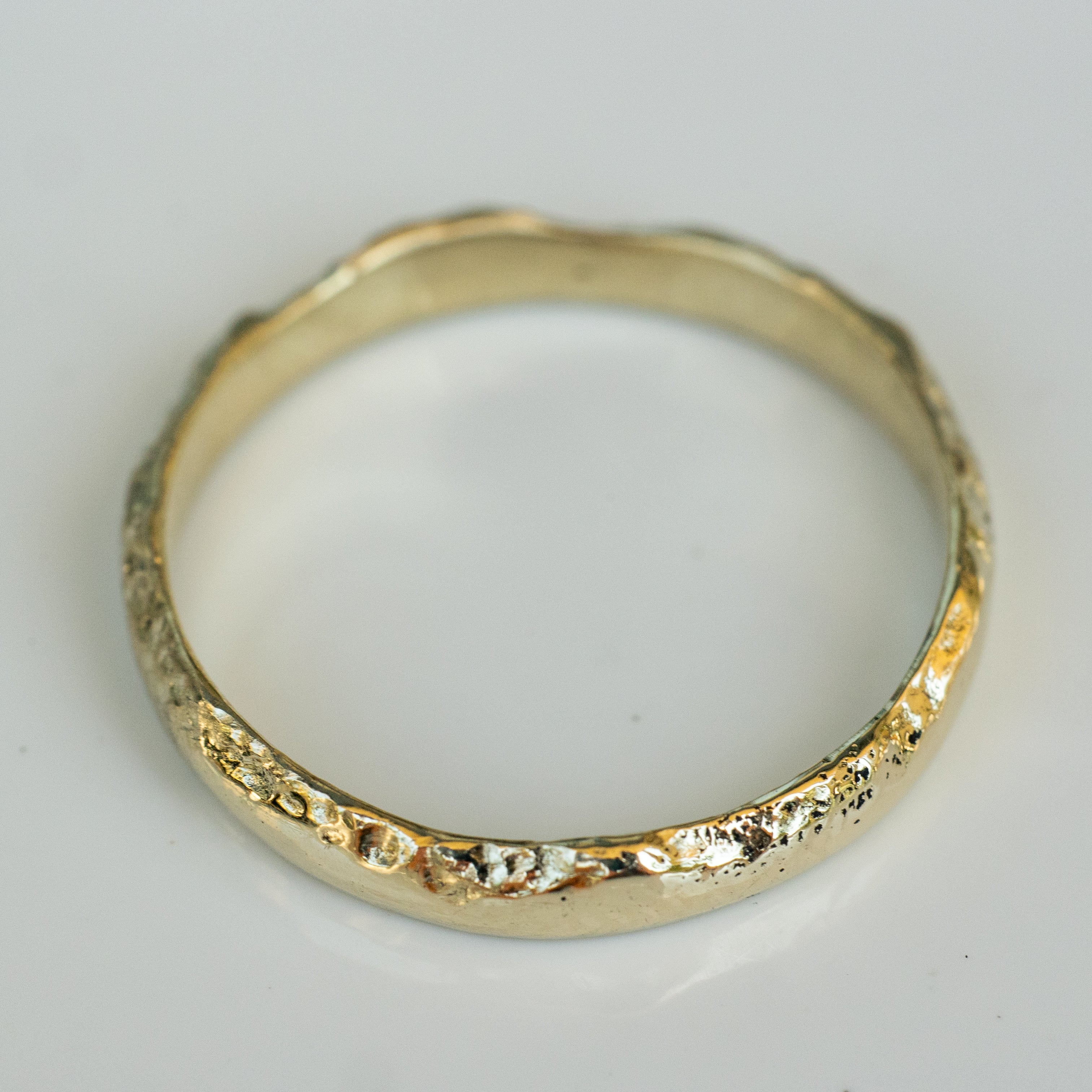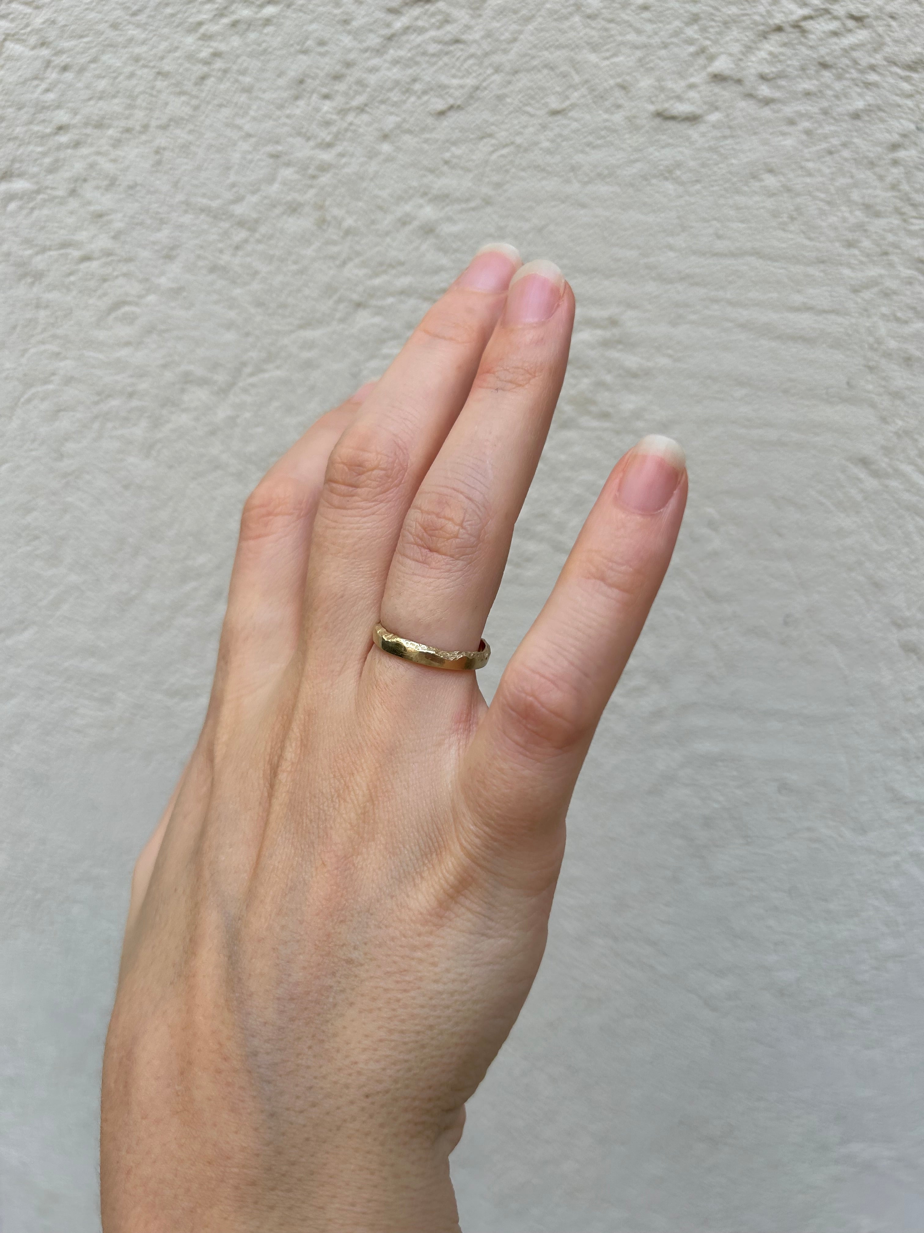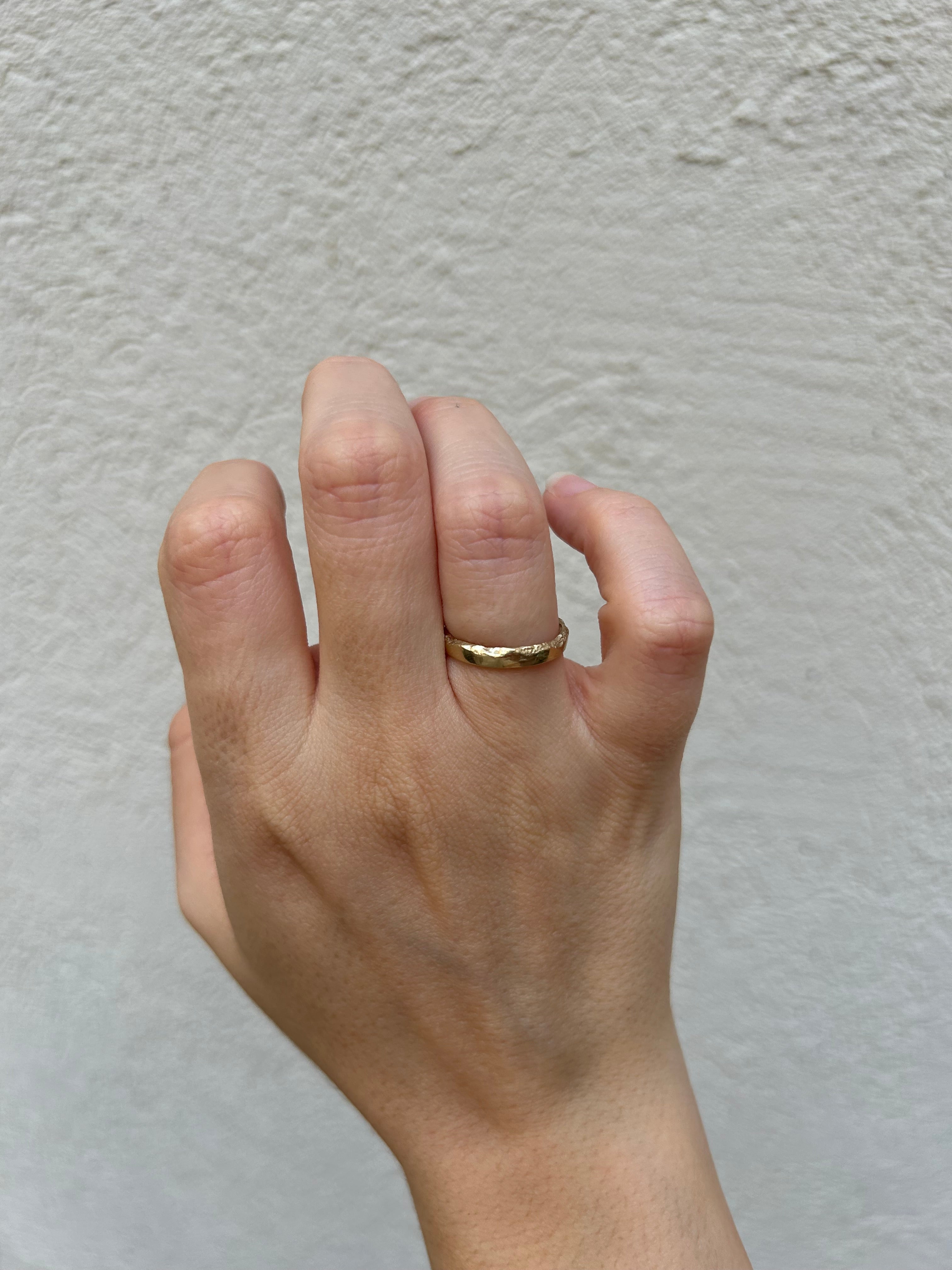 This 14K gold ring has a 3mm width and features a chiseled texture on one edge. The design highlights a beautiful contrast between the classic, smooth surface of the gold band and the imperfect, rough texture along the edge.