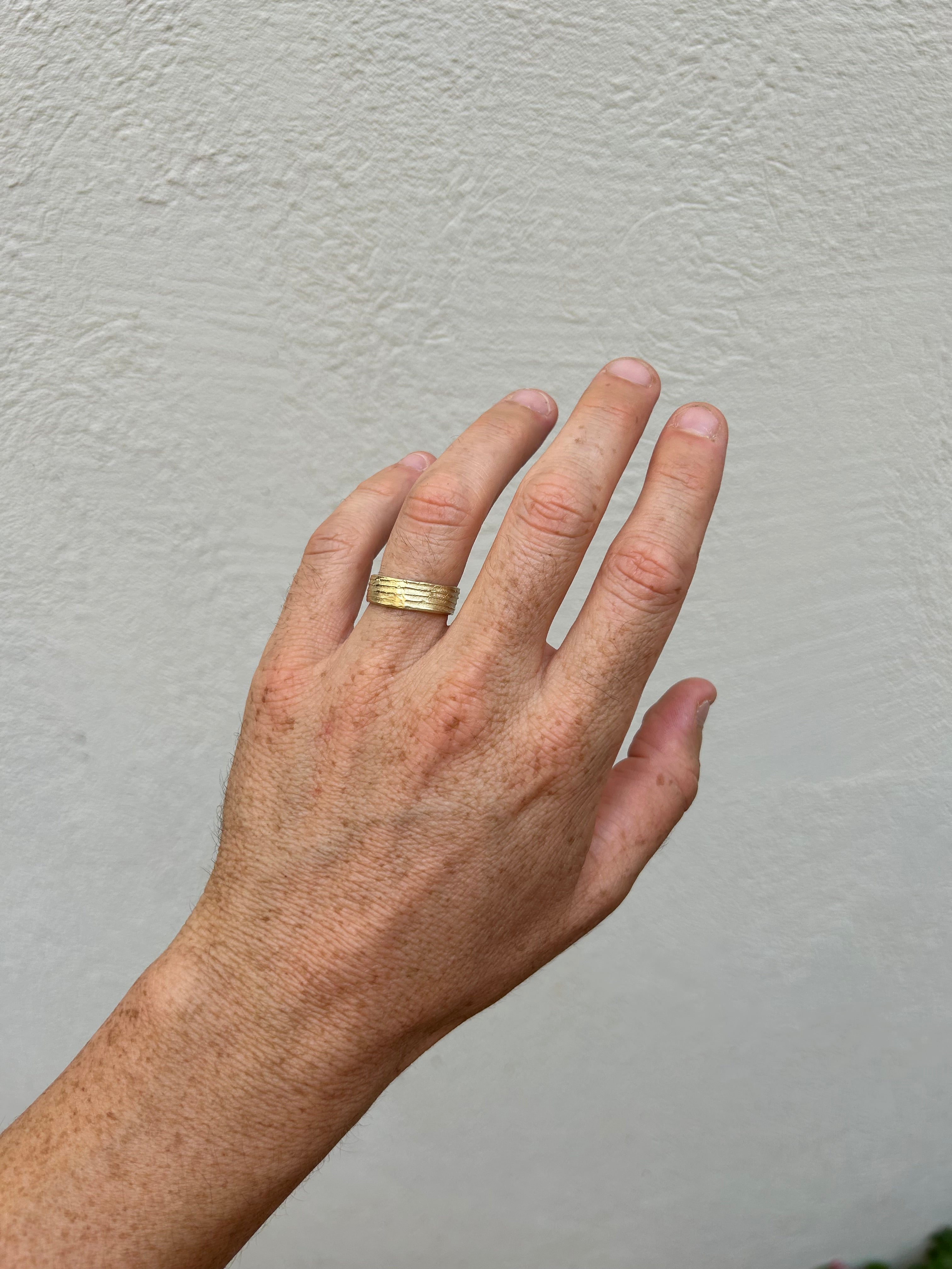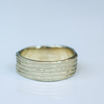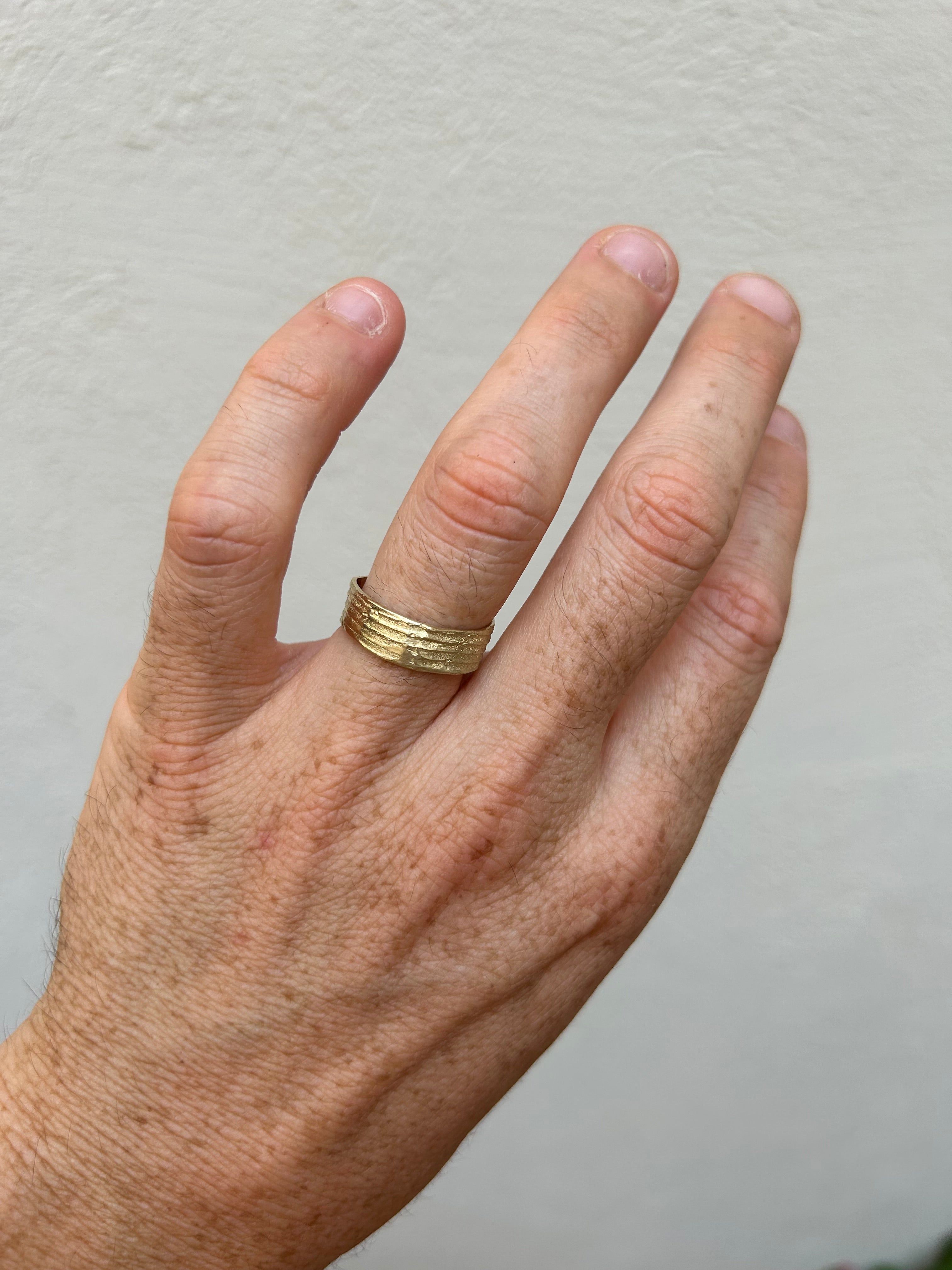 This 14k gold ring measures 6.5 mm and features a design inspired by the natural texture of coal, all cast in solid gold. The ring beautifully combines organic and structured looks, making it an excellent choice for a wedding band.