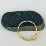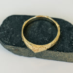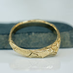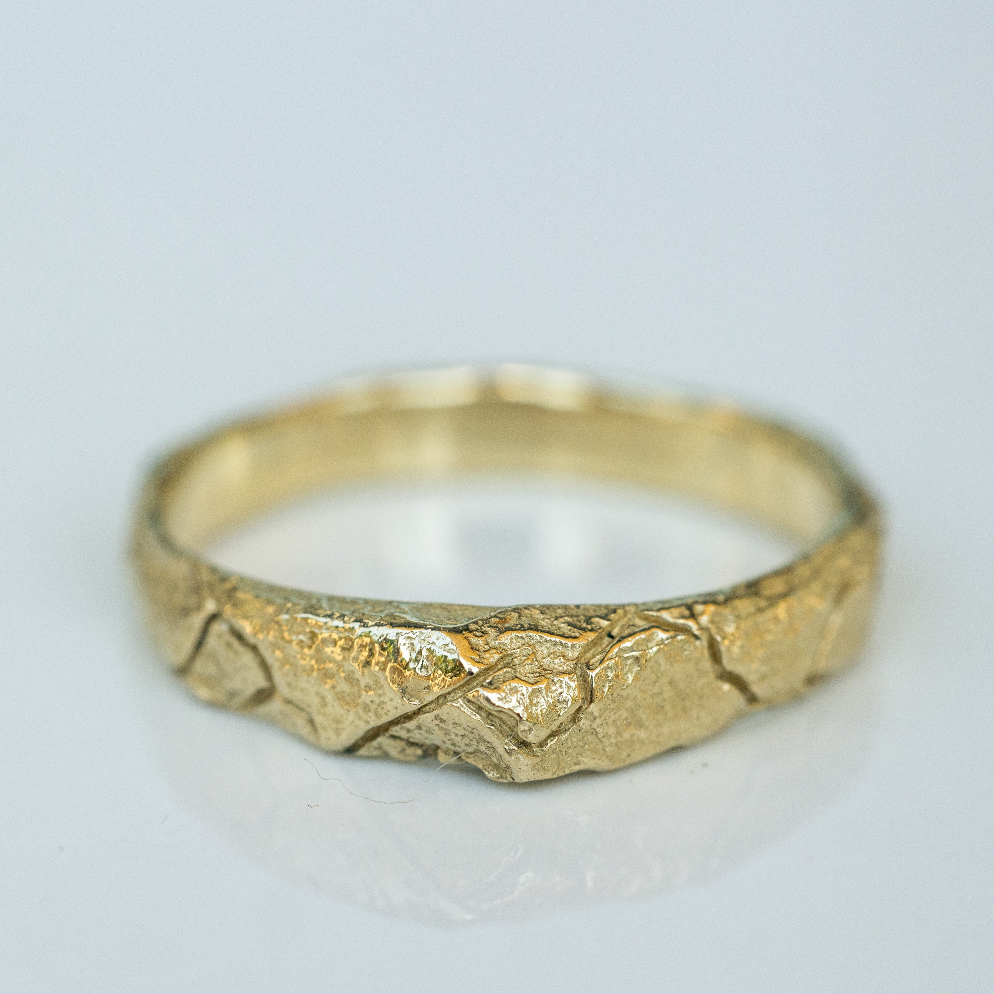 This 14K raw gold band features an organic, rough texture inspired by the intricate patterns of cracked earth. The width of the band varies slightly, measuring 2.5 mm to 3.3 mm at the top, where a small cone shape adds a unique touch to the design.