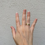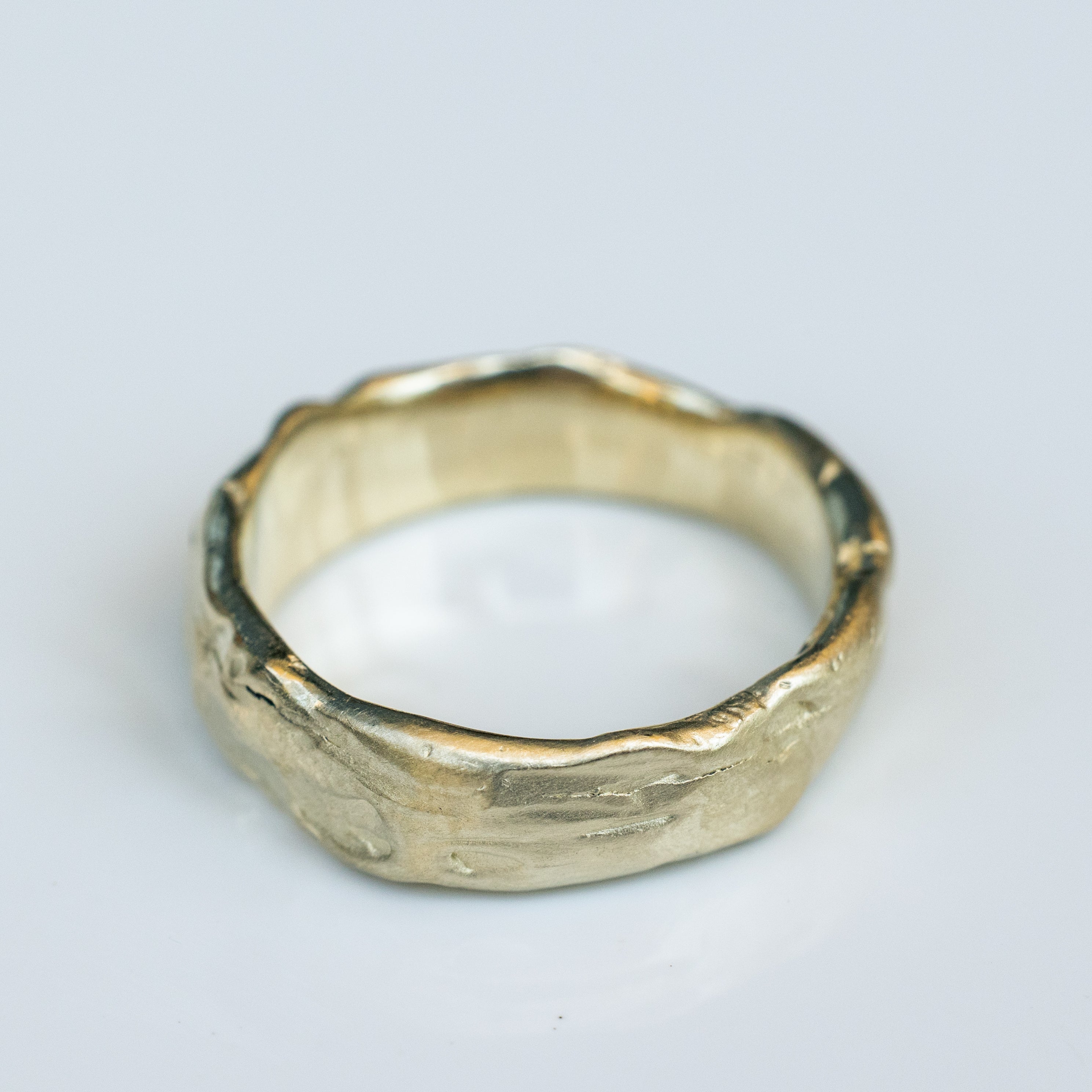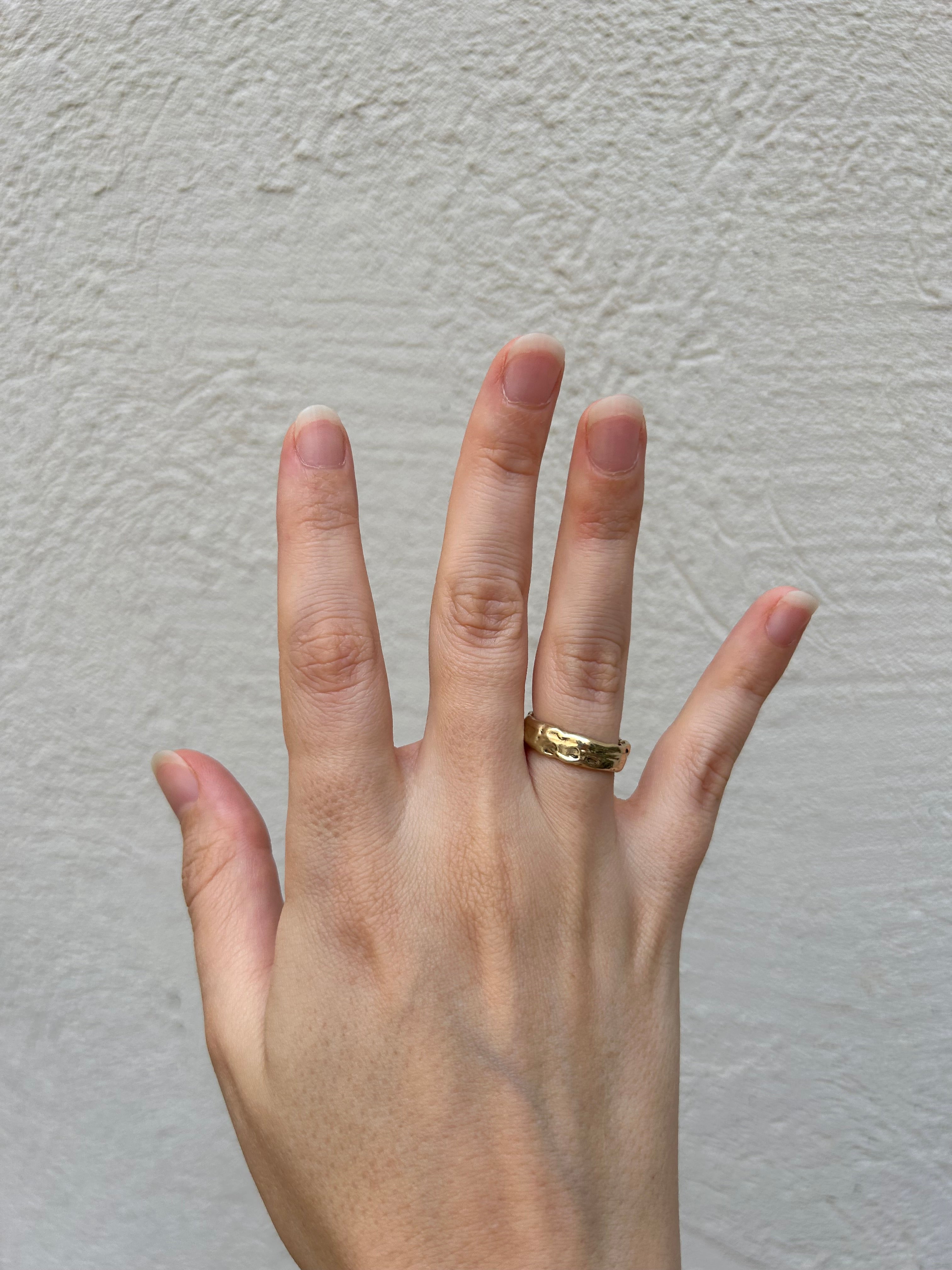 Its wide 5–6 mm band with gently uneven edges creates a bold yet refined presence, catching and reflecting light in ever-changing patterns. The organic surface gives the piece a harmonious balance of strength and softness, making it comfortable to wear.