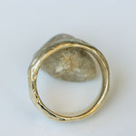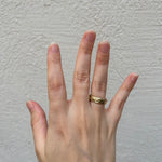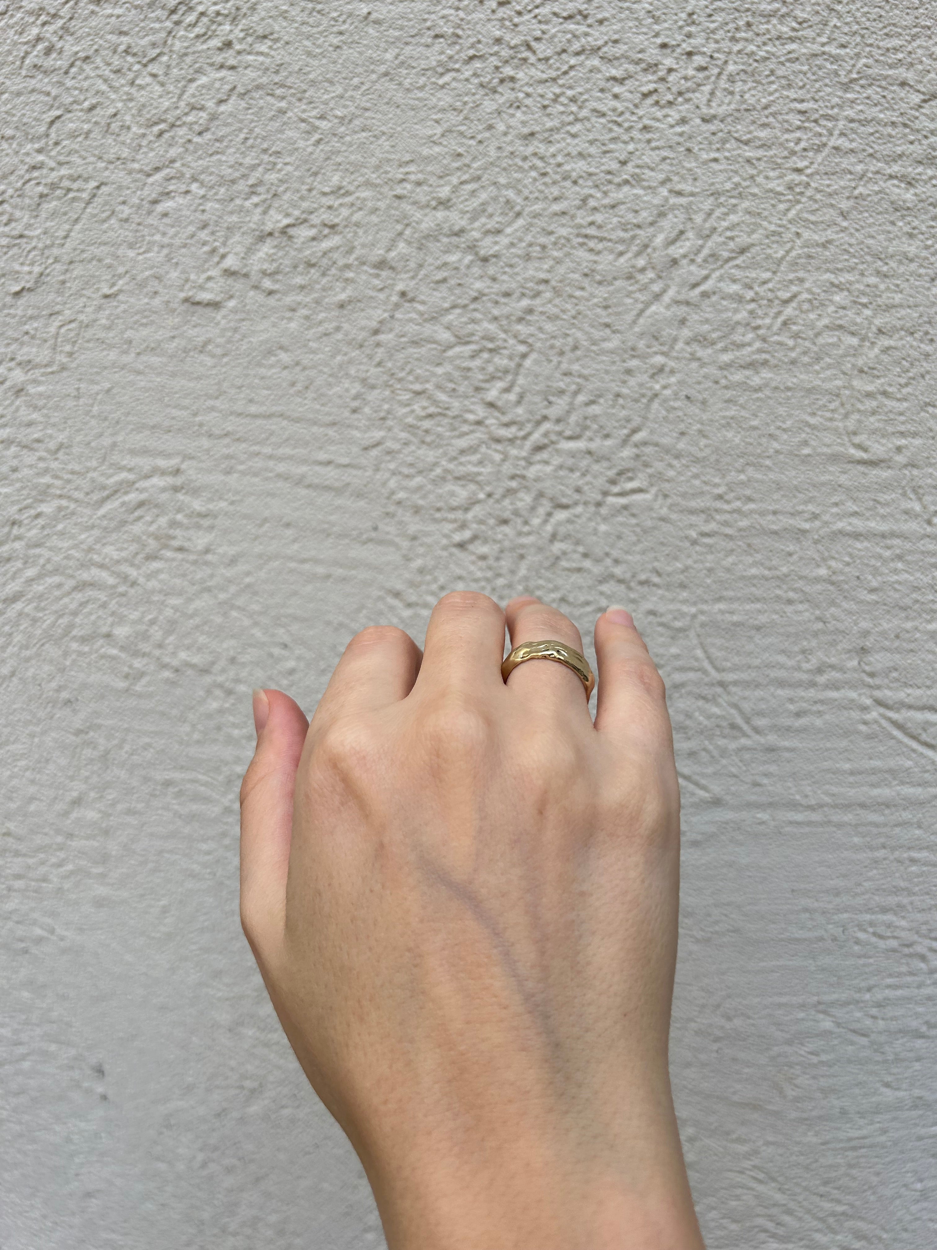 This handcrafted 14k gold ring features a flowing, liquid-like texture, reminiscent of molten material in motion.