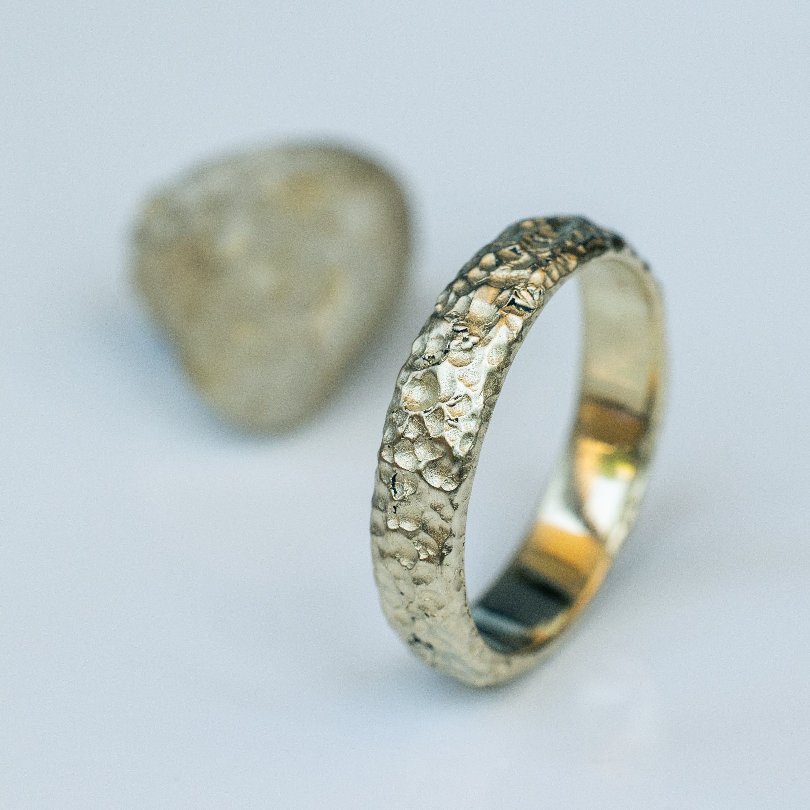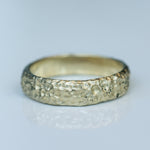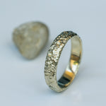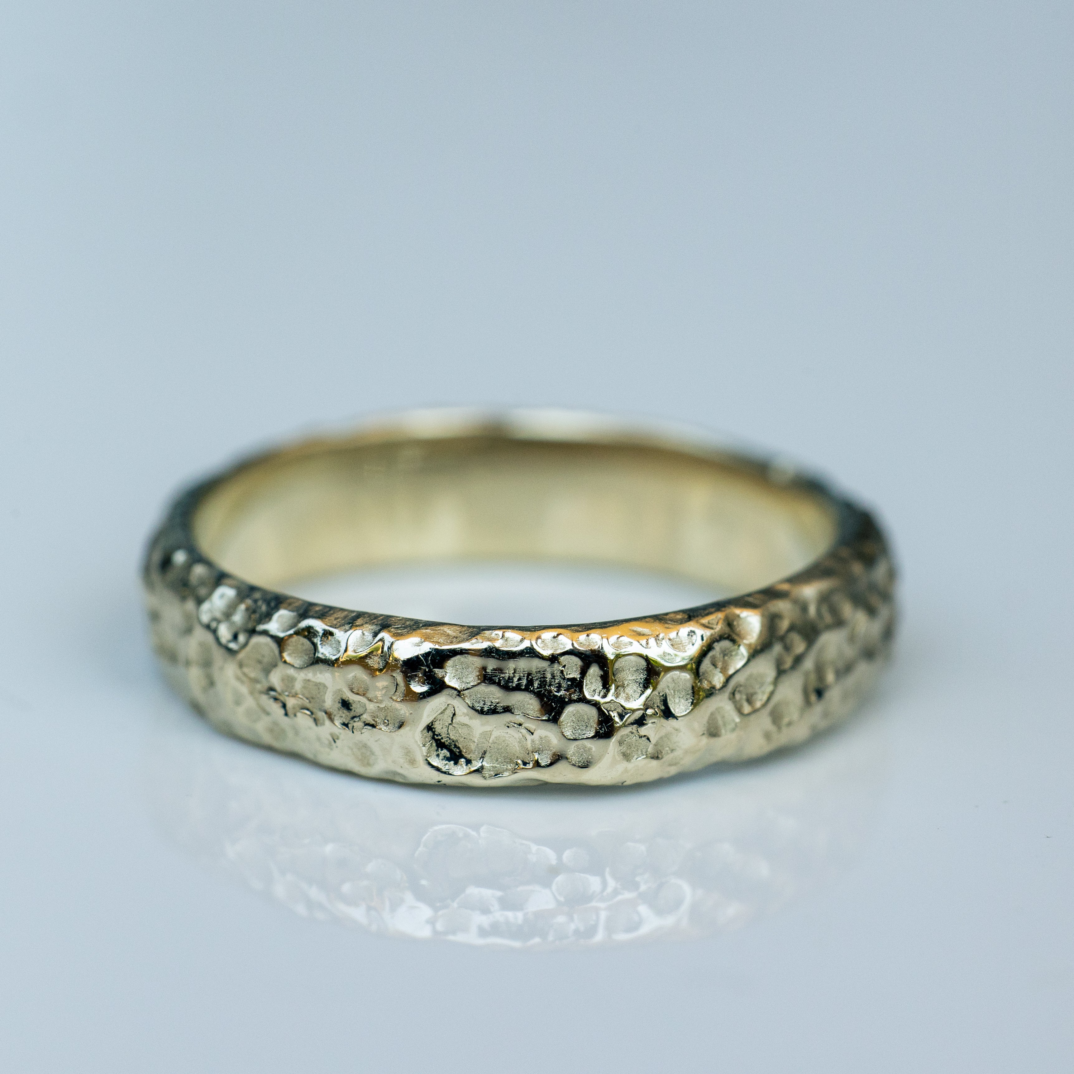 This 14K gold ring features a 4 mm wide half-round profile with a rough surface that resembles the beautiful texture of coral, as if it were just retrieved from the depths of the sea.