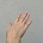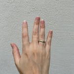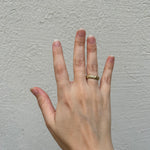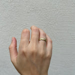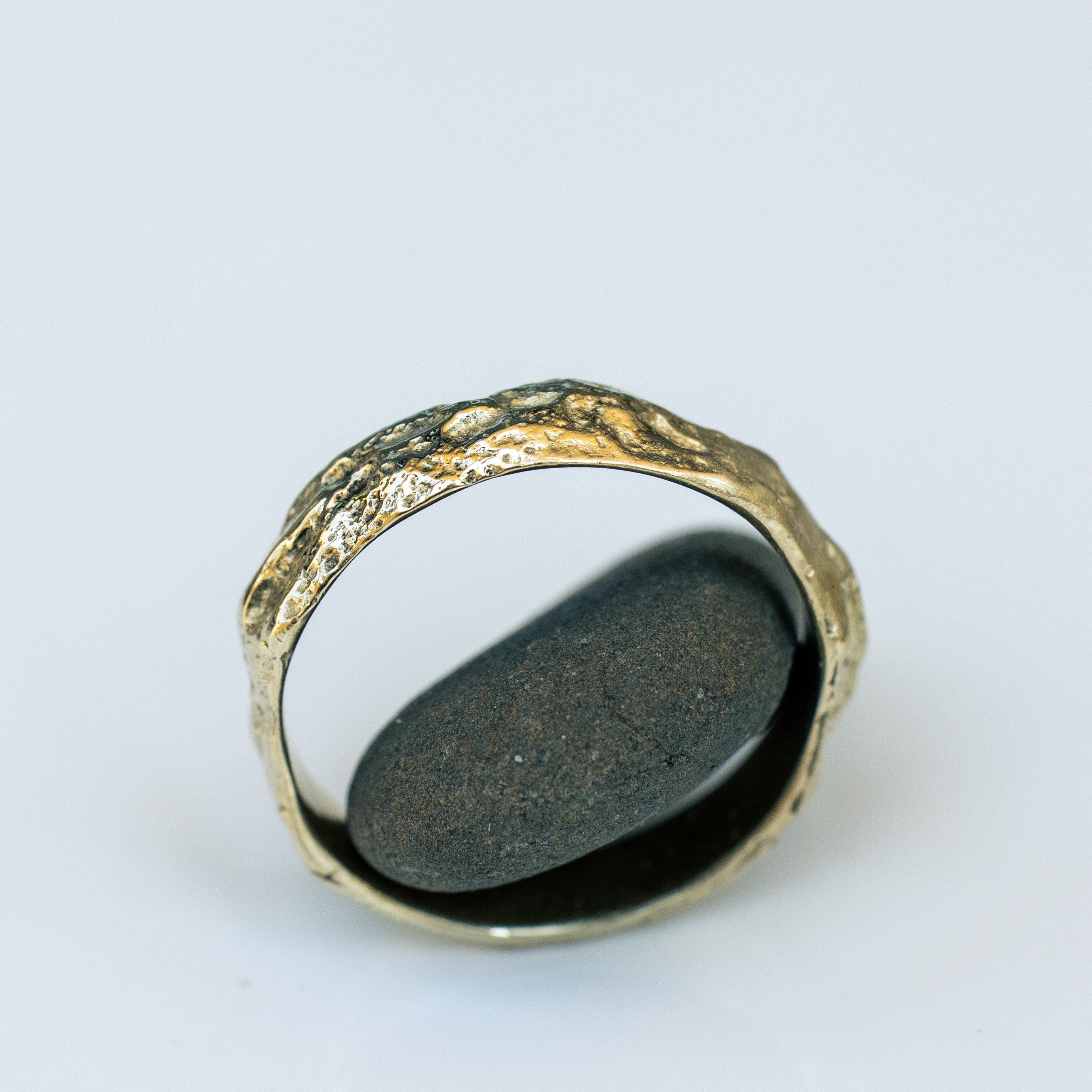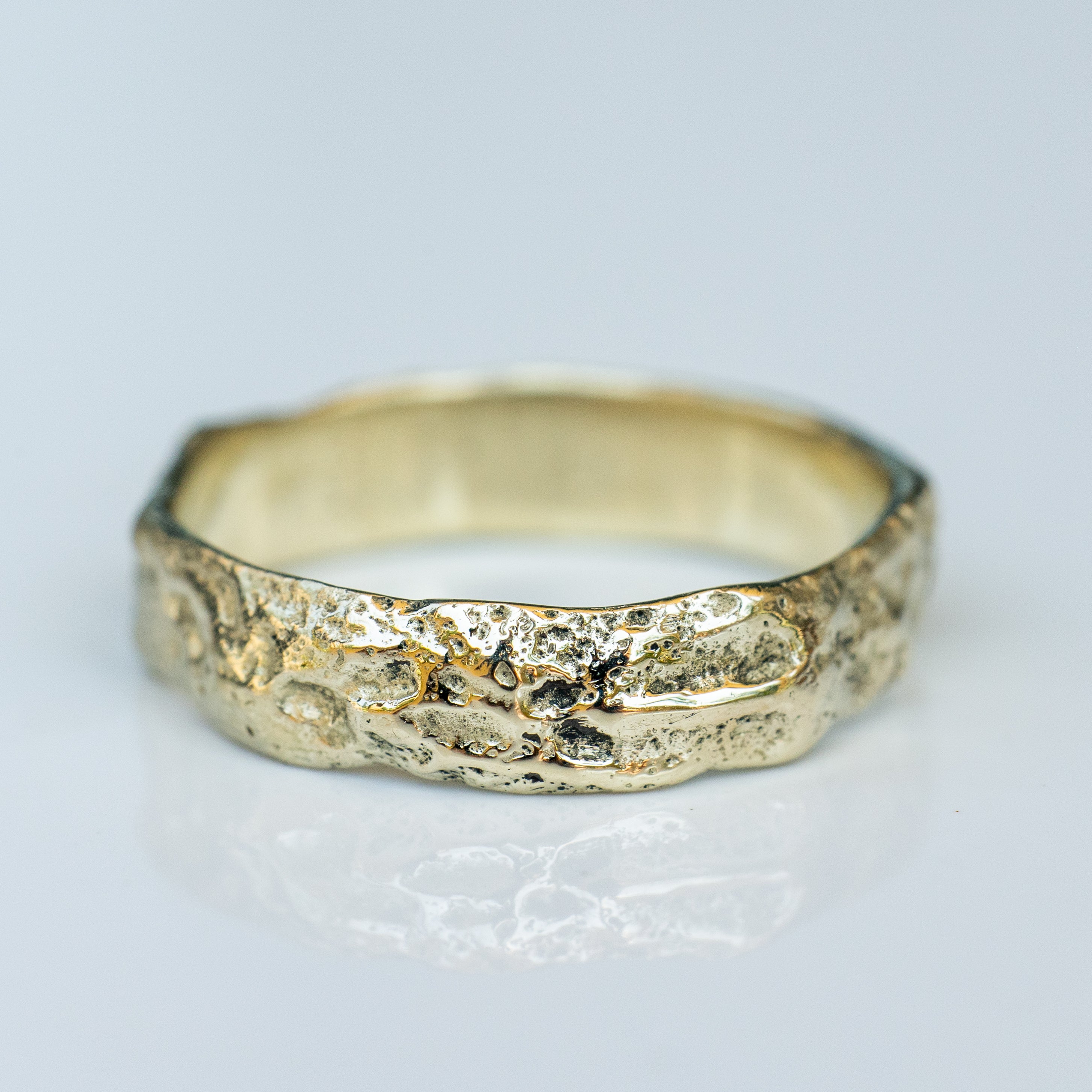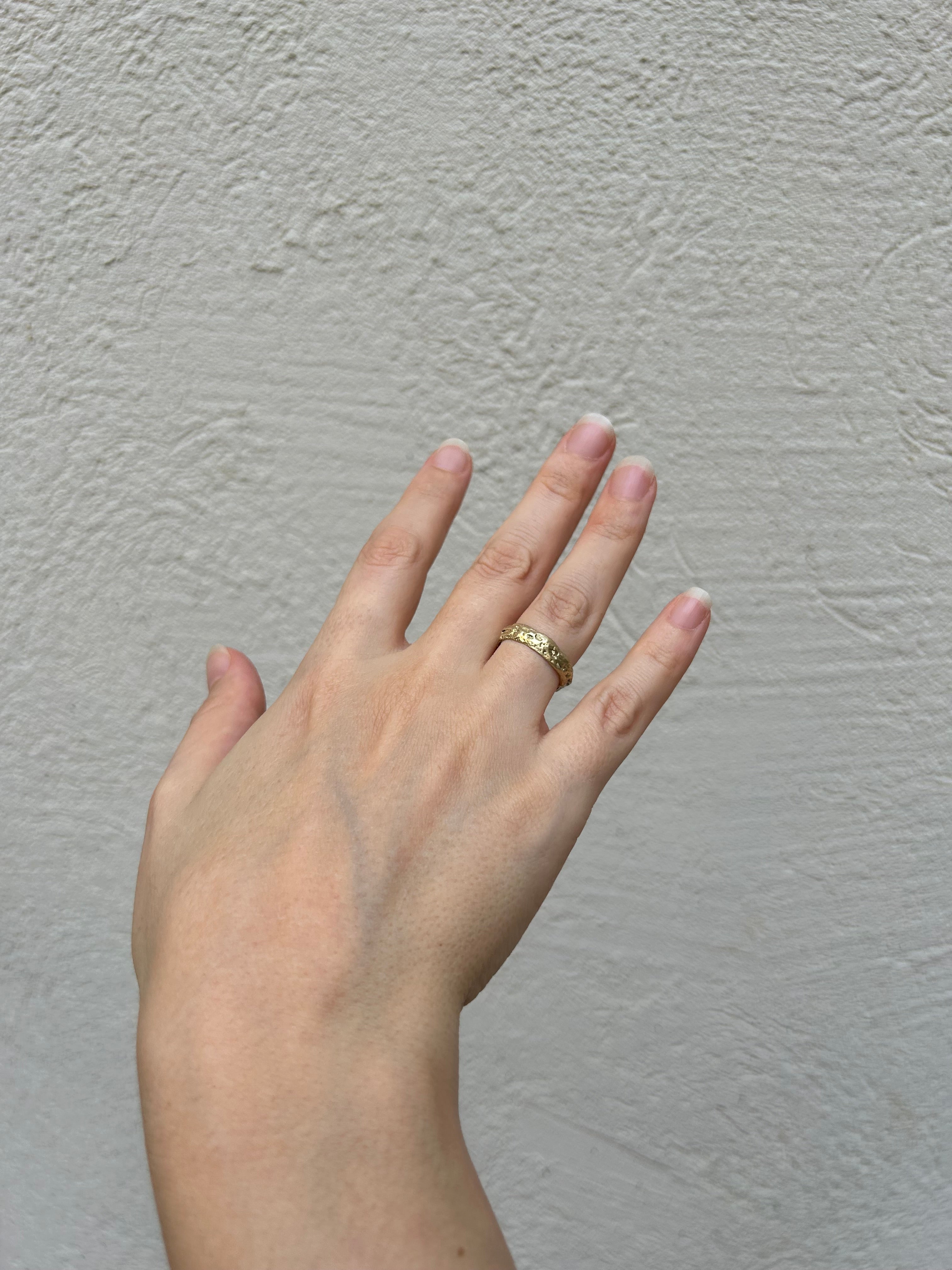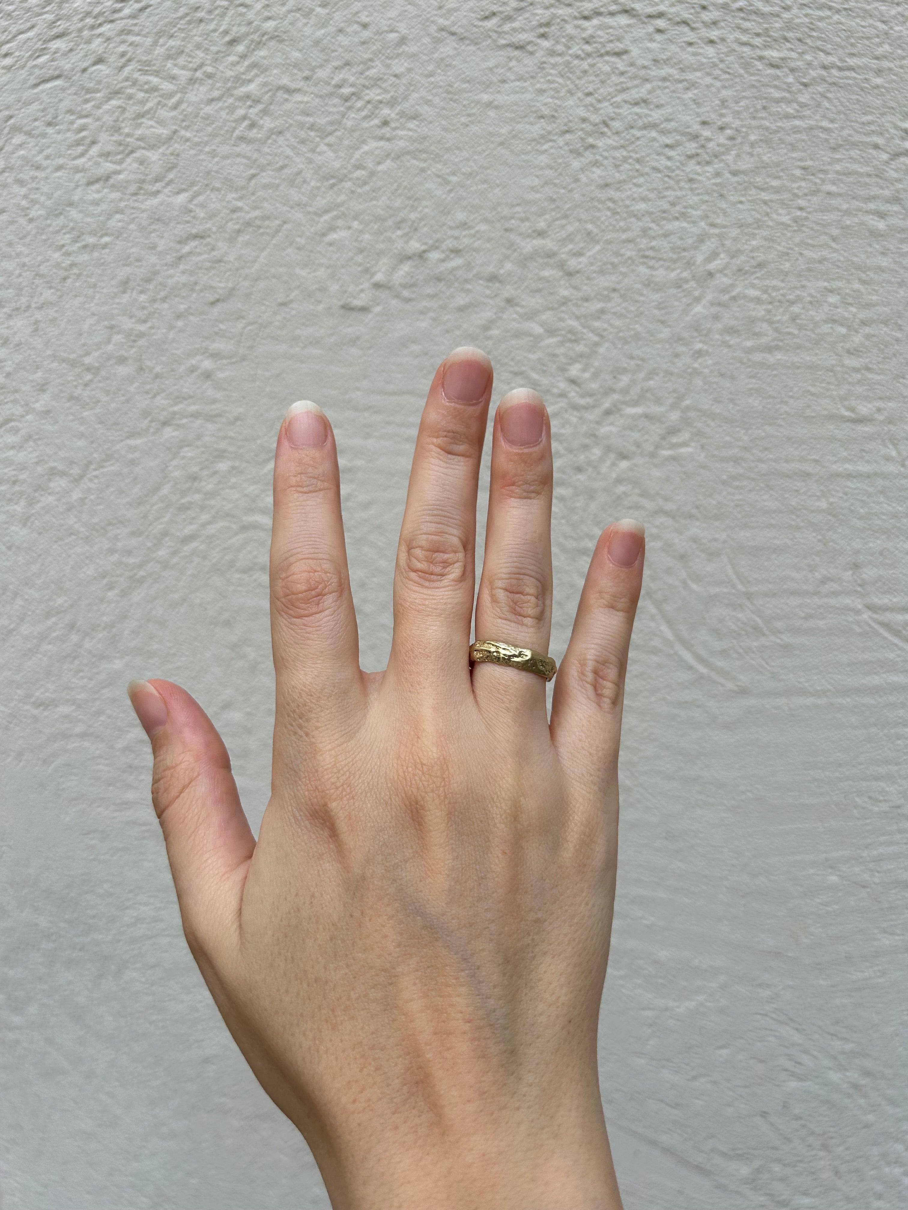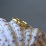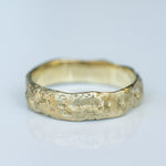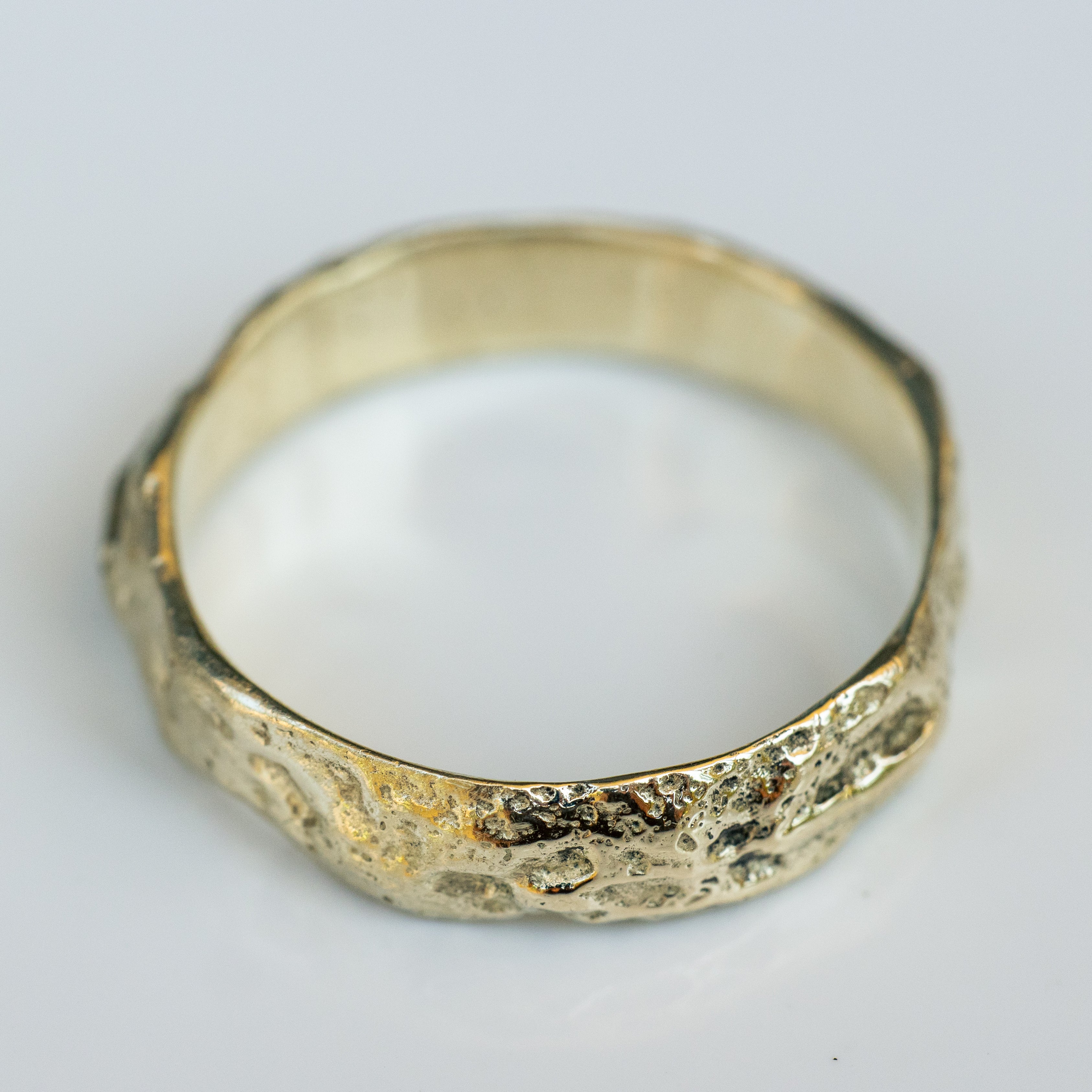 טבעת זהב גולמית 14 קראט לגמרי מחוספסת עם פרופיל וצורה משתנה, טבעת בעלת מרקם של חול בגימור מאט על המשטח החיצוני, מלוטשת ומושלמת מבפנים.