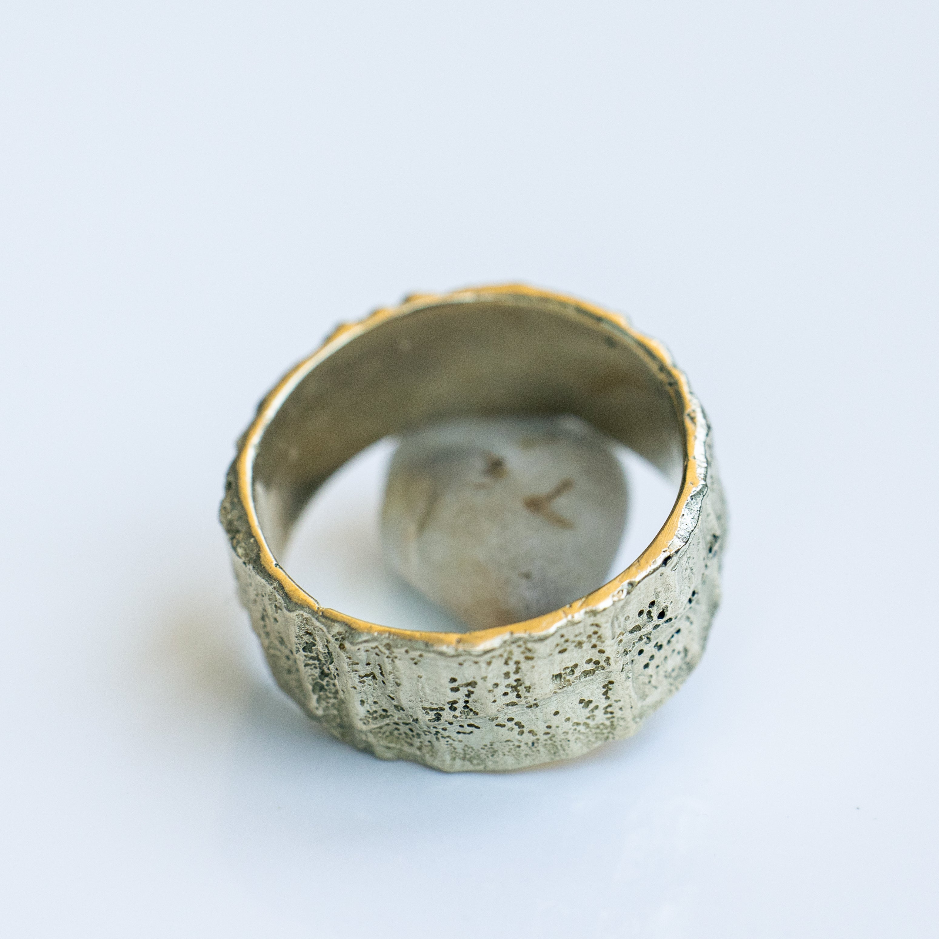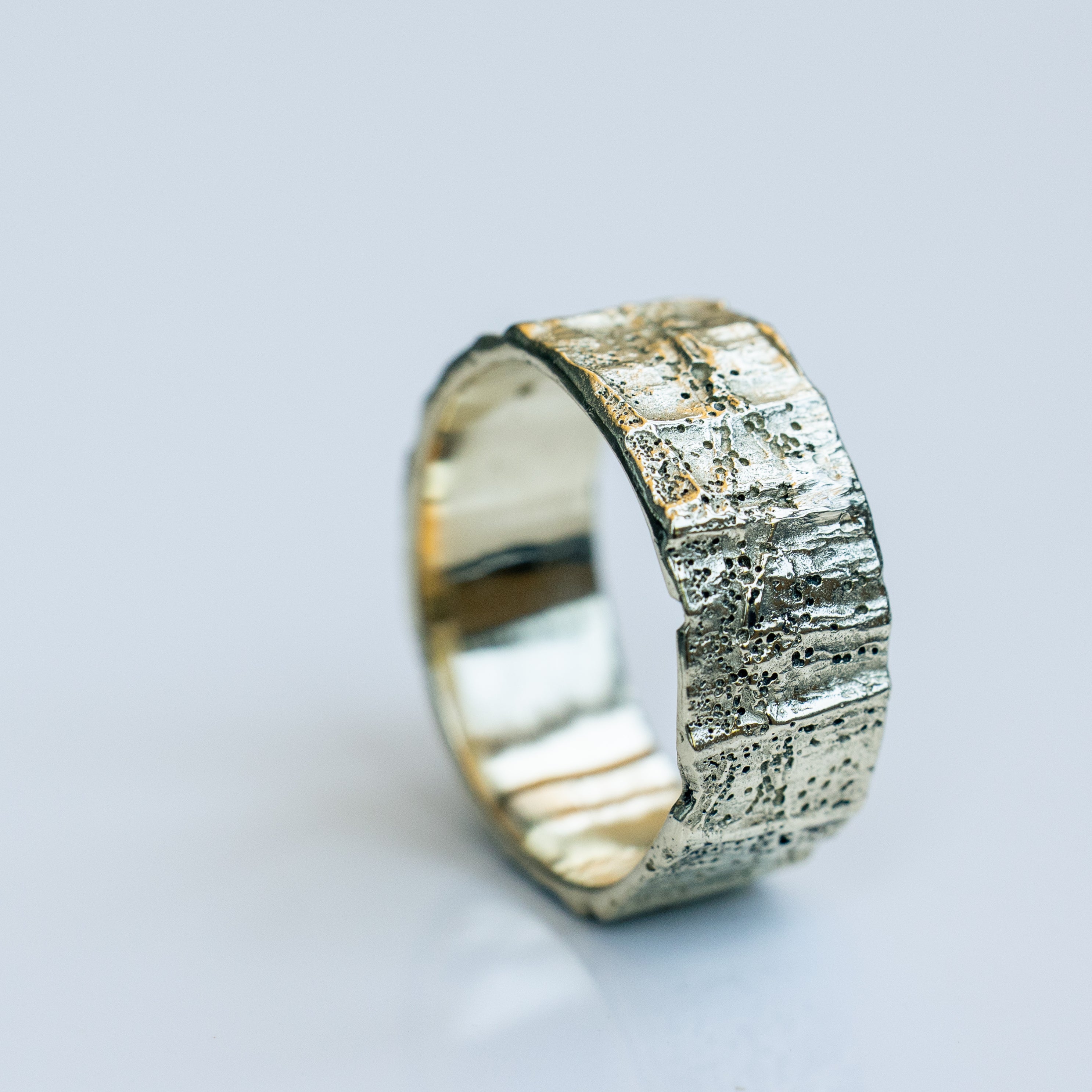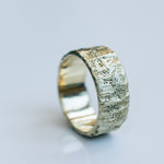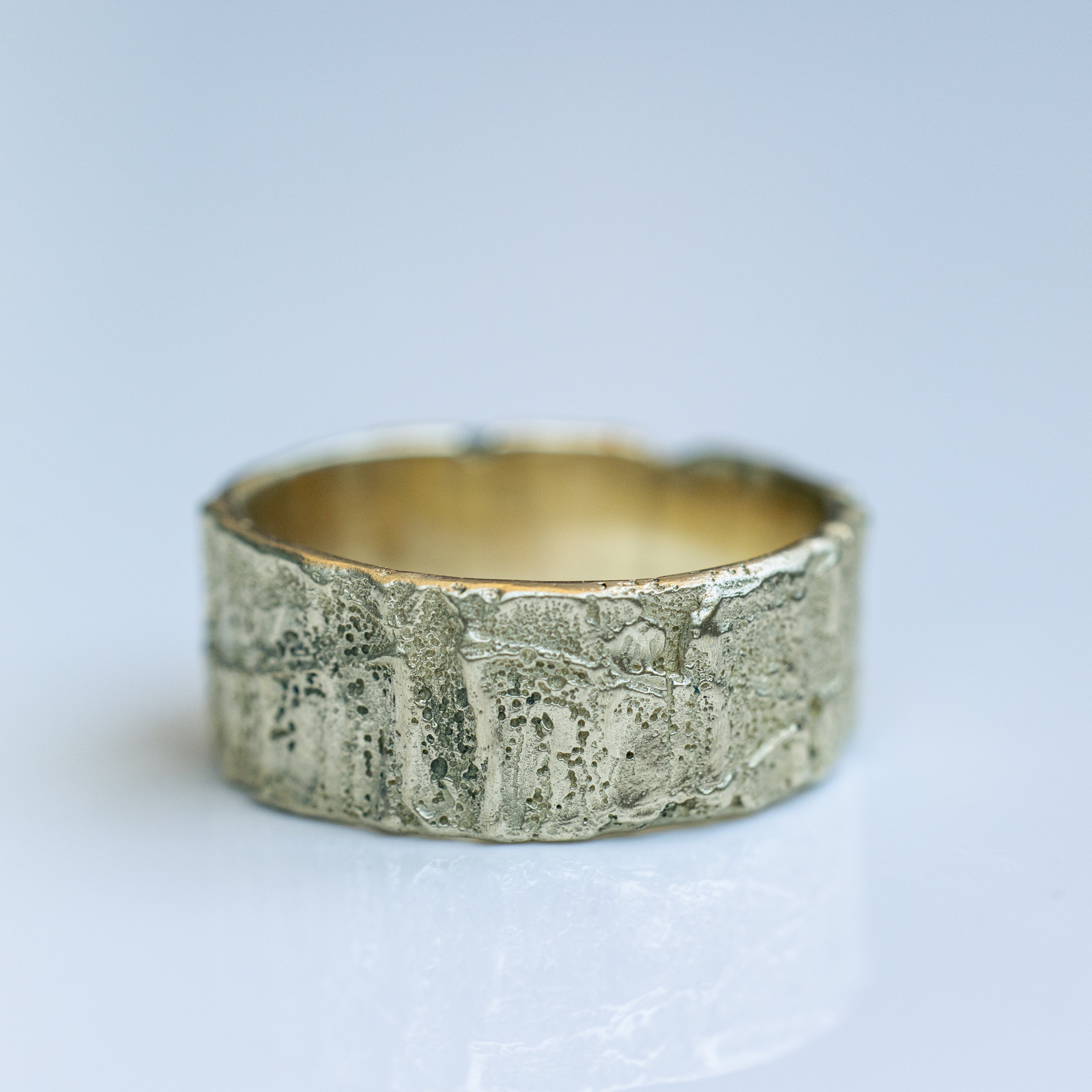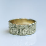 An 8 mm wide 14k gold ring with an organic, rough texture resembles a vein's look. The ring has an impressive presence and feels comfortable on the hand.
