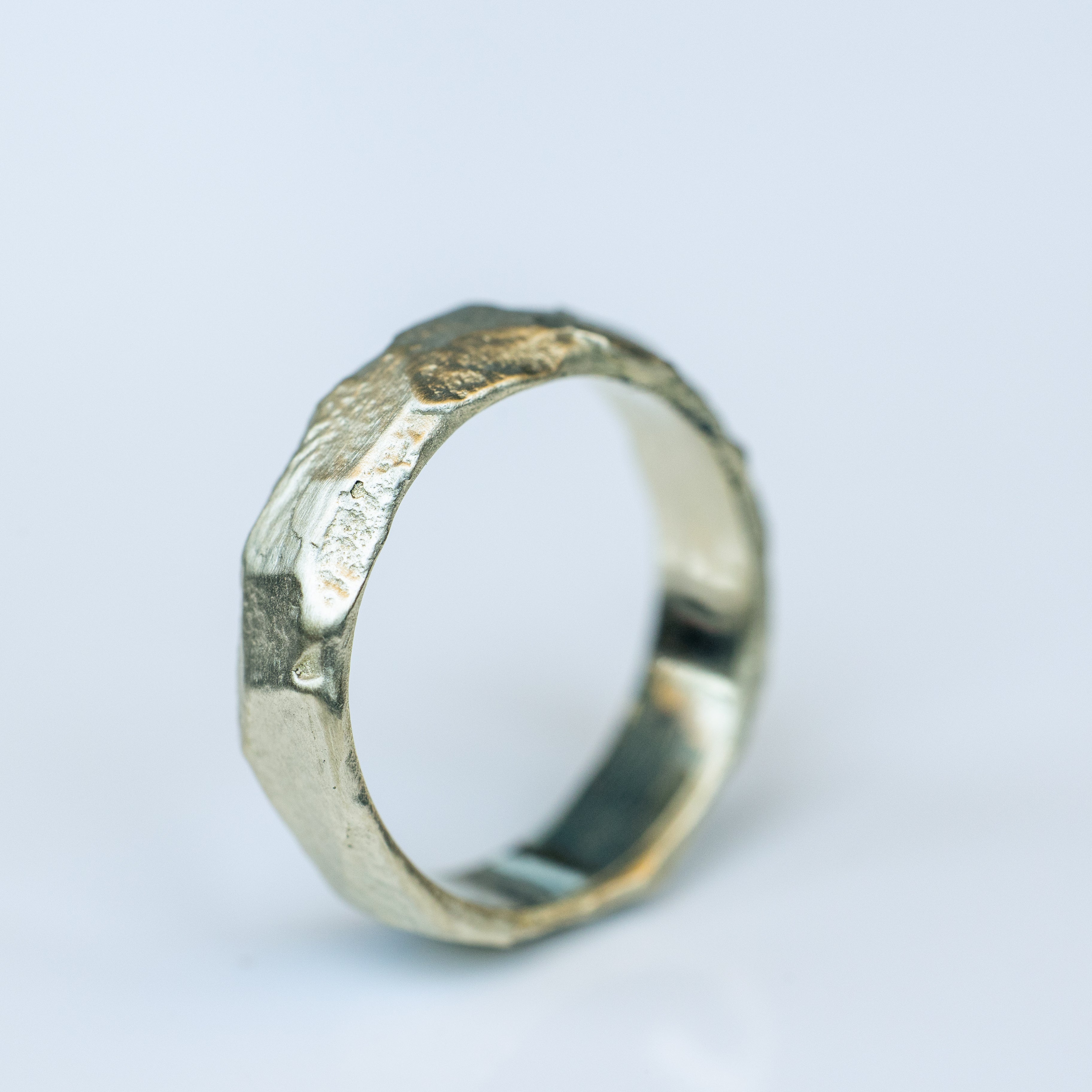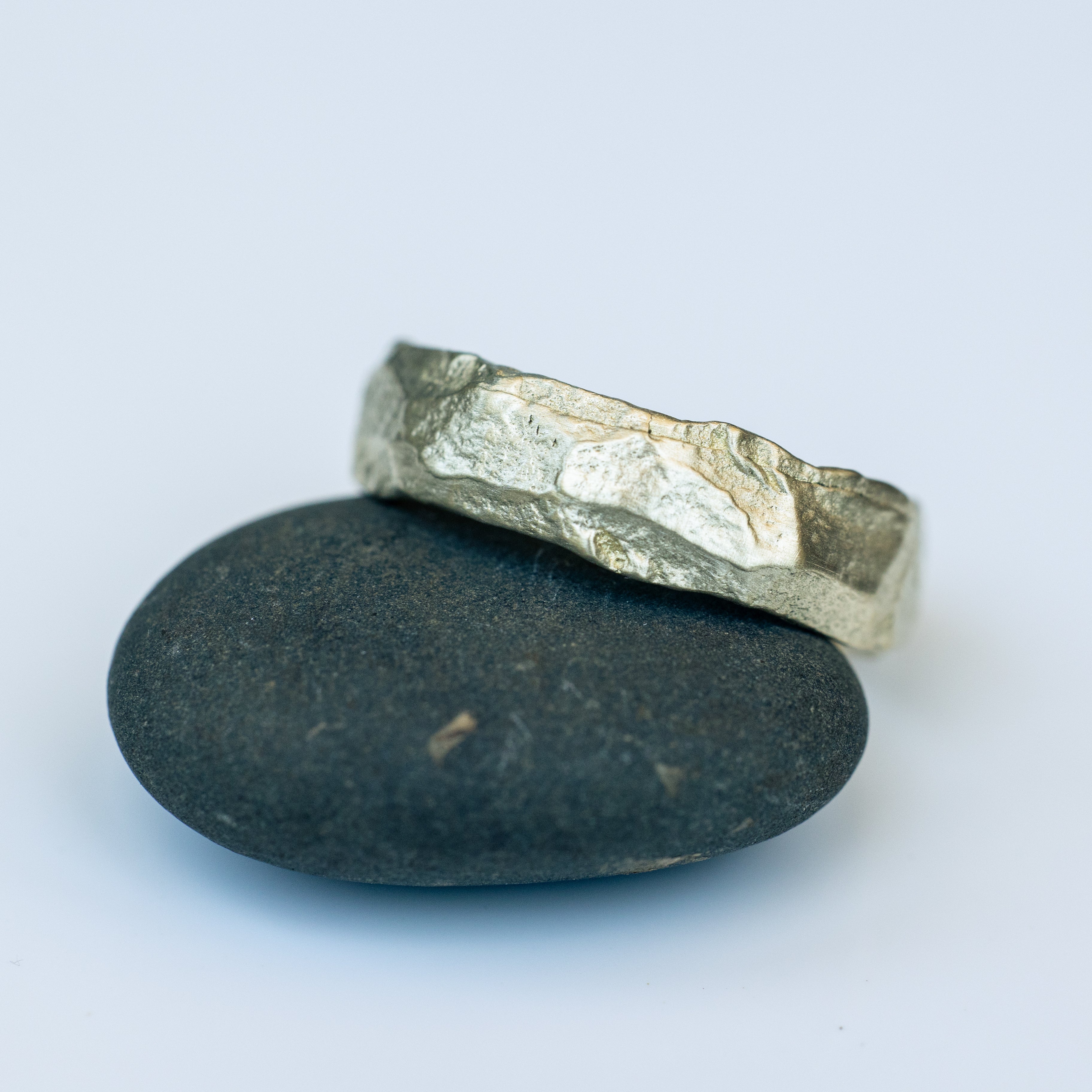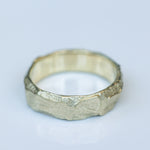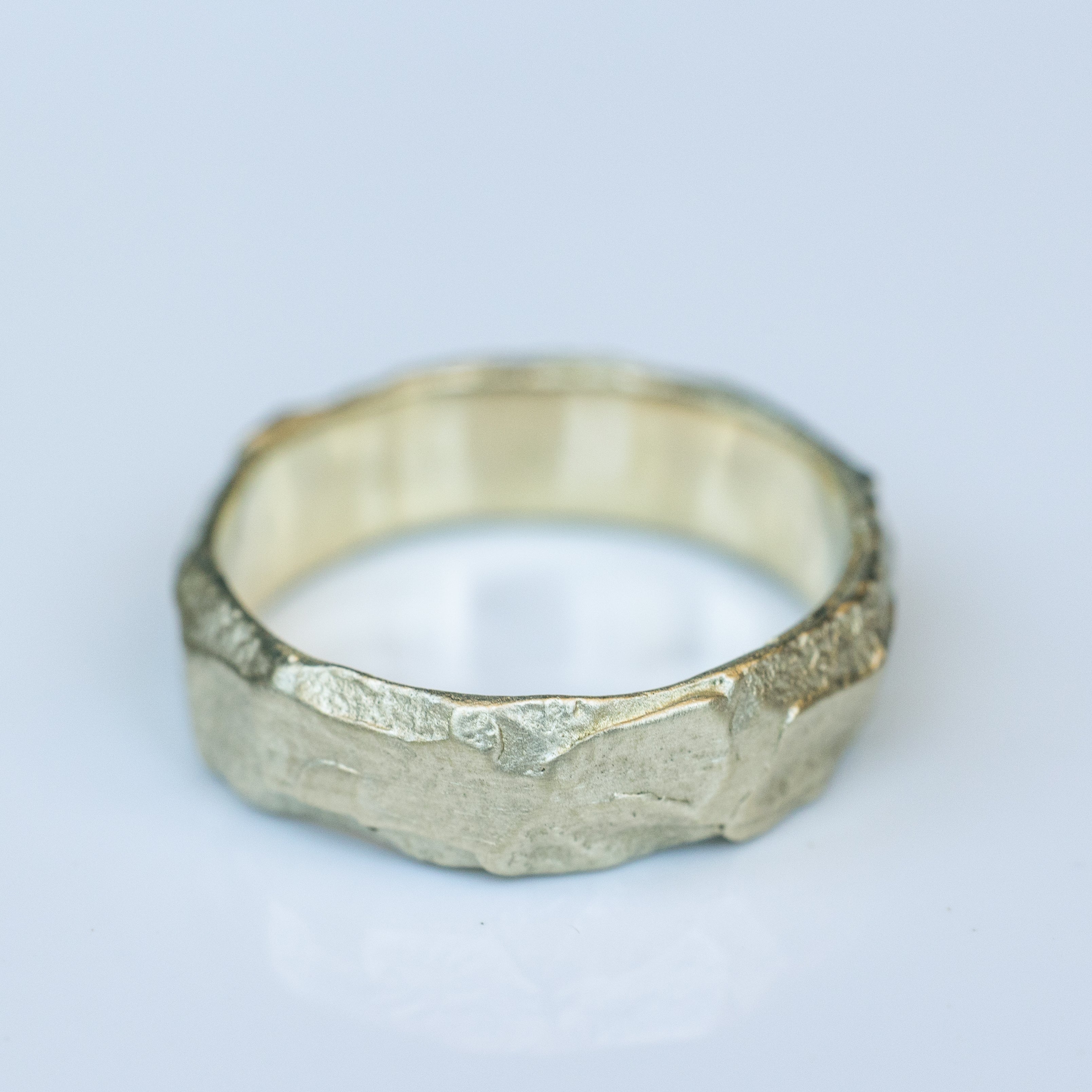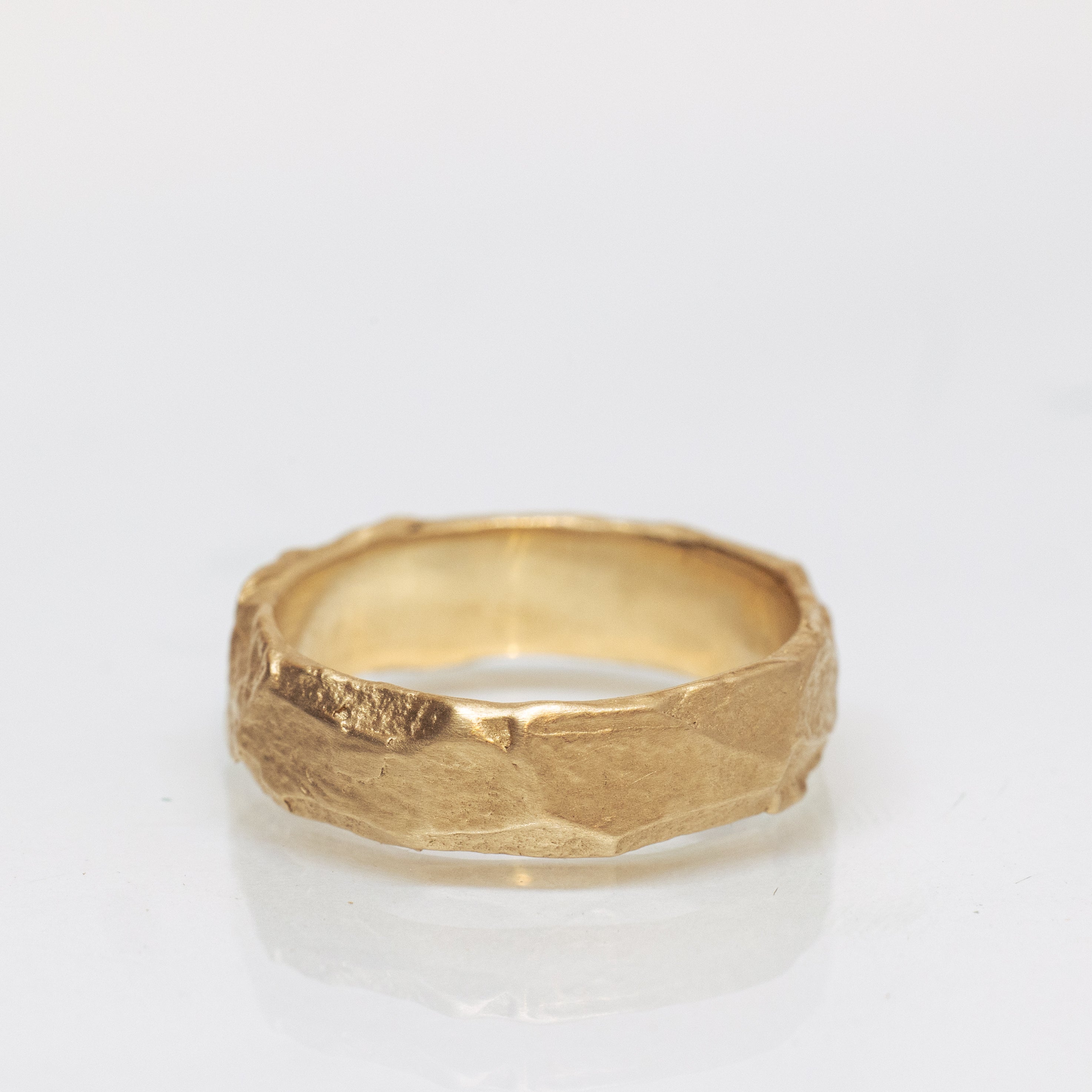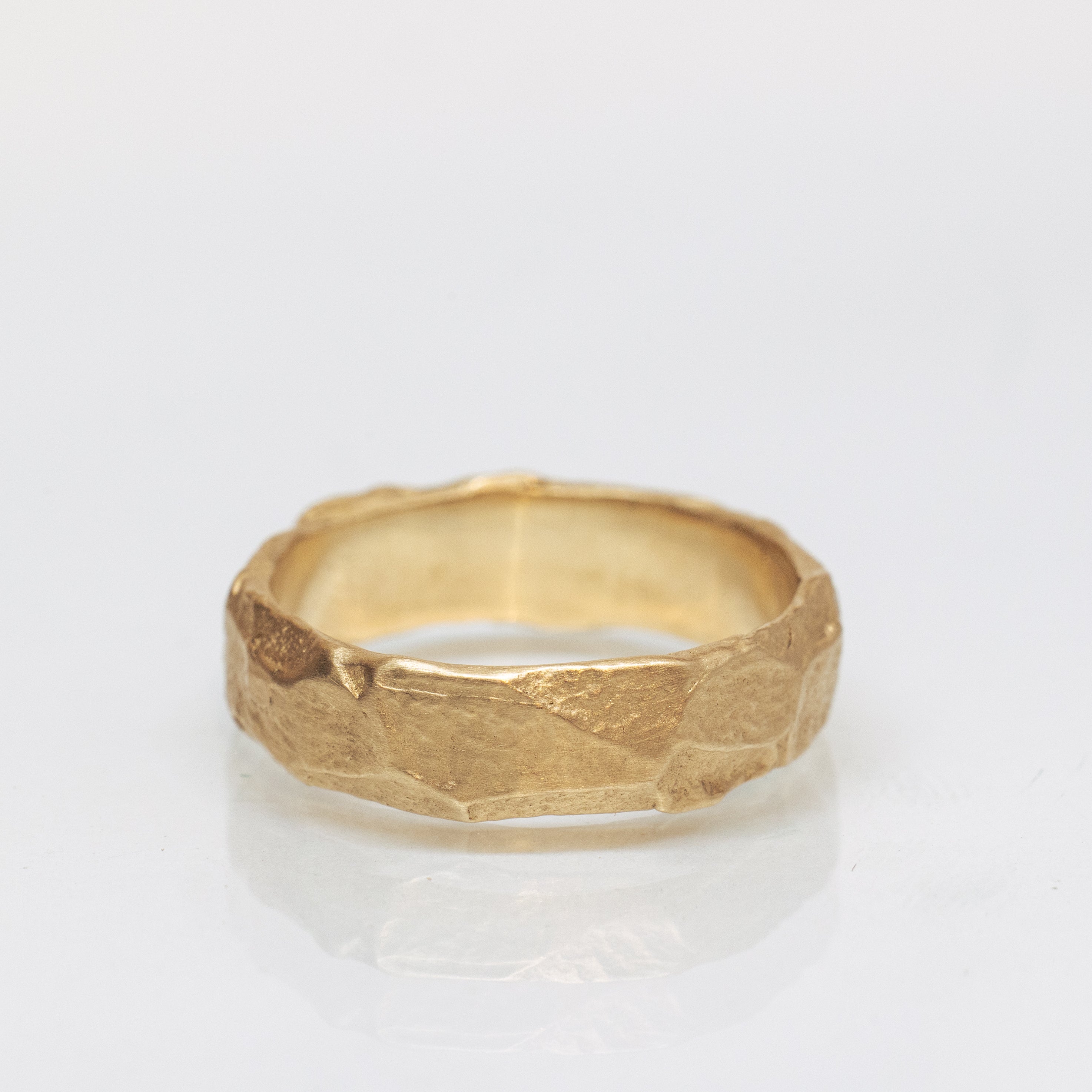 This 14K raw gold band features an organic, rough texture inspired by the intricate patterns of cracked earth. The width of the band is 5.5mm.