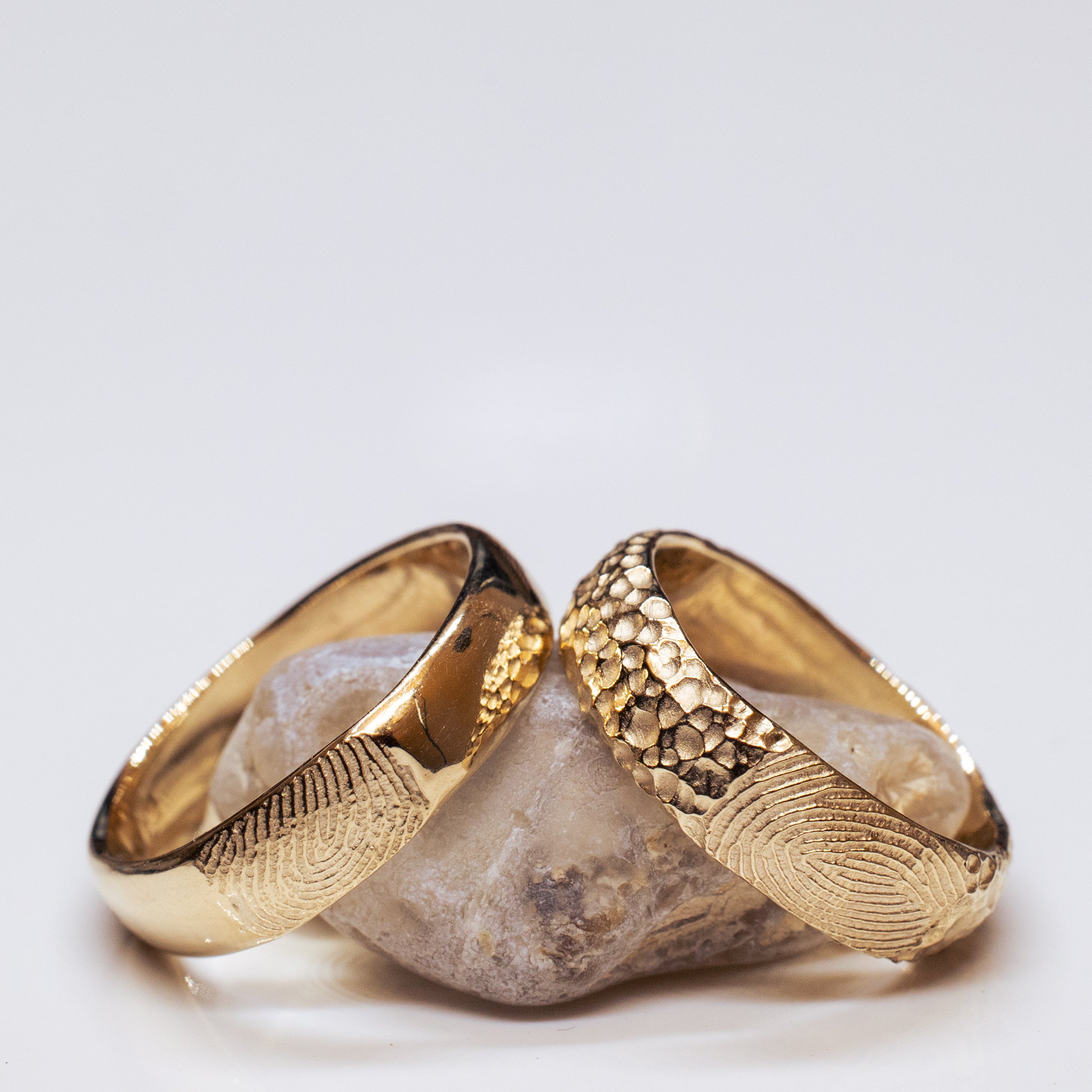 What makes these rings truly special is the addition of each other’s fingerprints, creating a unique personal touch for your wedding bands.