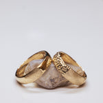 One ring is a clean, comfortable half-round gold band that is 5mm wide. The other features a 4mm wide half-round profile with a textured surface that resembles the beautiful look of coral.