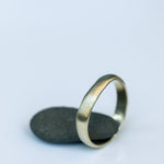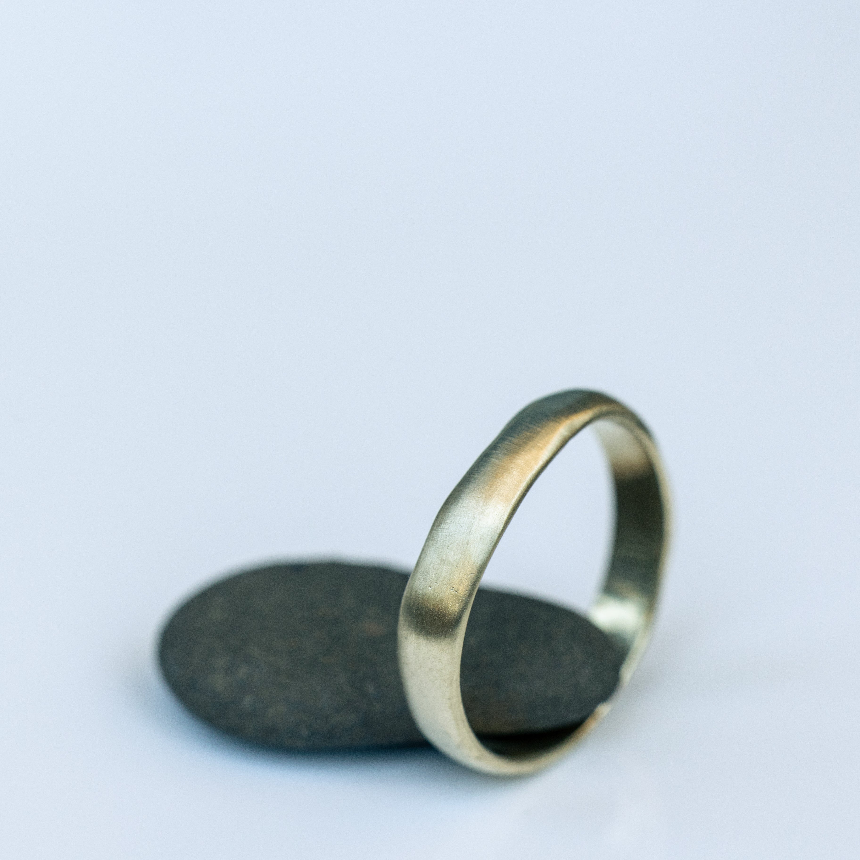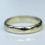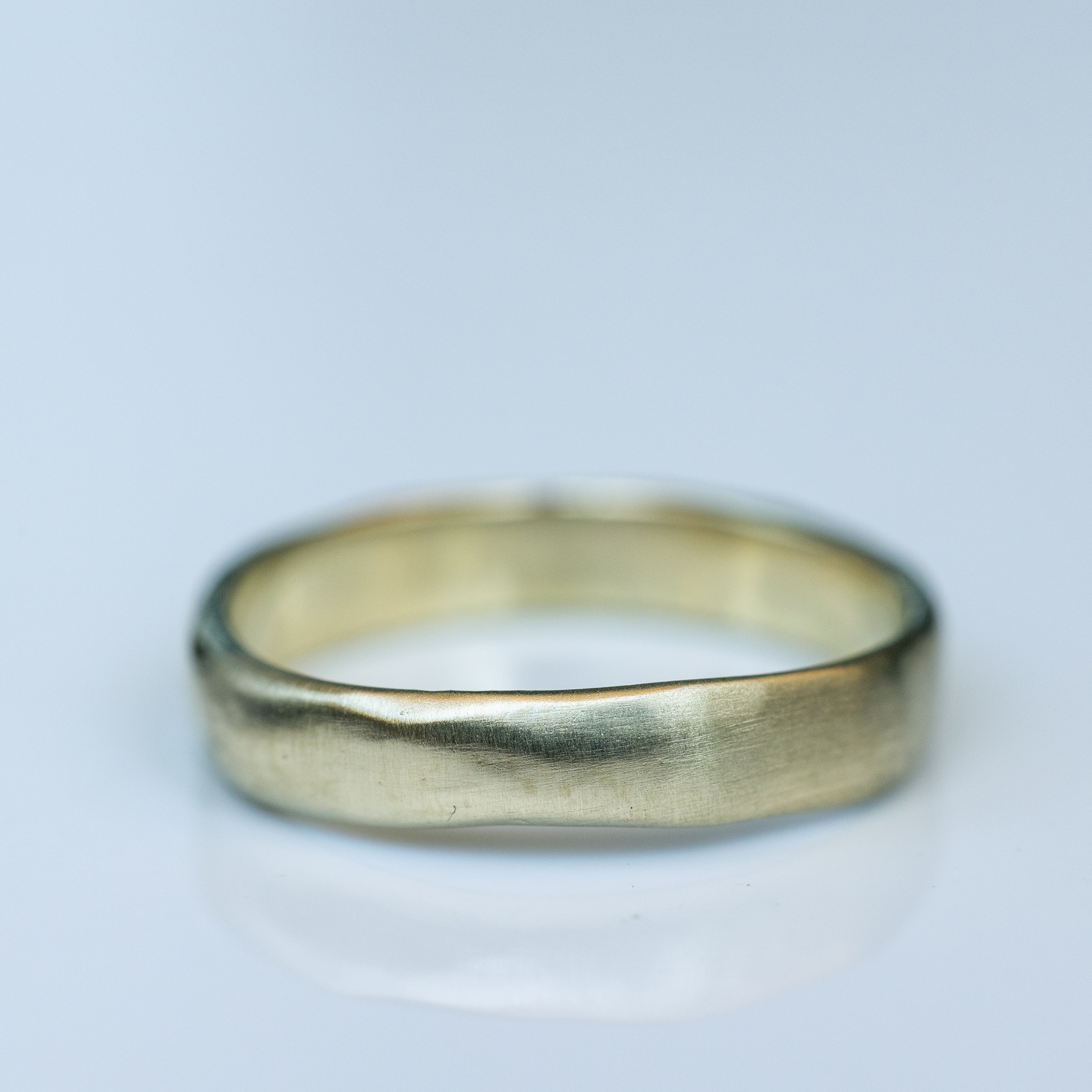 This classic, smooth, raw ring is made of 14k solid gold. The surface of the ring has a subtle texture, and it measures approximately 4 mm in width.