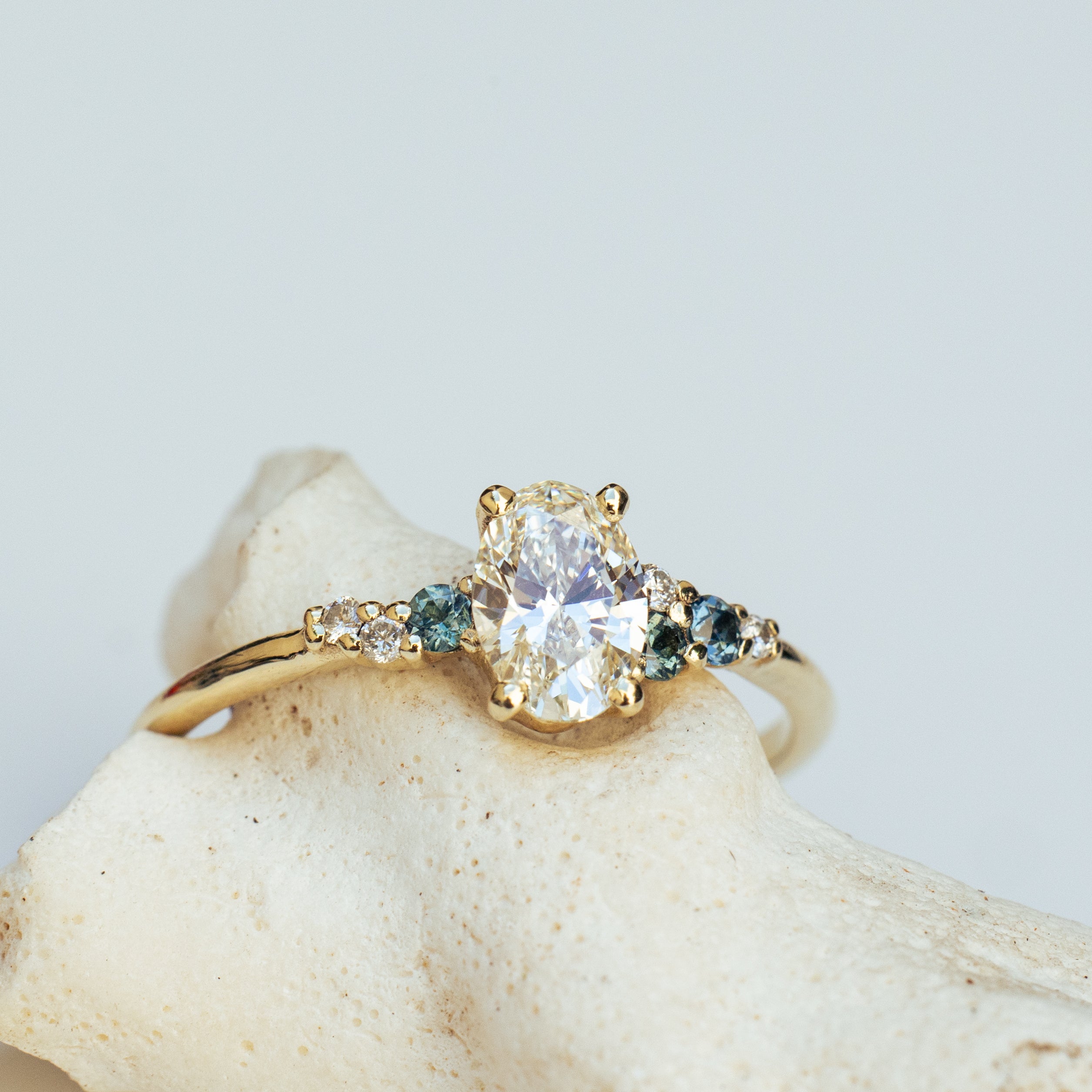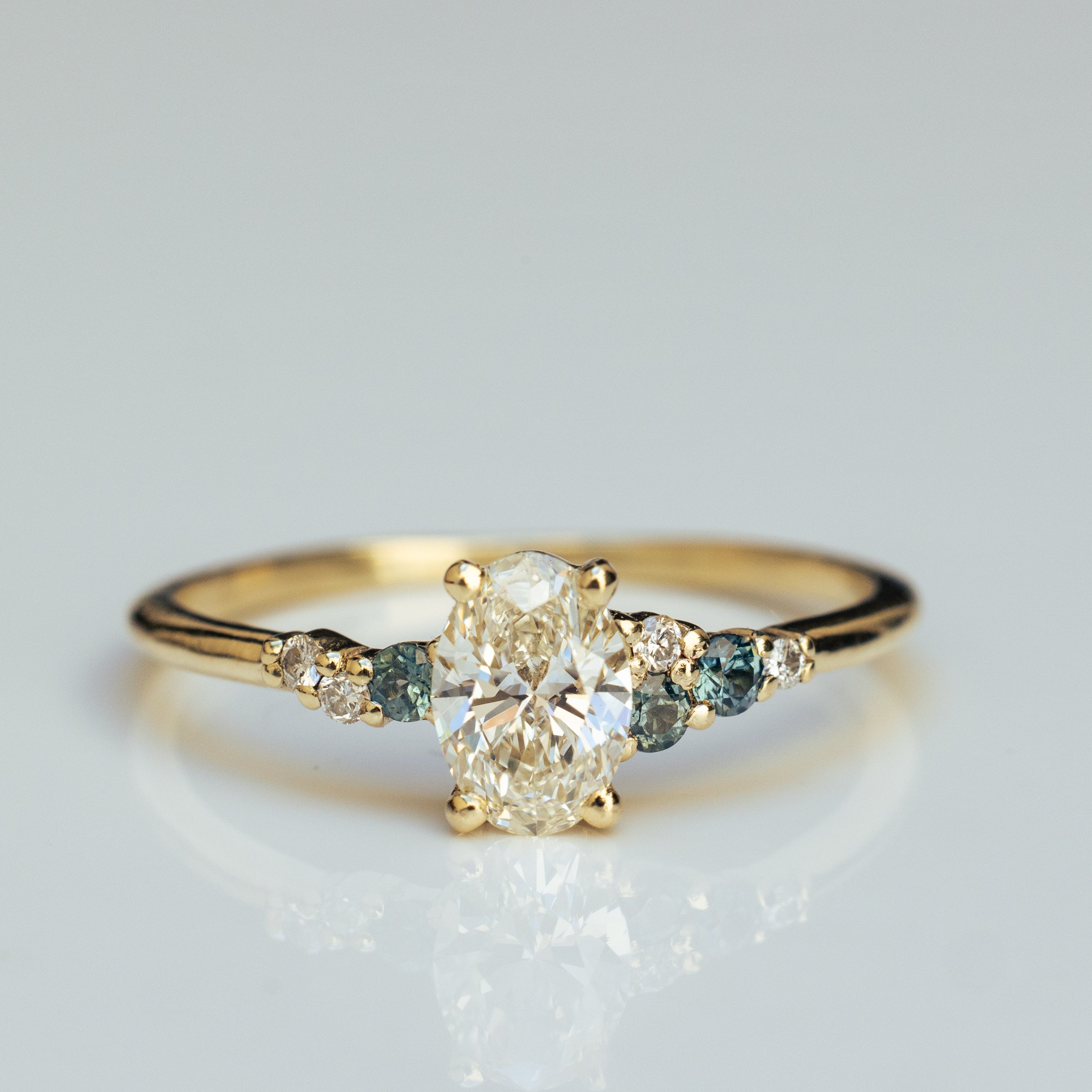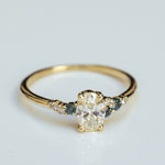 A 14K gold cluster ring with a stunning 0.50ct oval white diamond at the center, accompanied by a mixture of white diamonds and parti sapphires on its sides (0.10ct together), in an asymmetric composition.