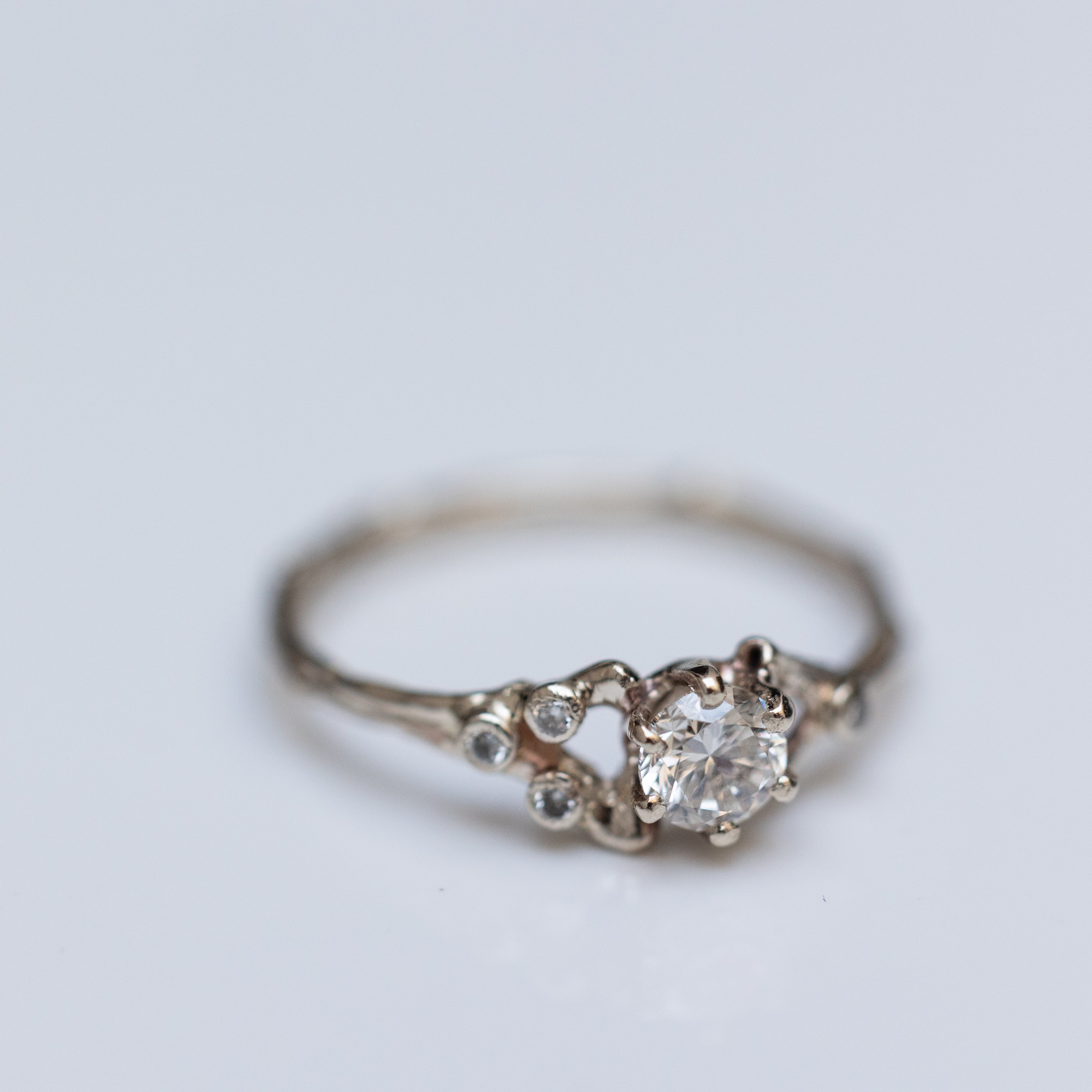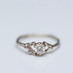 This captivating ring features a spreading branch design with a stunning 0.25ct white diamond at its center, drawing attention with its brilliance and sparkle. To enhance its whimsical allure, four small diamonds (1.4mm each) are asymmetrically arranged on the branches, giving this piece a unique and distinctive appearance. This unexpected detail ensures that this ring truly stands out.