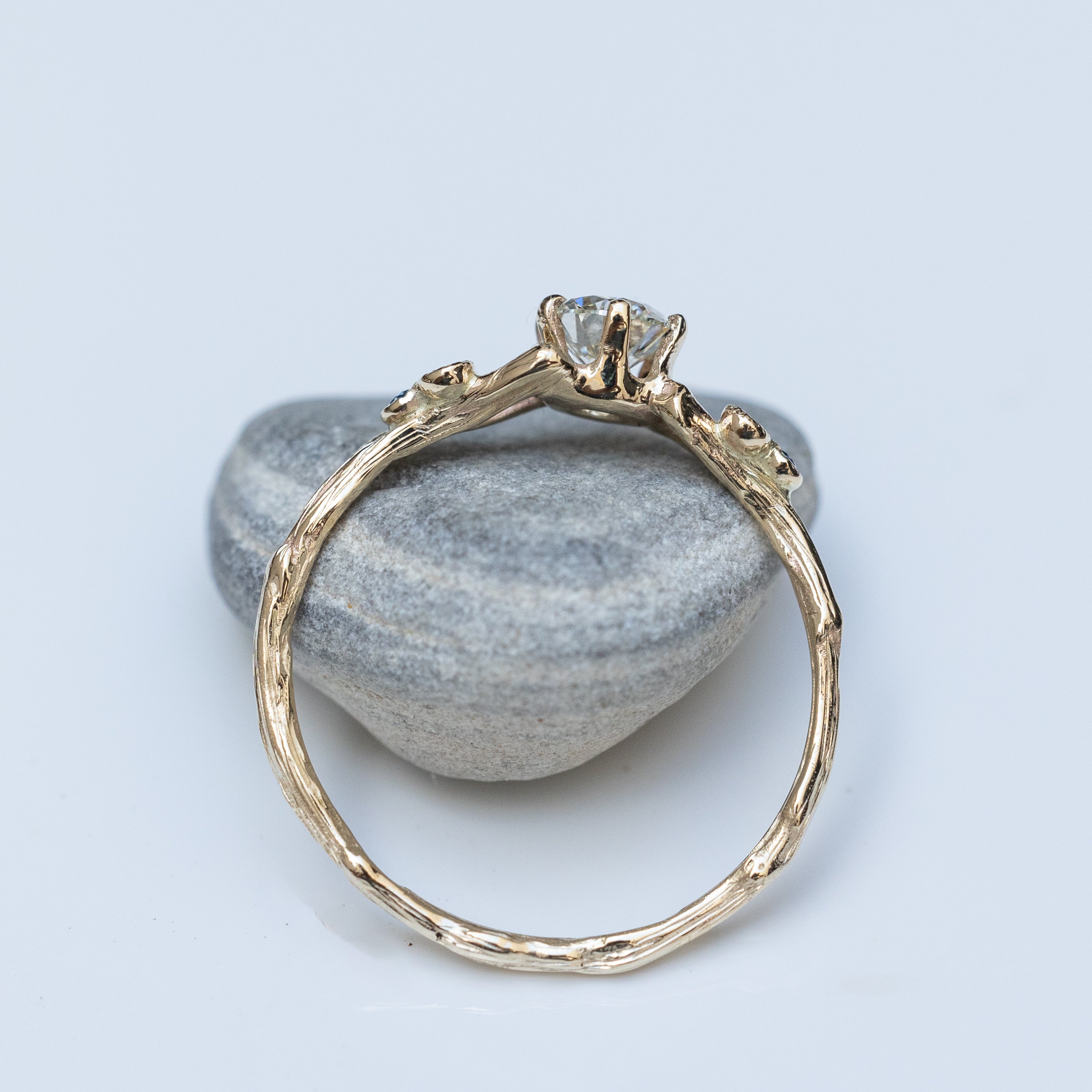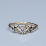 This stunning branch ring is crafted from 14k yellow gold and features a 0.30ct white diamond at its center. Surrounding the diamond are six smaller blue sapphires (1.4mm each) elegantly placed along the branches.