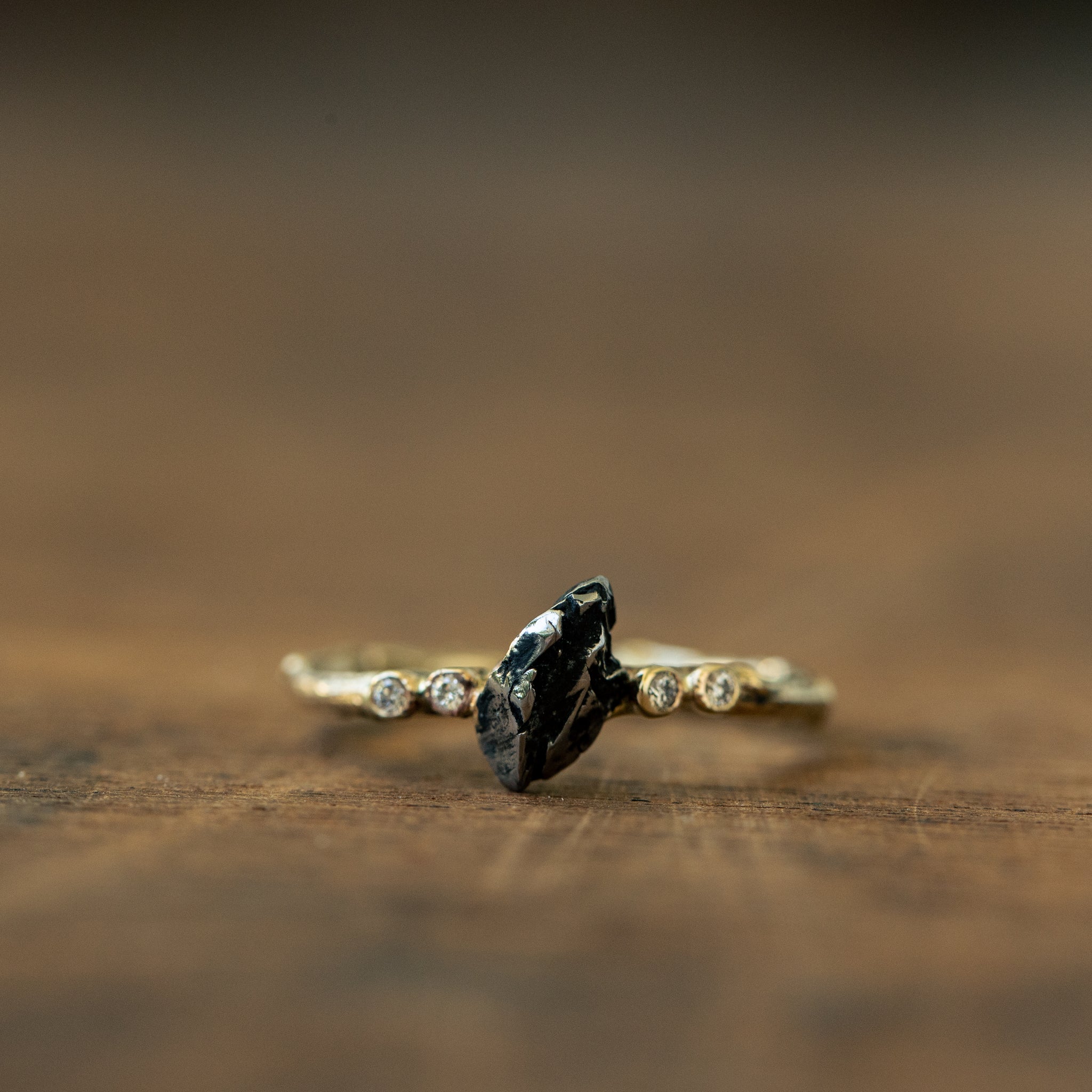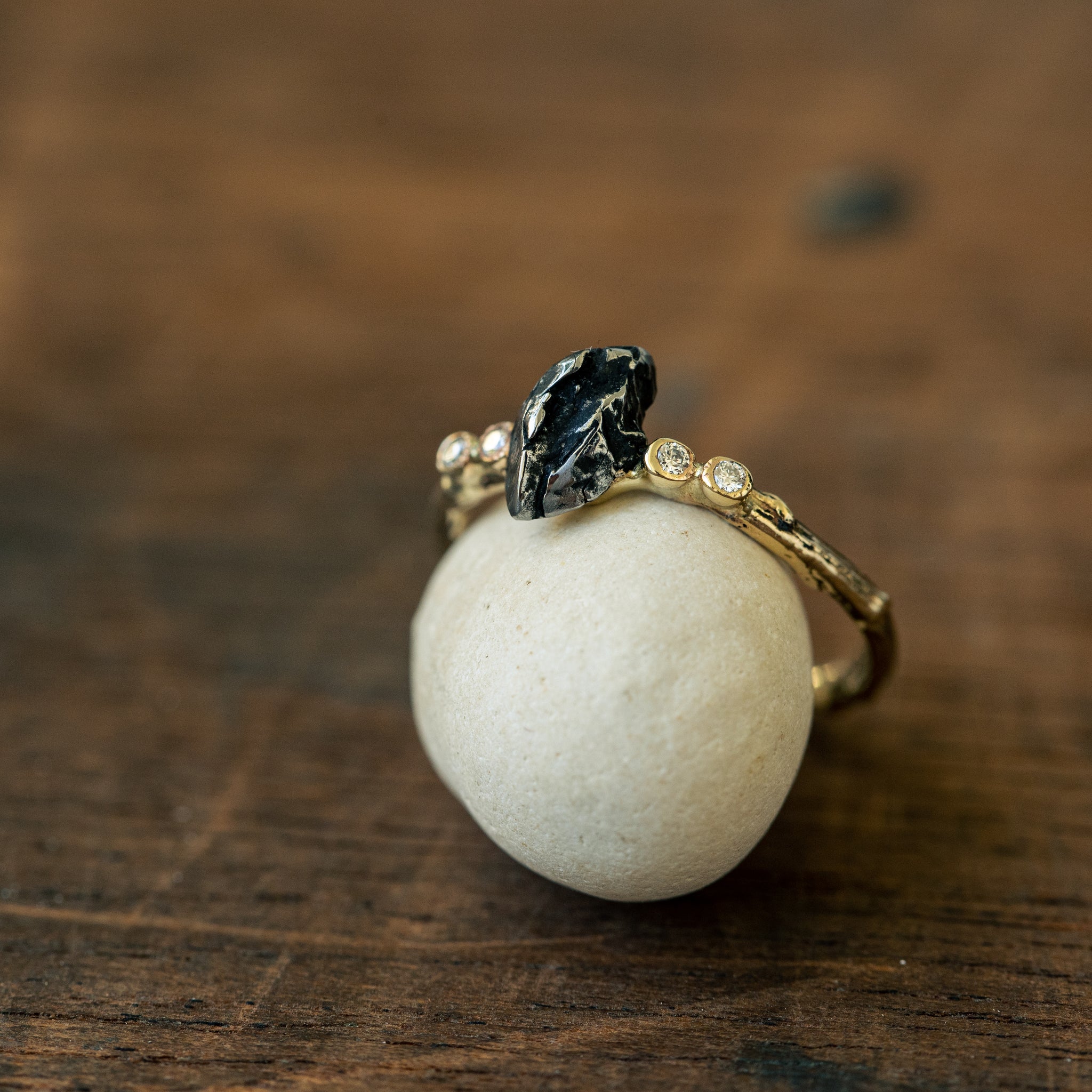 14k gold branch ring with a beautiful piece of Campo del Cielo meteorite accompanied by 2 small white diamonds on both sides.
