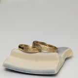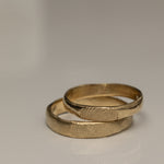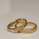 A duo of classic, smooth, raw wedding rings, with personal fingerprints on each ring. He gets her fingerprint, and she gets his.