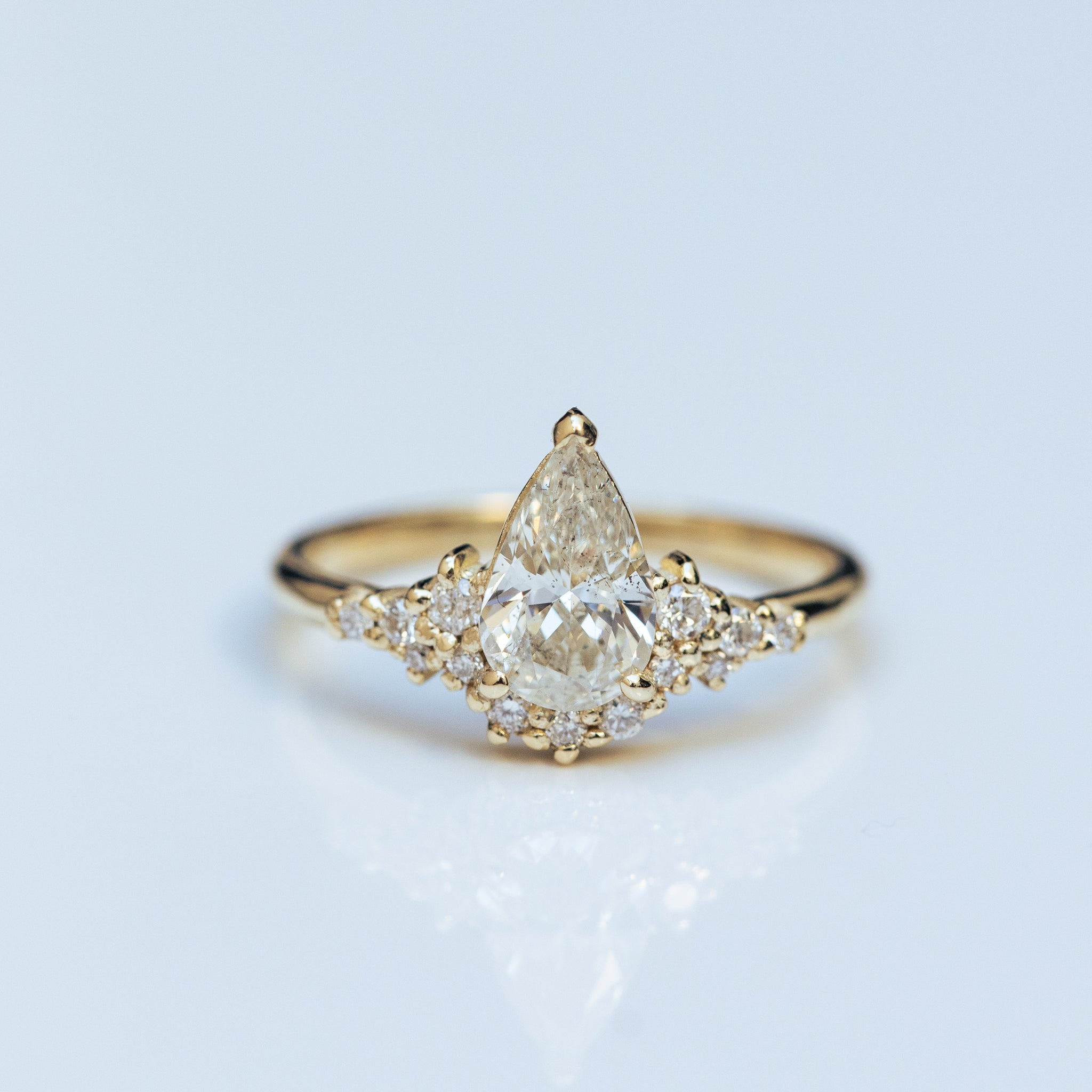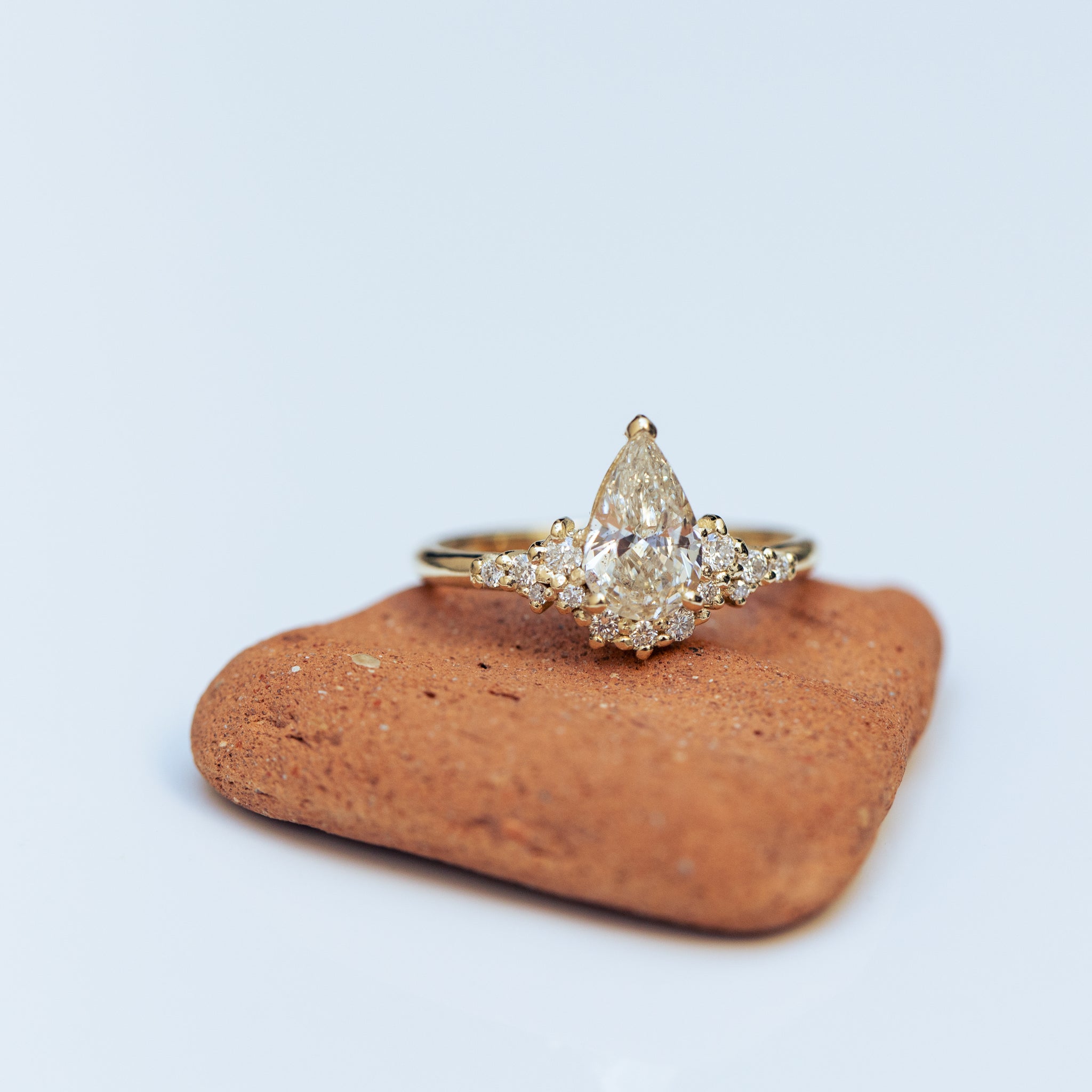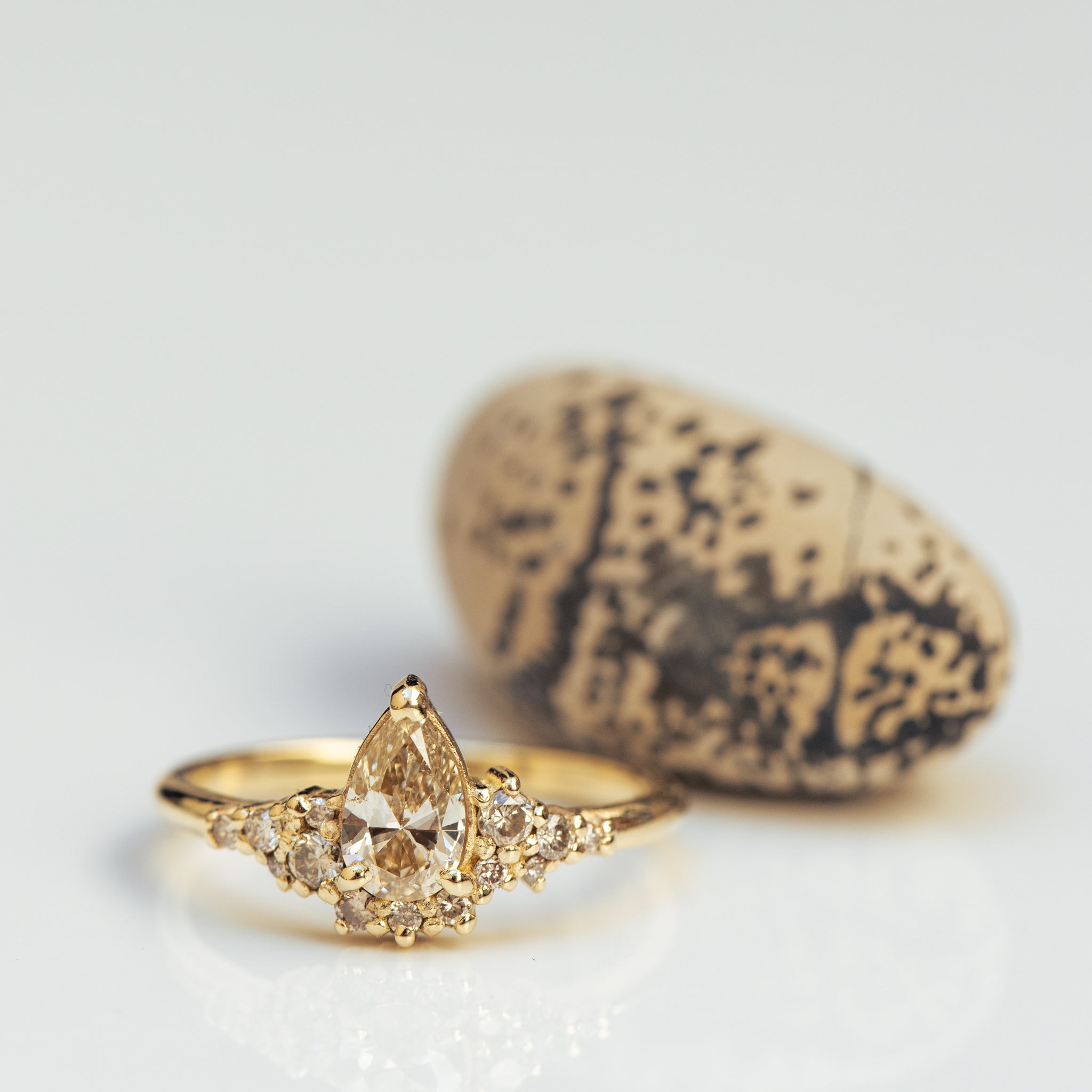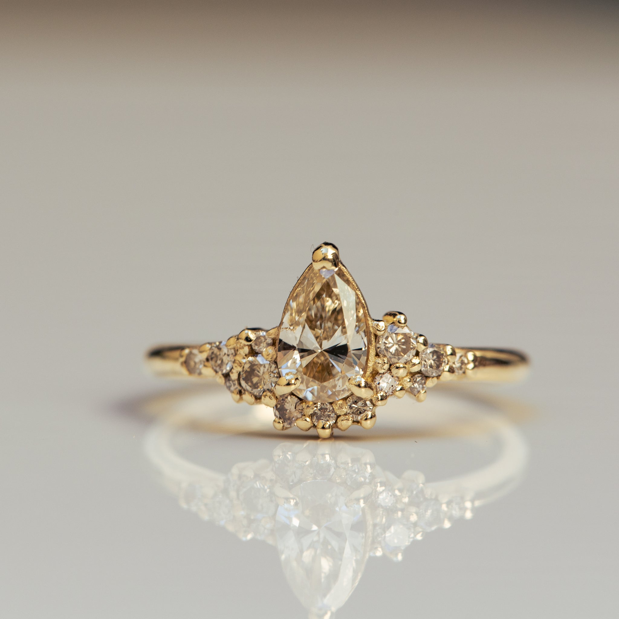 A 14k yellow gold cluster ring set in its center with a gorgeous large champagne drop diamond of 0.70ct- accompanied by 13 smaller diamonds that look like a halo on the sides. (altogether 0.85ct).