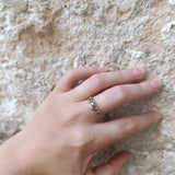 This is a unique 14K gold branch ring made from three intertwined branches. The branches split and twist in a light movement in a balanced composition, set with three blue sapphires in different shades and sizes.