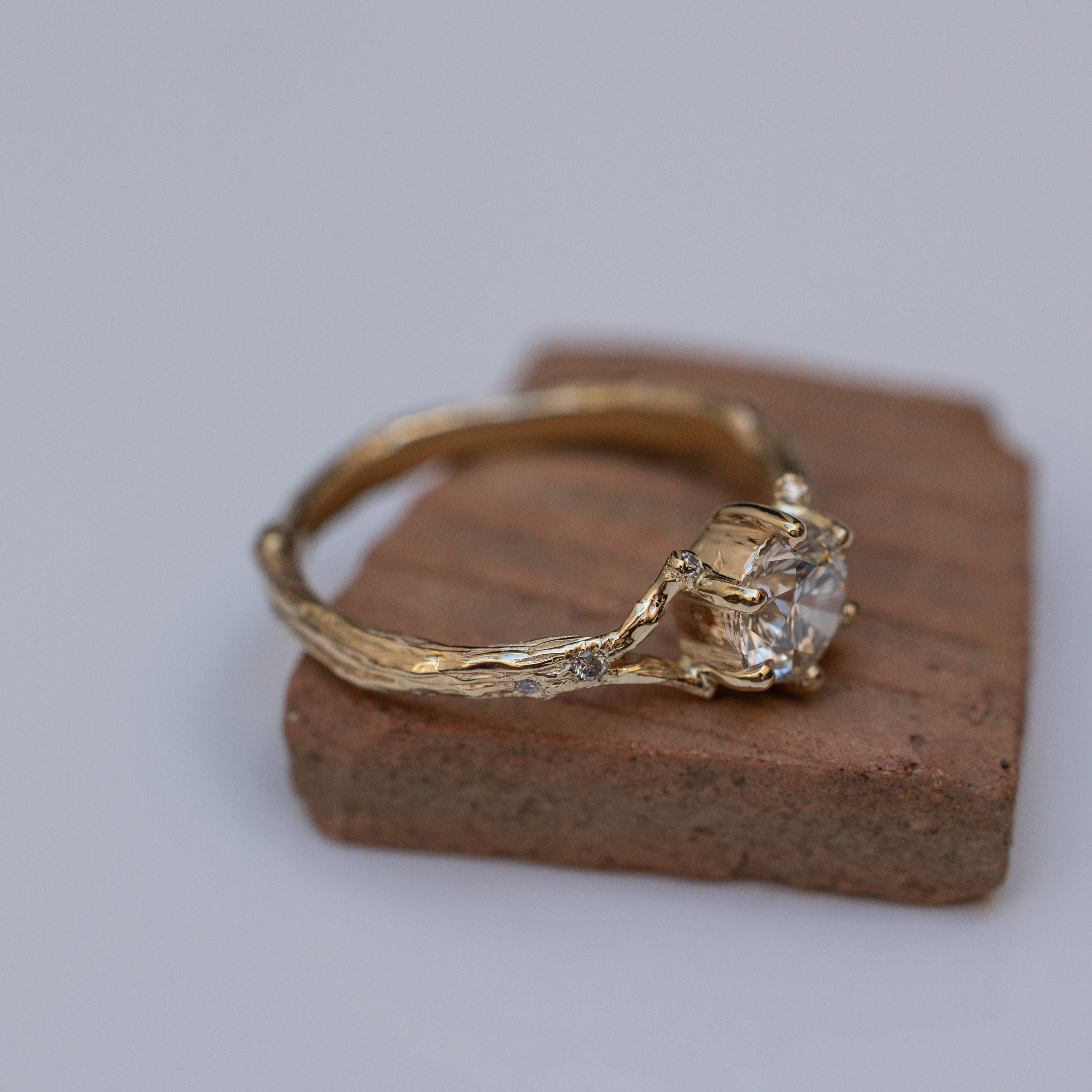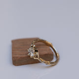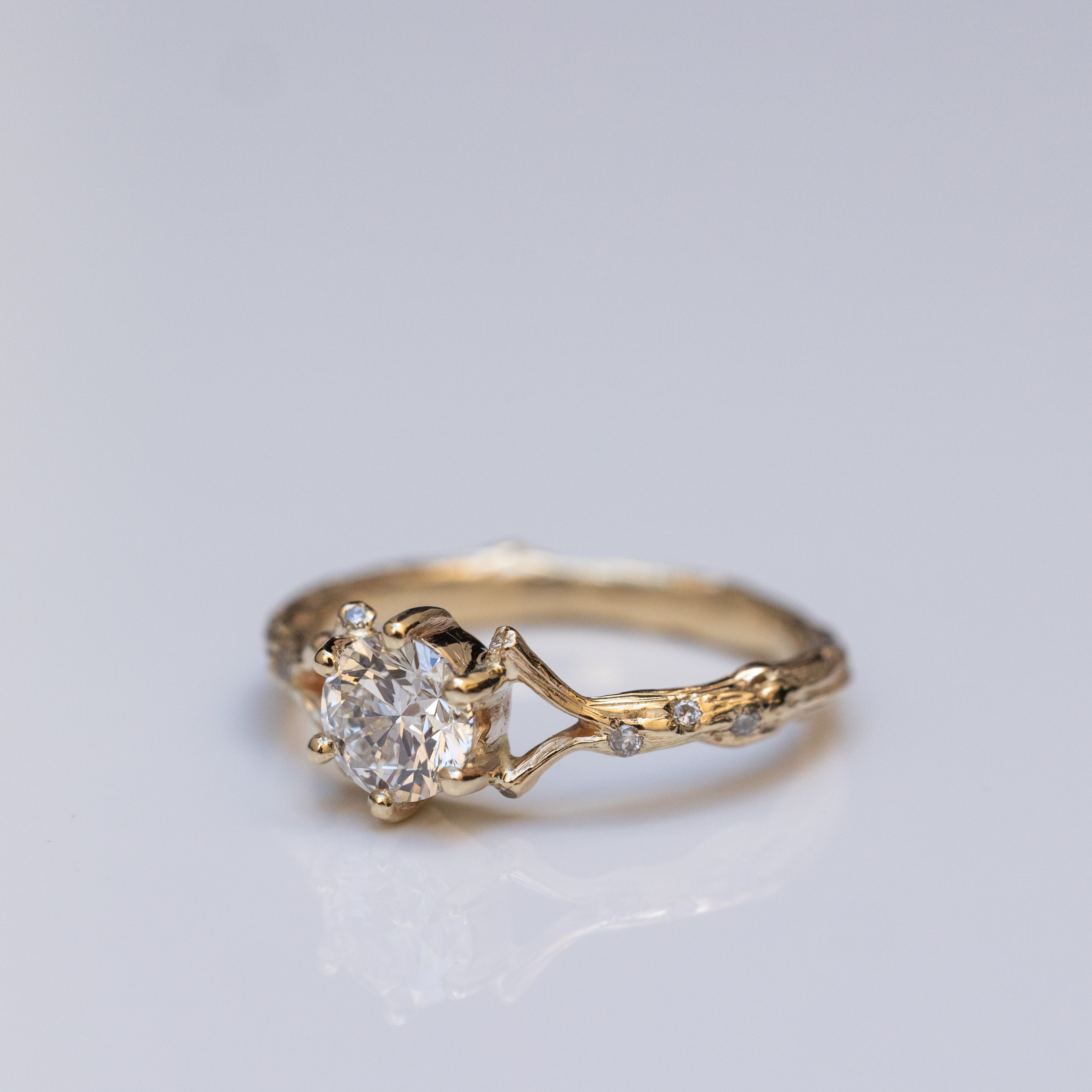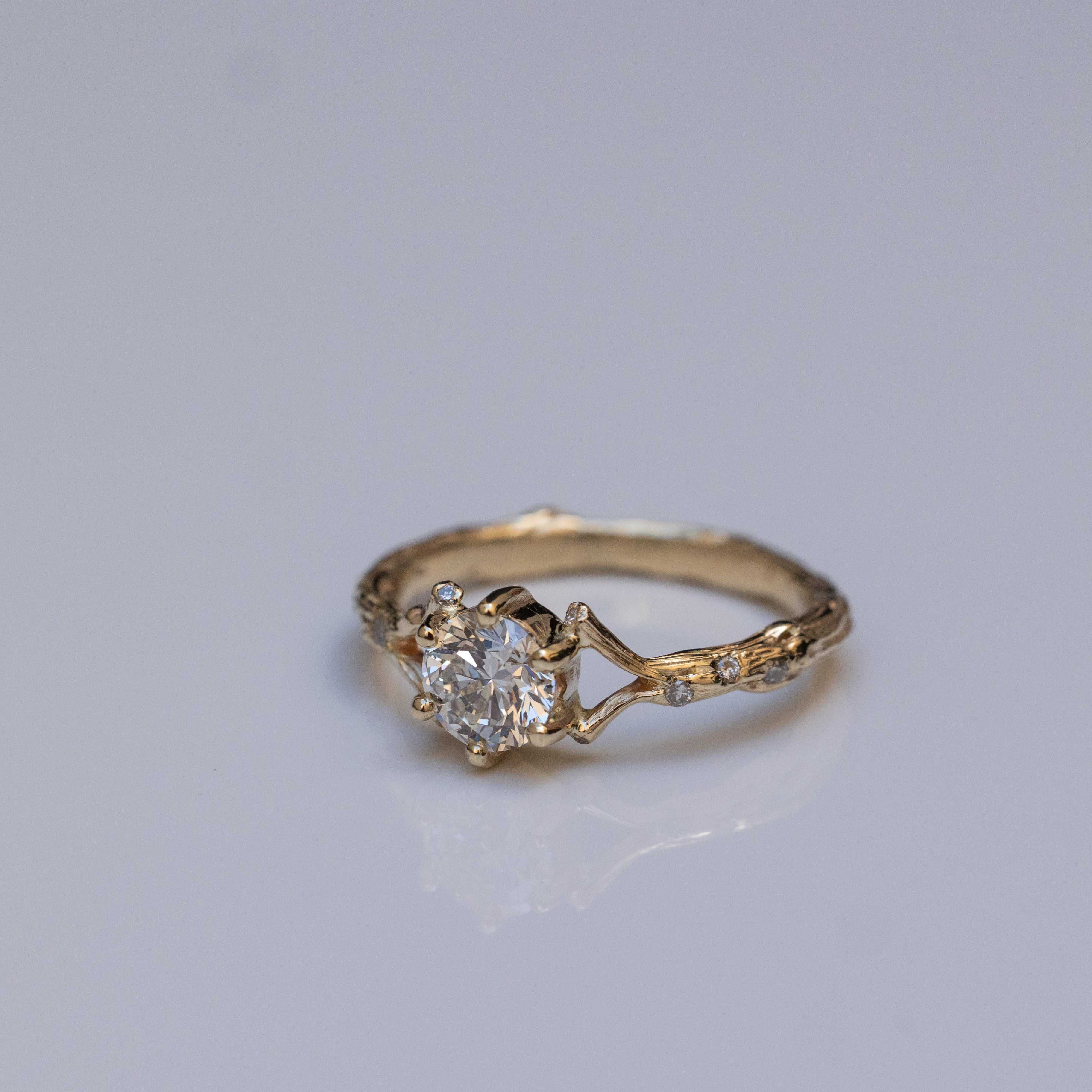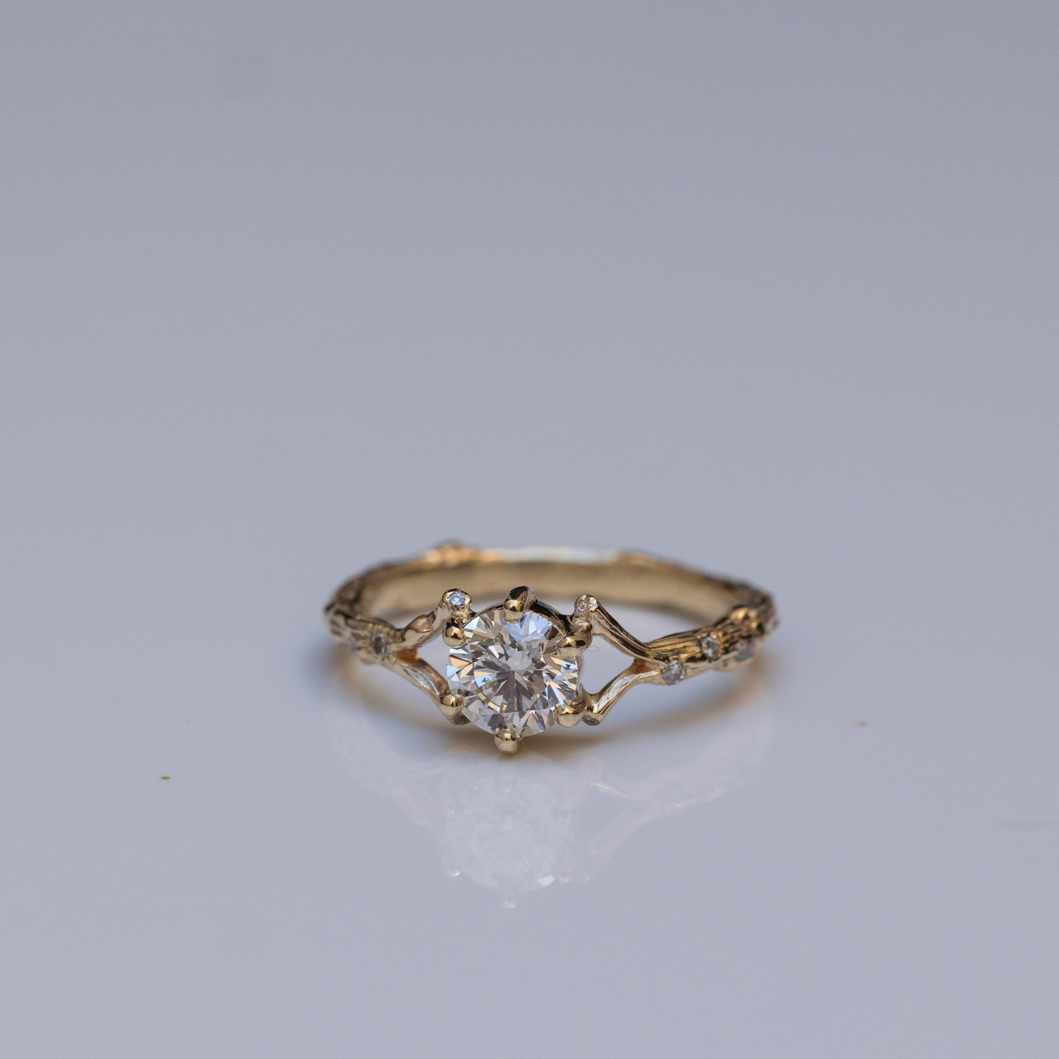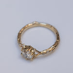 This is a 14K spreading branch ring with a high-quality 0.50ct white diamond in the center, accompanied by tiny white diamonds scattered from the side in the thick mass of the branch and its edges.